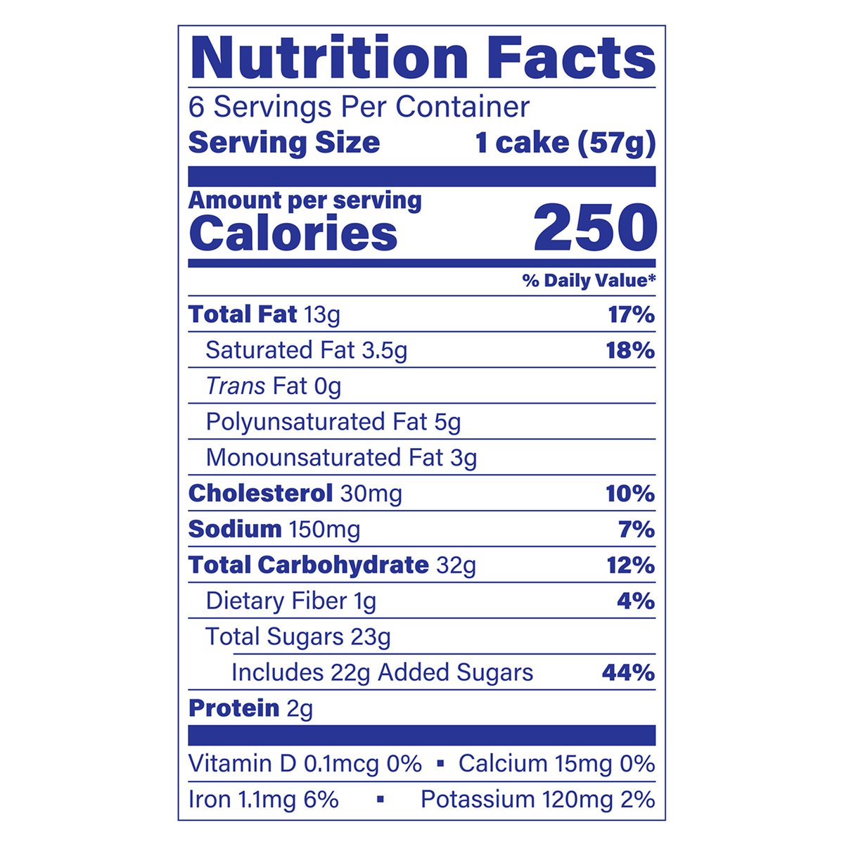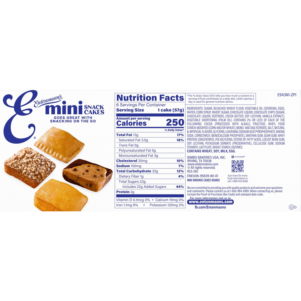 Per 1 Cake Serving: 250 calories; 3.5 g sat fat (18% DV); 150 mg sodium (7% DV); 22 g added sugars (44% DV). 6 individually wrapped for freshness. Goes great with snacking on the go. www.entenmanns.com. SmartLabel: Scan for more information or call 1-800-432-8286. fb.com/Entenmanns. We are committed providing you with quality products and welcome your questions and comments. Please contact us at 1-800-984-0989. When contacting us, please include the Proof-of-Purchase (Bar Code) and stamped date code. For more information visit us at: www.entenmanns.com.