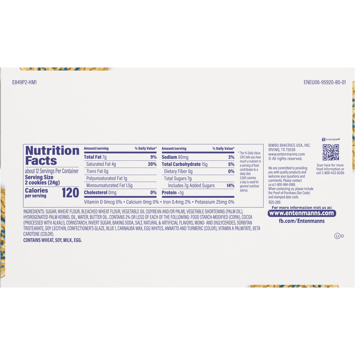 In 1898 the Entenmann Family promised to deliver only quality baked goods to their customers. Today, we reaffirm that promise and honor our traditions. - William Entenmann. www.entenmanns.com. SmartLabel: Scan for more food information or call 1-800-432-8266. fb.com/Entenmanns. We are committed to providing you with quality products and welcome your questions and comments. Please contact us at 1-800-984-0989. When contacting us, please include the Proof-of-Purchase (Bar Code) and stamped date code. For more information visit us at: www.entenmanns.com.
