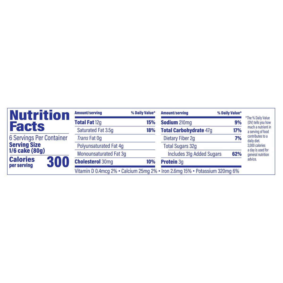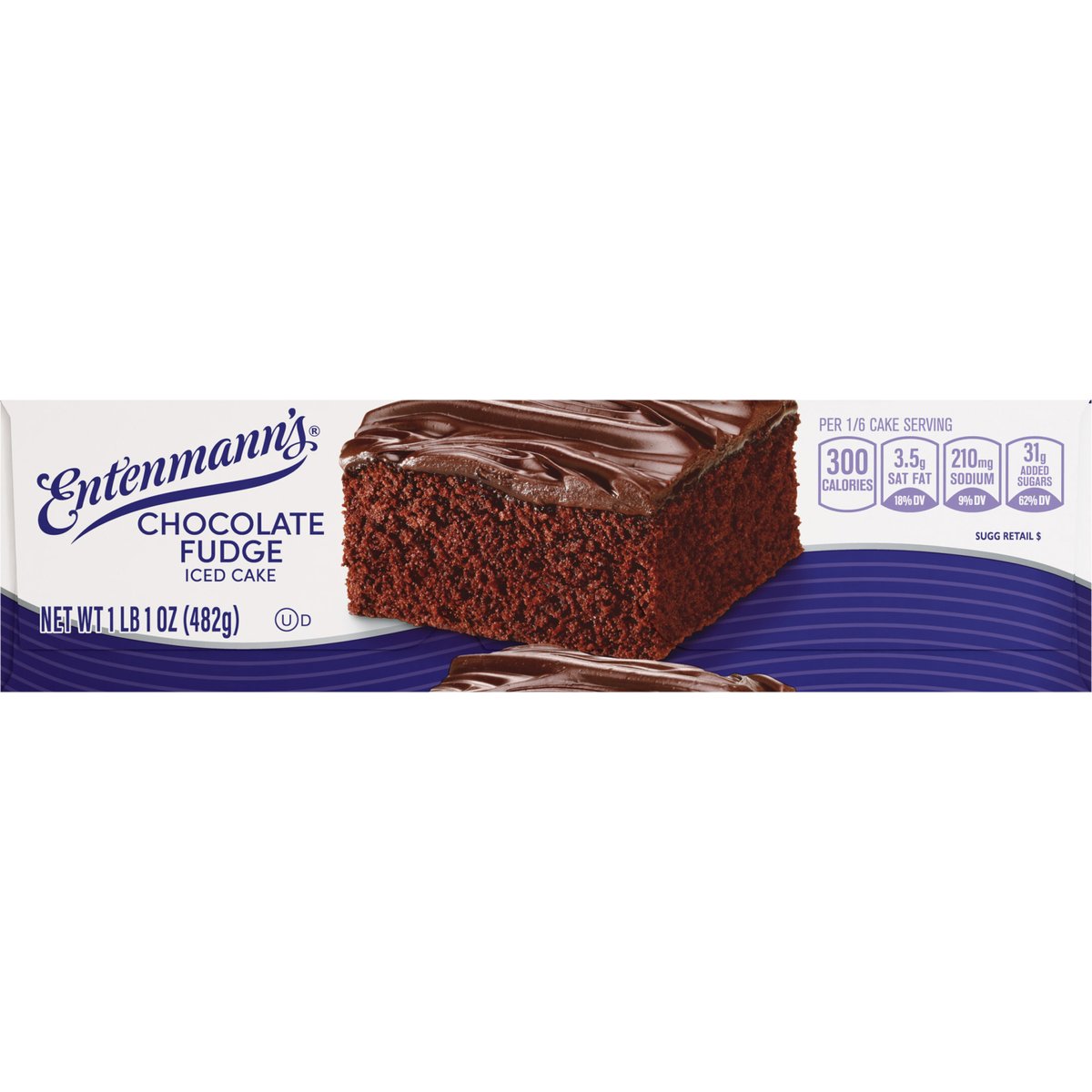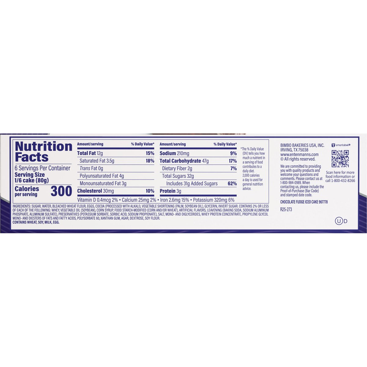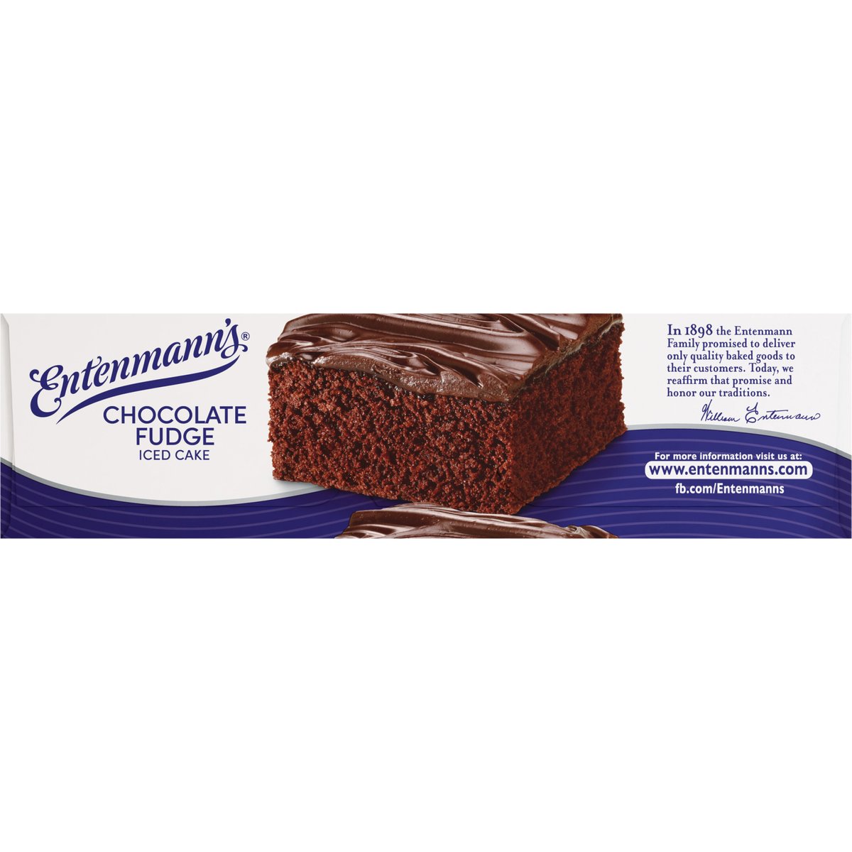 Per 1/6 Cake Serving: 300 calories; 3.5 g sat fat (18% DV); 210 mg sodium (9% DV); 31 g added sugars (62% DV). In 1898 the Entenmann Family promised to deliver only quality baked goods to their customers. Today, we reaffirm that promise and honor our traditions. - William Entenmann. www.entenmanns.com. SmartLabel: Scan for more food information or call 1-800-432-8266. fb.com/Entenmanns. For more information visit us at: www.entenmanns.com. We are committed to providing you with quality products and welcome your questions and comments. Please contact us at 1-800-984-0989. When contacting us, please include the Proof-of-Purchase (Bar Code) and stamped date code.