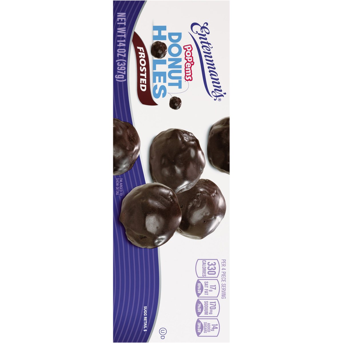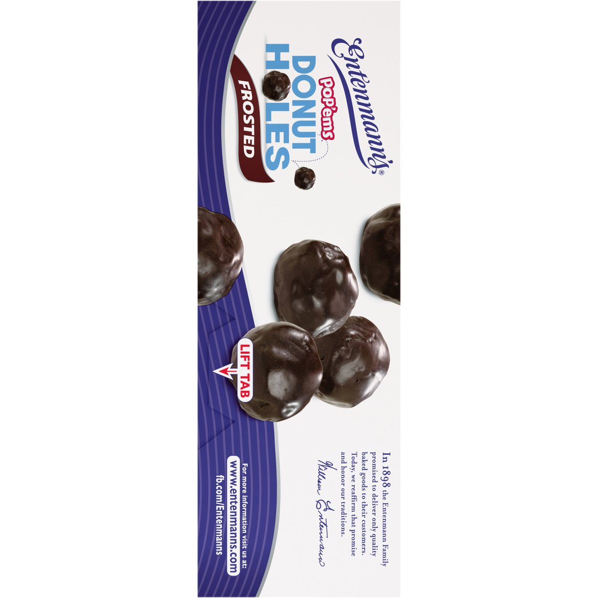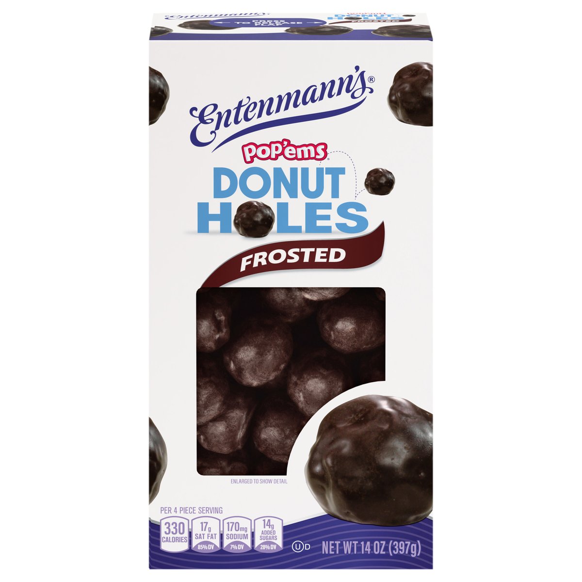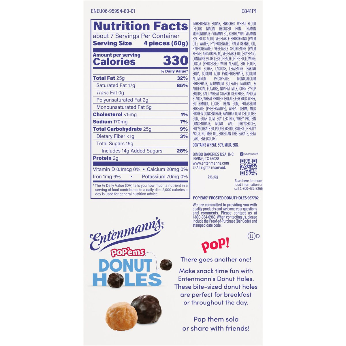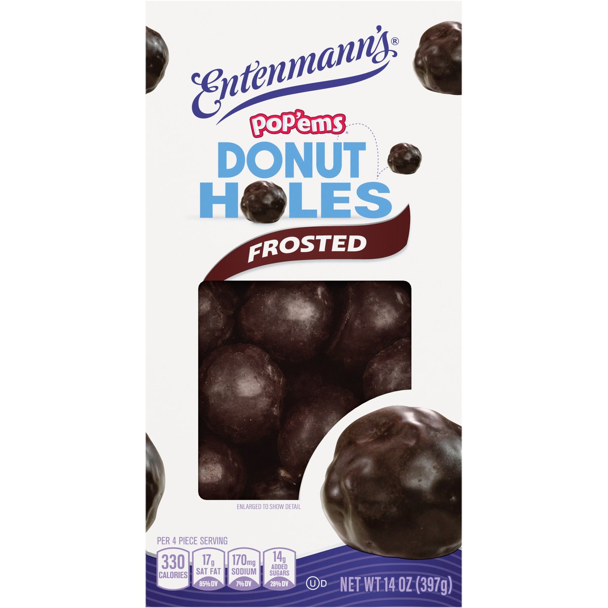 Per 4 Piece Serving: 330 calories; 17 g sat fat (85% DV); 170 mg sodium (7% DV); 14 g added sugars (28% DV). Pop'ems. Donut holes. Pop! There goes another one! Make snack time fun with Entenmann's Donut Holes. These bite-sized donut holes are perfect for breakfast or throughout the day. Pop them solo or share with friends! In 1898 the Entenmann Family promised to deliver only quality baked goods to their customers. Today, we reaffirm that promise and honor our traditions. William Entenmanns. www.entenmanns.com. SmartLabel: Scan for more food information or call 1-800-432-8266. fb.com/Entenmanns. We are committed to providing you with quality products and welcome your questions and comments. Please contact us at 1-800-984-0989. When contacting us, please include the Proof-of-Purchase (Bar Code) and stamped date code. For more information visit us at: www.entenmanns.com.