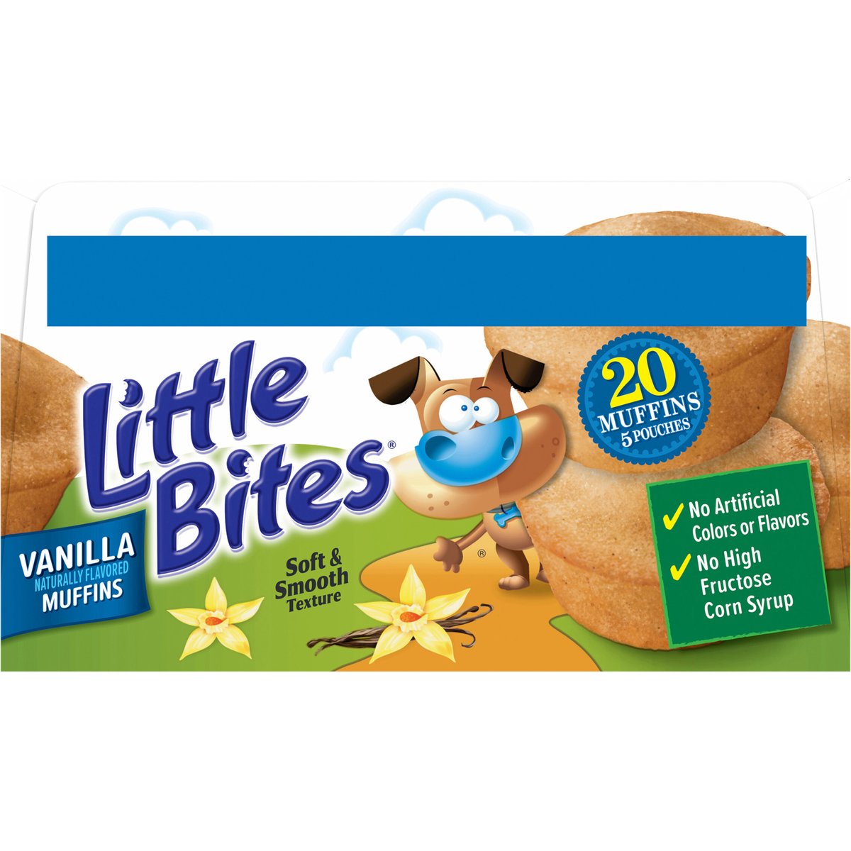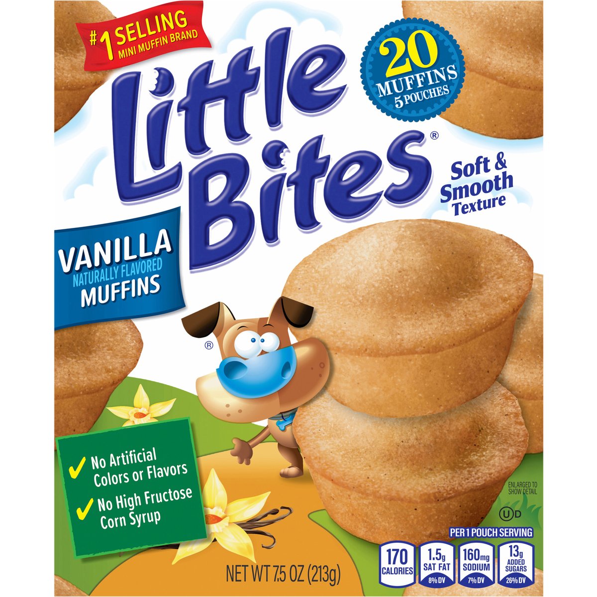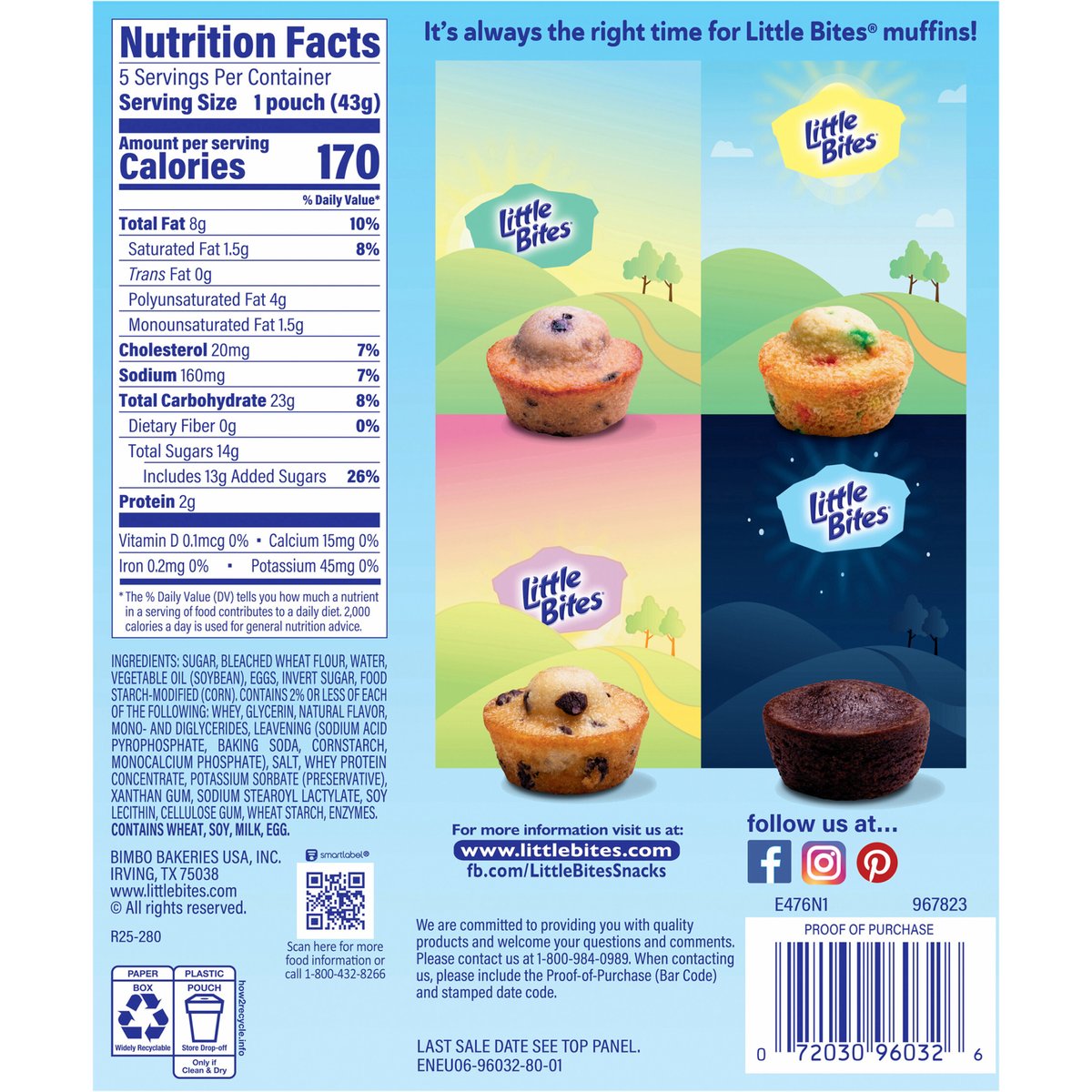 Naturally flavored. Per 1 Pouch Serving: 170 calories; 1.5 g sat fat (8% DV); 160 mg sodium (7% DV); 13 g added sugars (26% DV). #1 selling mini muffin brand. Soft & smooth texture. No artificial colors or flavors. No high fructose corn syrup. It's always the right time for Little Bites muffins! Last sale date see top panel. www.littlebites.com. how2recycle.info. SmartLabel: Scan for more food information or call 1-800-432-8266. fb.com/LittleBitesSnacks. Follow us at...Facebook. Instagram. Pinterest. For more information visit us at: www.littlebites.com. We are committed to providing you with quality products and welcome your questions and comments. Please contact us at 1-800-984-0989. When contacting us, please include the Proof-of-Purchase (Bar Code) and stamped date code.