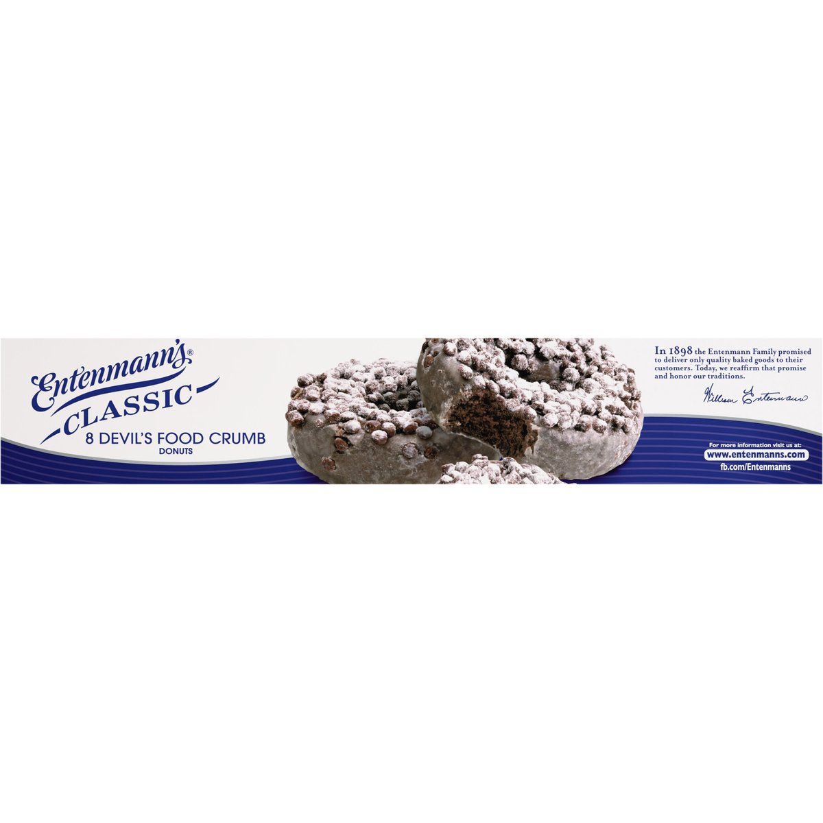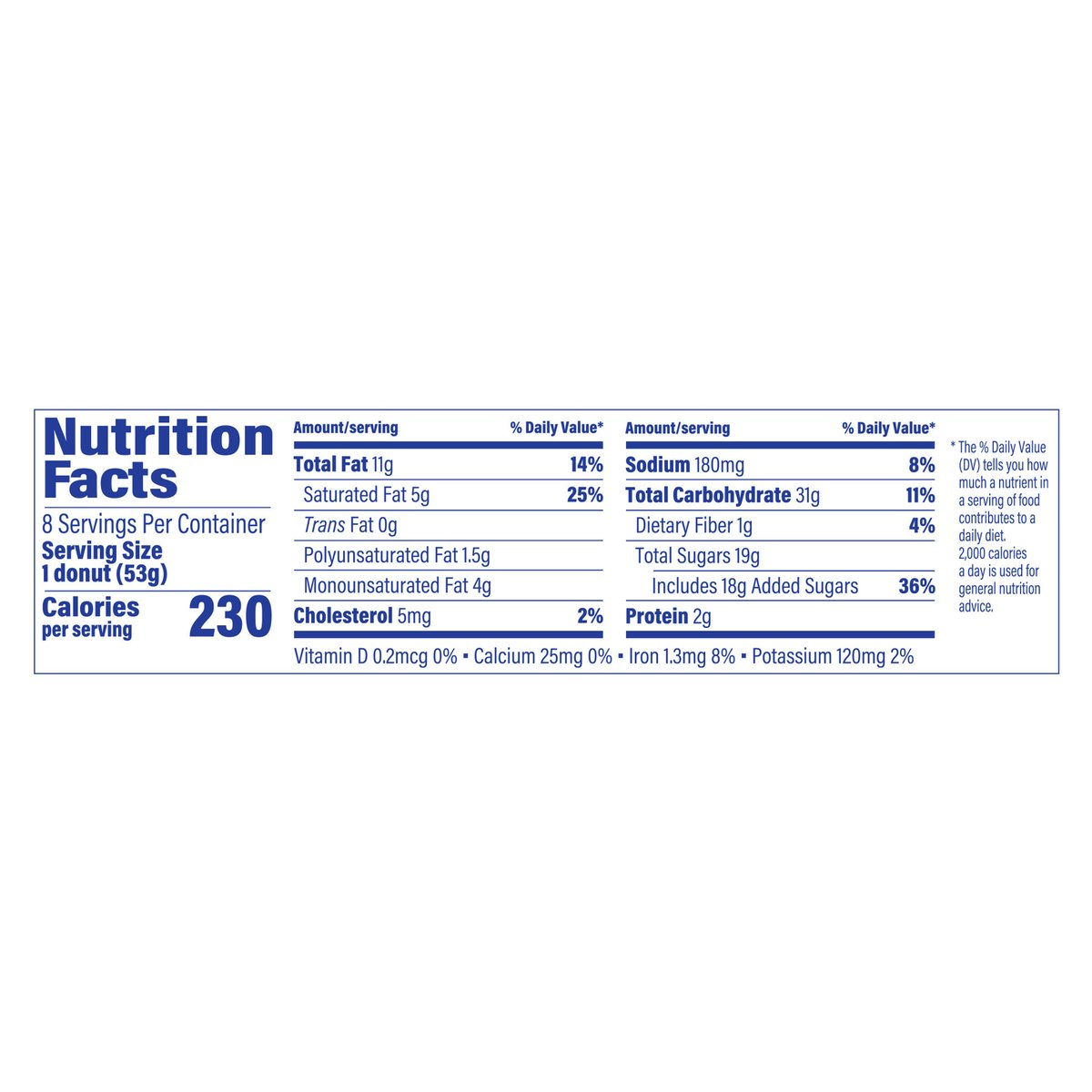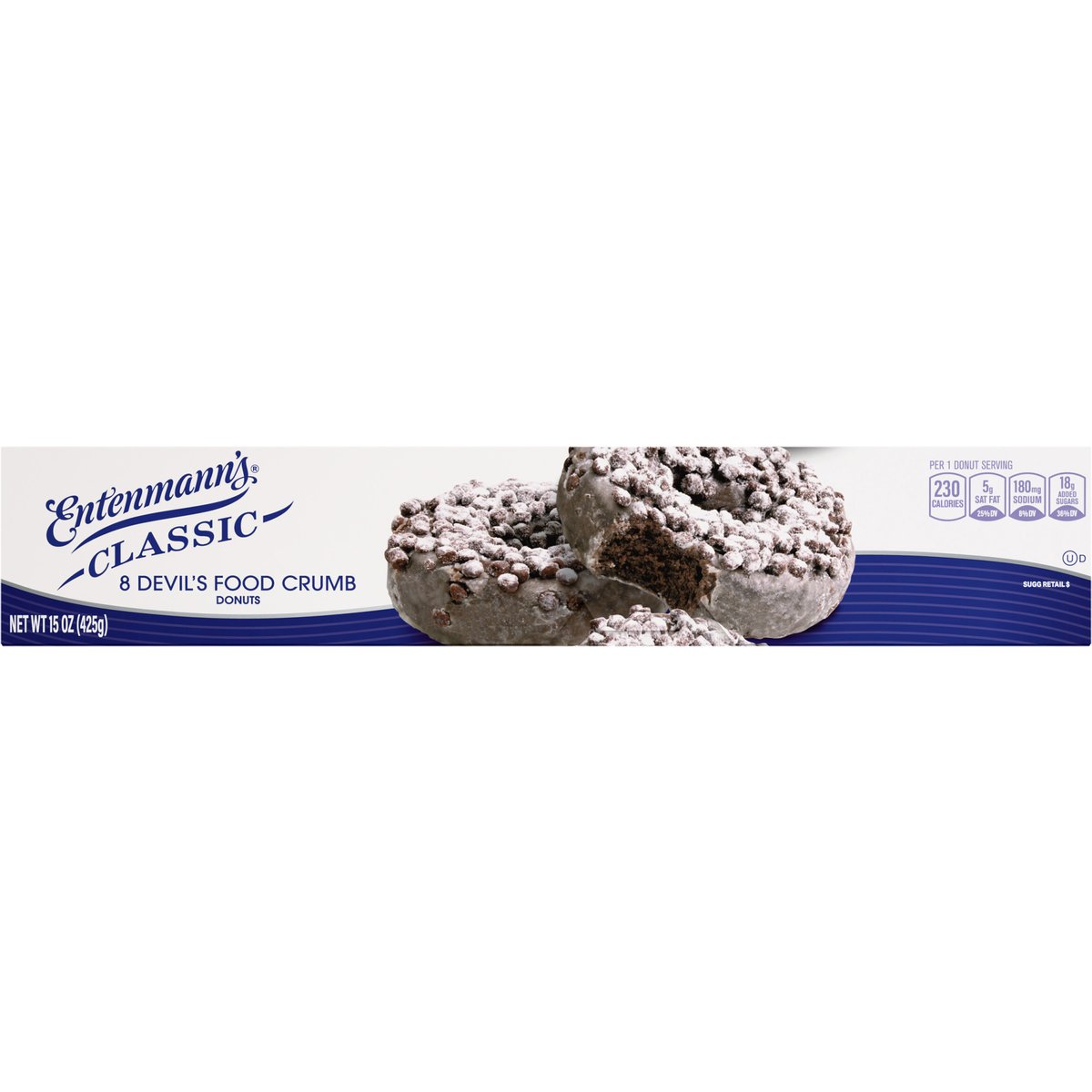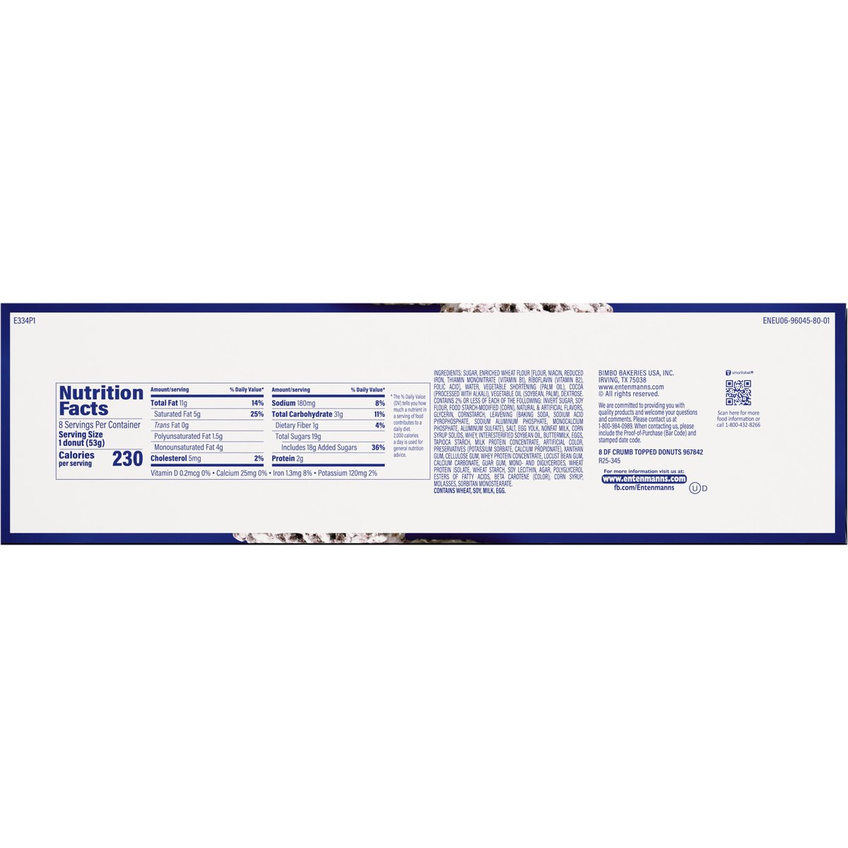 Per 1 Donut Serving: 230 calories; 5 g sat fat (25% DV); 180 mg sodium (8% DV); 18 g added sugars (36% DV). In 1898 the Entenmann Family promised to deliver only quality baked goods to their customers. Today, we reaffirm that promise and honor our traditions. - William Entenmann. www.entenmanns.com. SmartLabel: Scan for more food information or call 1-800-432-8266. fb.com/Entenmanns. We are committed to providing you with quality products and welcome your questions and comments. Please contact us at 1-800-984-0989. When contacting us, please include the Proof-of-Purchase (Bar Code) and stamped date code. For more information visit us at: www.entenmanns.com.