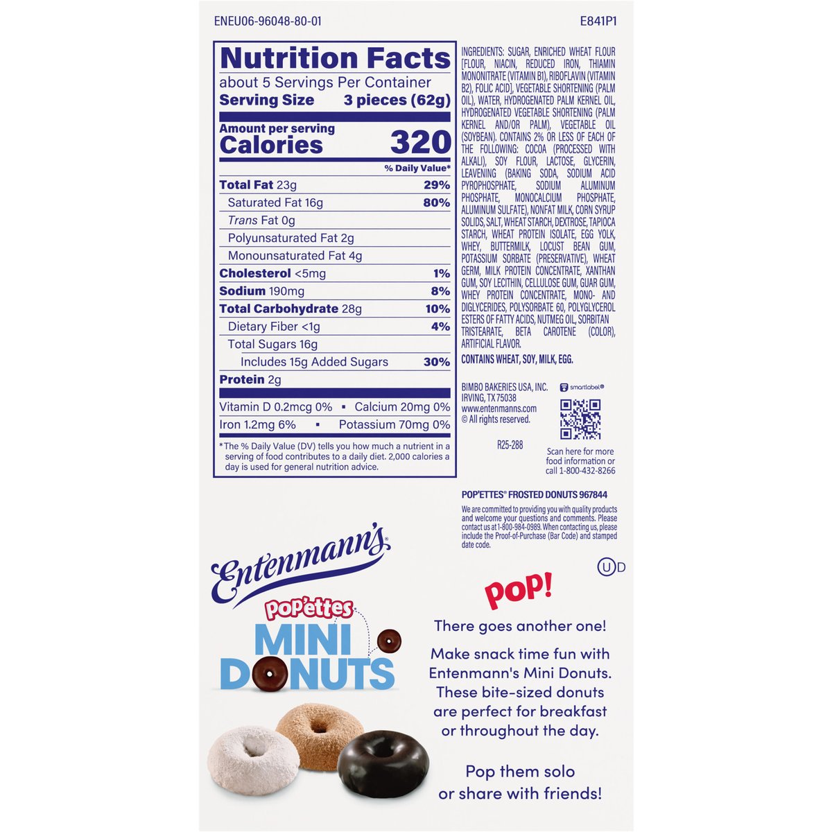Per 3 Piece Serving: 320 calories; 16 g sat fat (80% DV); 190 mg sodium (8% DV); 15 g added sugars (30% DV). Pop! There goes another one! Make snack time fun with Entenmann's Mini Donuts. These bite-sized donuts are perfect for breakfast or throughout the day. Pop them solo or share with friends! In 1898 the Entenmann Family promised to deliver only quality baked goods to their customers. Today, we reaffirm that promise and honor our traditions. William Entenmanns. www.entenmanns.com. SmartLabel: Scan for more food information or call 1-800-432-8266. fb.com/Entenmanns. We are committed to providing you with quality products and welcome your questions and comments. Please contact us at 1-800-984-0989. When contacting us, please include the Proof-of-Purchase (Bar Code) and stamped date code. For more information visit us at: www.entenmanns.com.