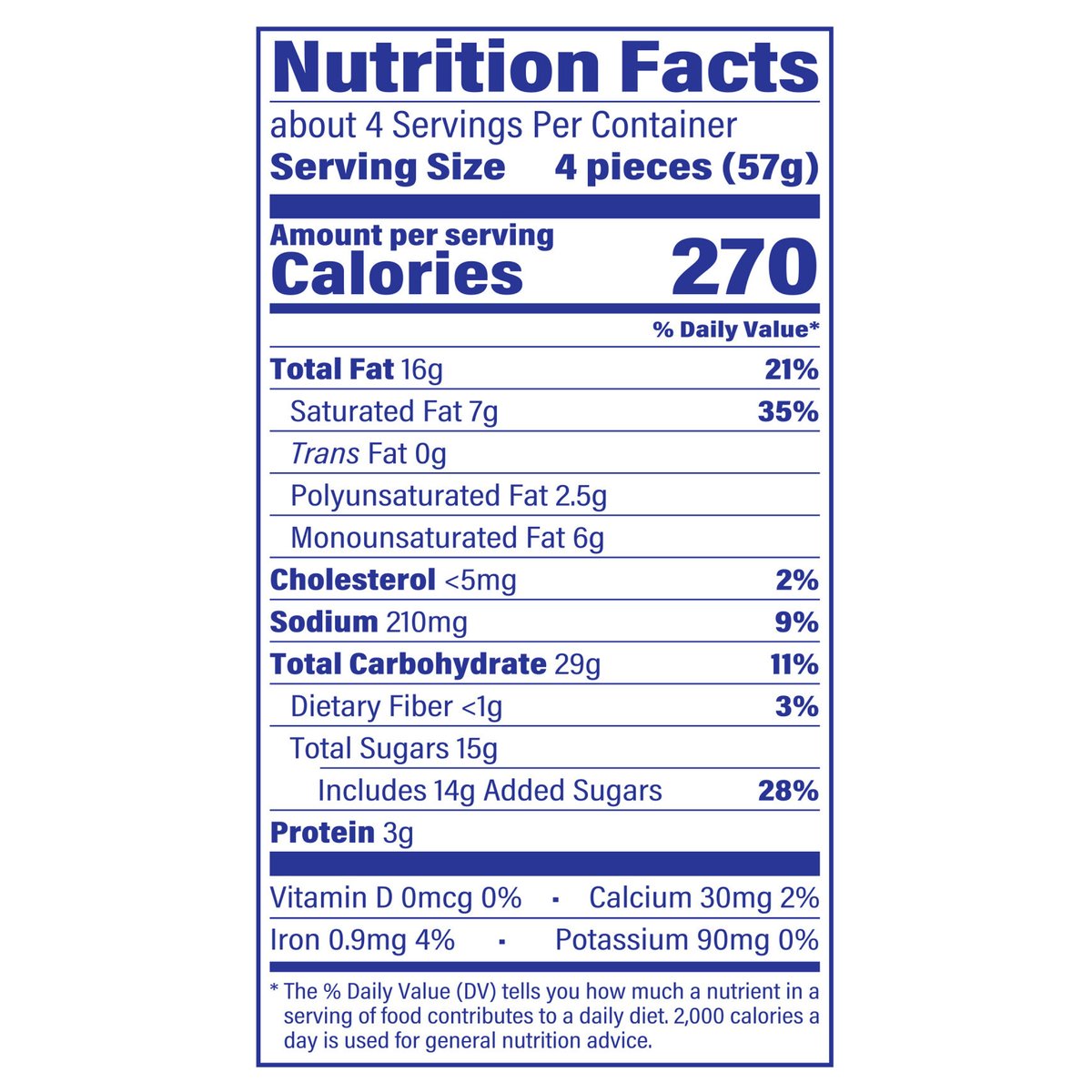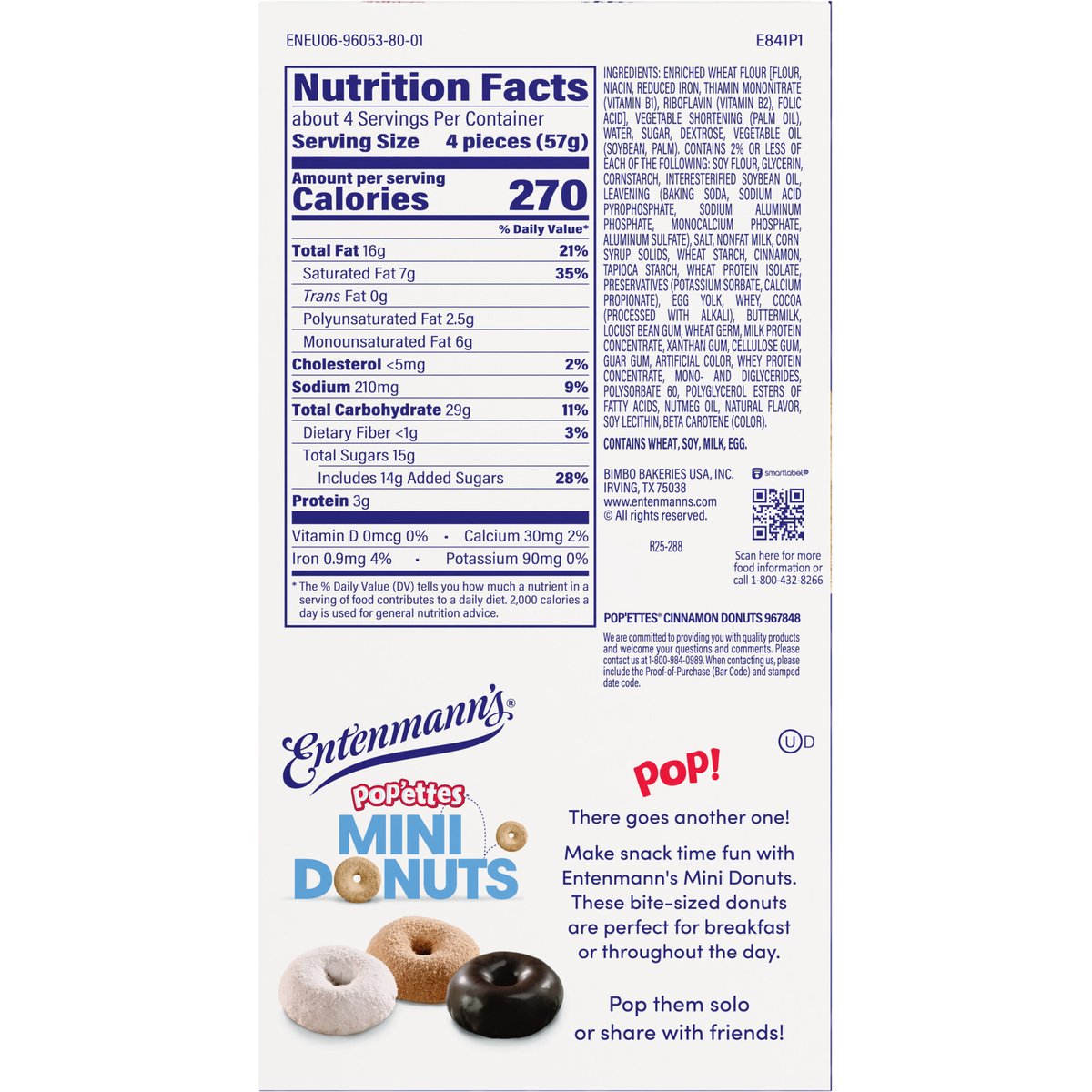 Per 4 Piece Serving: 270 calories; 7 g sat fat (35% DV); 210 mg sodium (9% DV); 14 g added sugars (28% DV). Pop! There goes another one! Make snack time fun with Entenmann's Mini Donuts. These bite-sized donuts are perfect for breakfast or throughout the day. Pop them solo or share with friends! In 1898 the Entenmann Family promised to deliver only quality baked goods to their customers. Today, we reaffirm that promise and honor our traditions. - William Entenmanns. www.entenmanns.com. SmartLabel: Scan for more food information or call 1-800-432-8266. fb.com/Entenmanns. We are committed to providing you with quality products and welcome your questions and comments. Please contact us at 1-800-984-0989. When contacting us, please include the Proof-of-Purchase (Bar Code) and stamped date code. For more information visit us at: www.entenmanns.com.