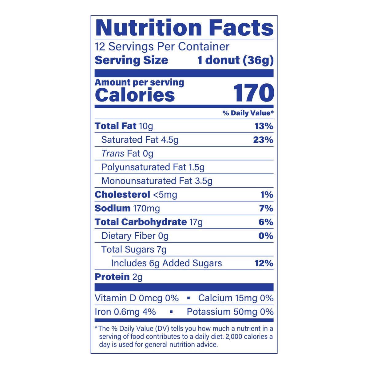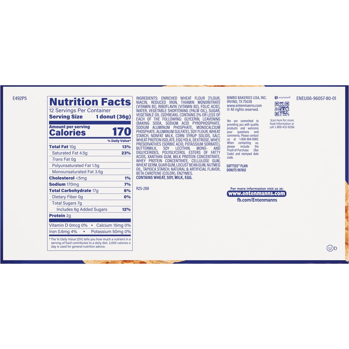 Per 1 Donut Serving: 170 calories; 4.5 g sat fat (23% DV); 170 mg sodium (7% DV); 6 g added sugars (12% DV). In 1898 the Entenmann Family promised to deliver only quality baked goods to their customers. Today, we reaffirm that promise and honor our traditions. - William Entenmann. www.entenmanns.com. SmartLabel: Scan for more food information or call 1-800-432-8266. fb.com/Entenmanns. We are committed to providing you with quality products and welcome your questions and comments. Please contact us at 1-800-984-0989. When contacting us, please include the Proof-of-Purchase (Bar Code) and stamped date code. For more information visit us at: www.entenmanns.com.