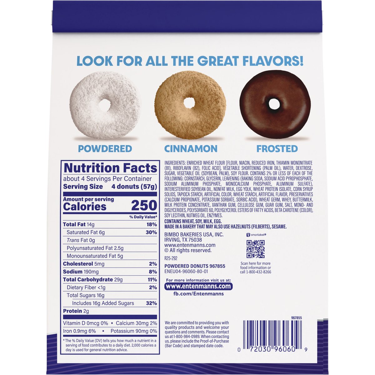 Per 4 Donut Serving: 250 calories; 6 g sat fat (30% DV); 190 mg sodium (8% DV); 16 g added sugars (32% DV). www.entenmanns.com. SmartLabel: Scan for more food information or call 1-800-432-8266. fb.com/Entenmanns. We are committed to providing you with quality products and welcome your questions and comments. Please contact us at 1-800-984-0989. When contacting us, please include the Proof-of-Purchase (Bar Code) and stamped date code. For more information visit us at: www.entenmanns.com. Look for all the great flavors! Powdered; Cinnamon; Frosted.