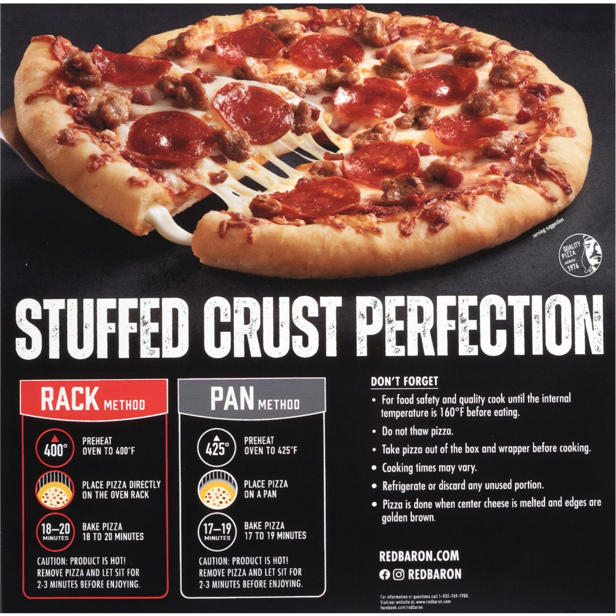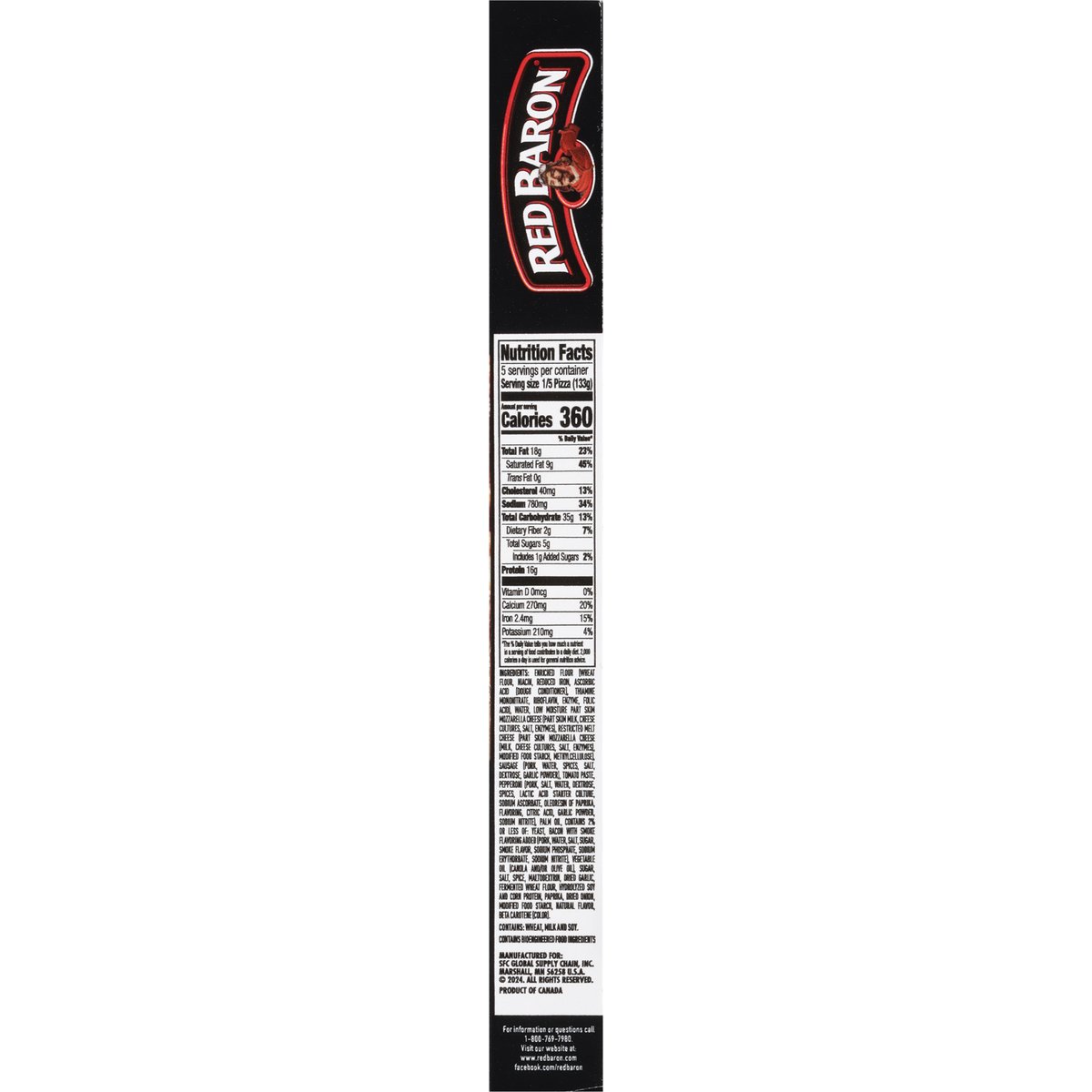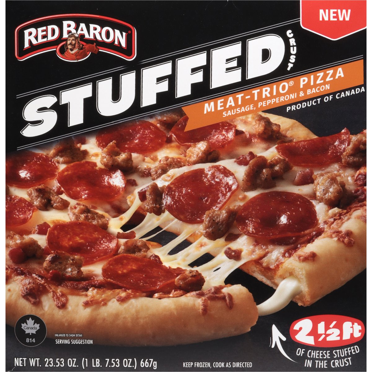 Sausage, pepperoni & bacon. Contains bioengineered food ingredients. New. 2-1/2 ft of cheese stuffed in the crust. Quality pizza since 1976. Stuffed crust perfection. www.redbaron.com. Facebook. Instagram redbaron. facebook.com/redbaron. For information or questions call 1-800-769-7980. Visit our website at: www.redbaron.com. Product of Canada.