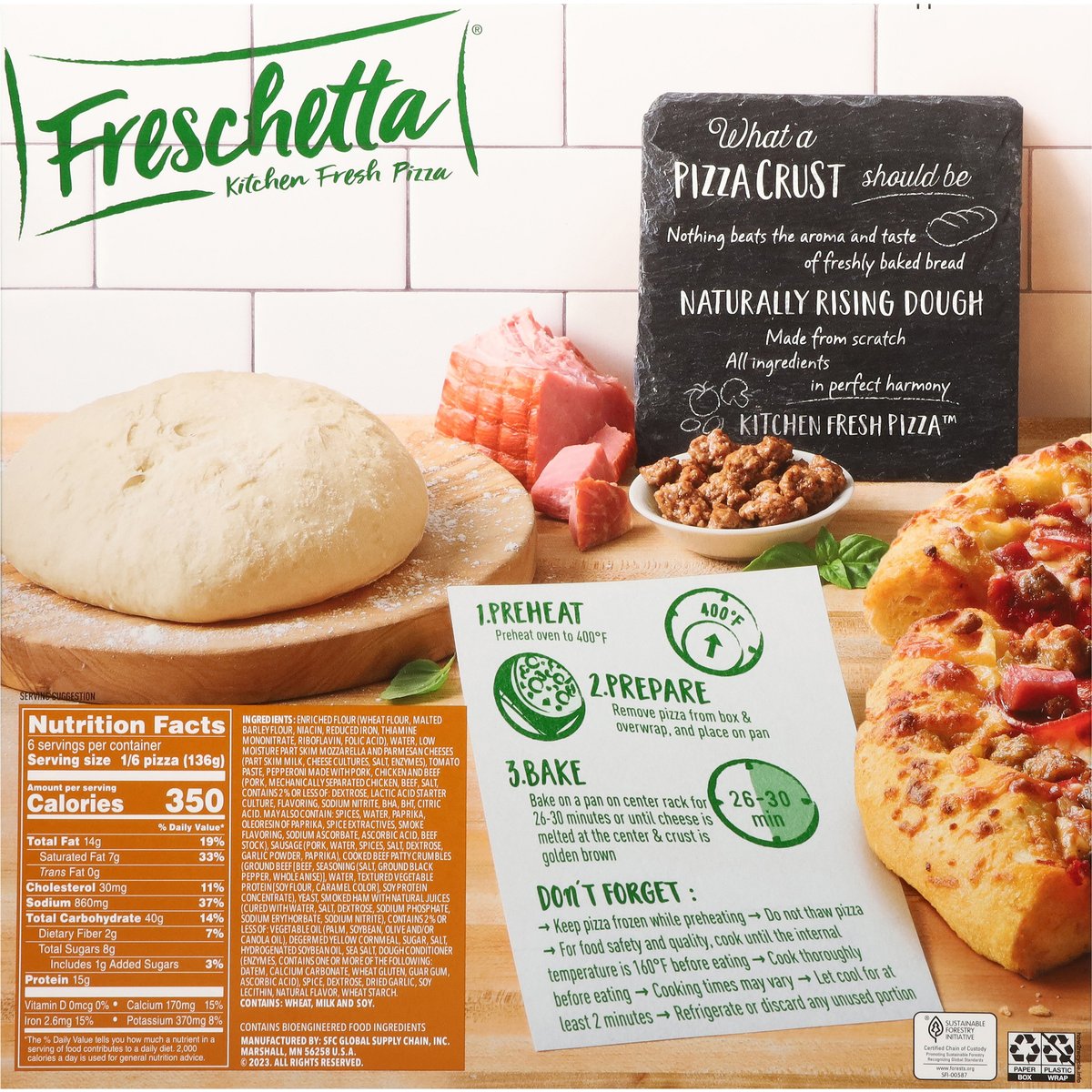 Pepperoni, sausage, ground beef & ham. Contains bioengineered food ingredients. Kitchen fresh pizza. Real. What a pizza crust should be. Nothing beats the aroma and taste of freshly baked bread. Naturally rising dough made from starch. All ingredients in perfect harmony. U.S. inspected and passed by Department of Agriculture. www.freschetta.com. how2recycle.info. Questions or comments? Please contact us at: 1-866-Freschetta (373-7243). Visit our website at: www.freschetta.com. Sustainable Forestry Initiative: Certified sourcing. www.sfiprogram.org.