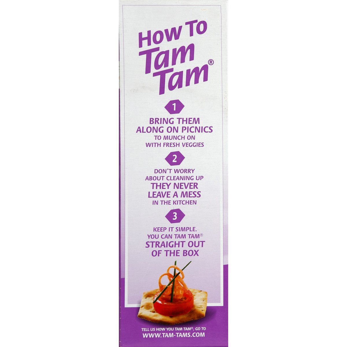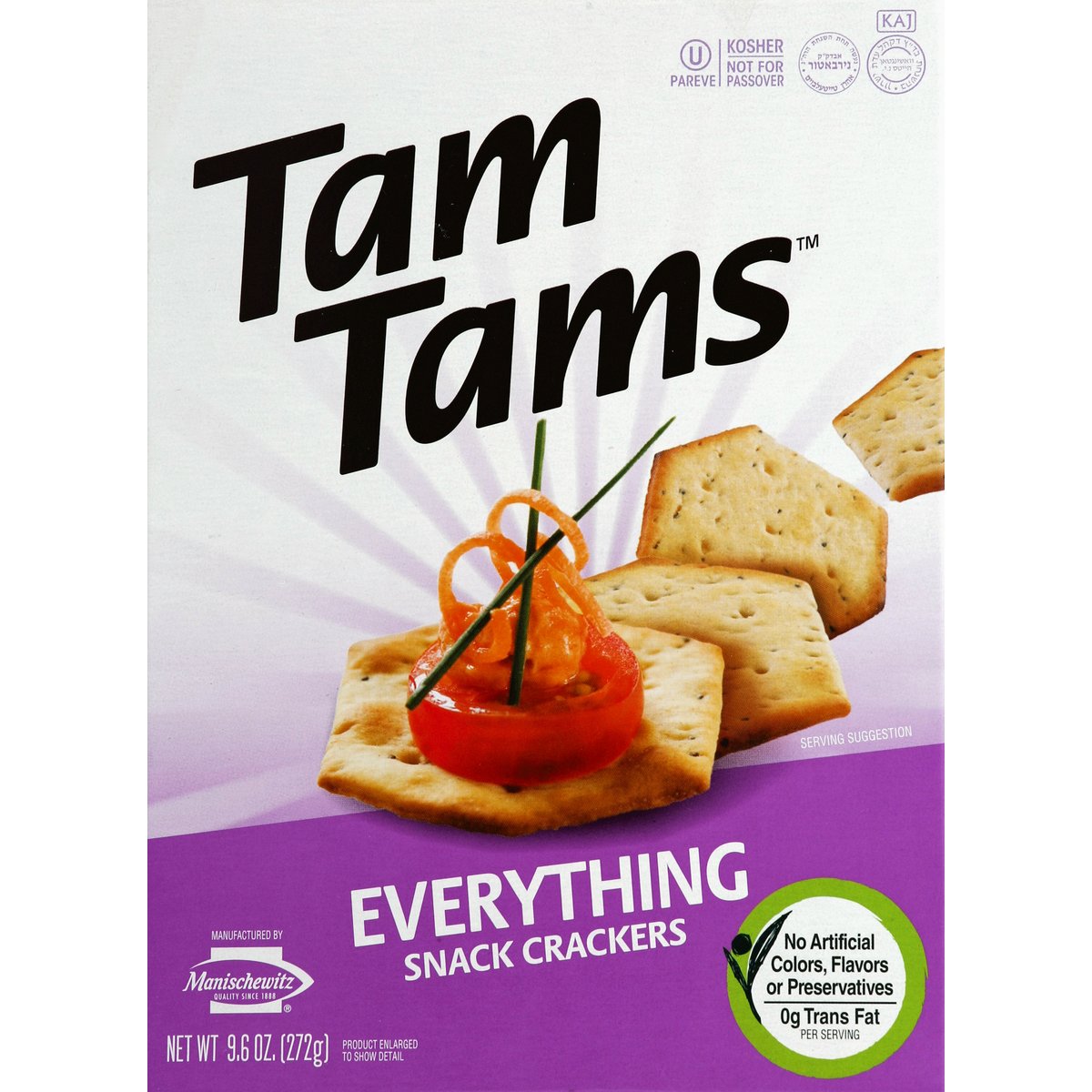 No artificial colors, flavors or preservatives. 0 g trans fat per serving. Not for Passover. Quality since 1888. This product is sold by weight not by volume. Some settling may have occurred during handling, but contains full weight. It's easy to learn how to Tam Tam and once you do, you'll be enjoying the best-tasting, six-sided crackers on earth. With their signature crunch, they are a delicious treat that contains no artificial colors, flavors or preservatives. You can Tam Tam any way you like: straight out of the box or with your favorite topping. Enjoy all of our classic flavors. Go ahead and Tam Tam! Tell us how you Tam Tam, go to www.tam-tams.com. www.manischewitz.com. This product is lactose free and vegetarian. Under the supervision of Rabbi Aron Teitelbaum, Nirbatur Rav and K'hal Adath Yeshurun. Yoshon flour. Printed on recycled paperboard. Product of USA.