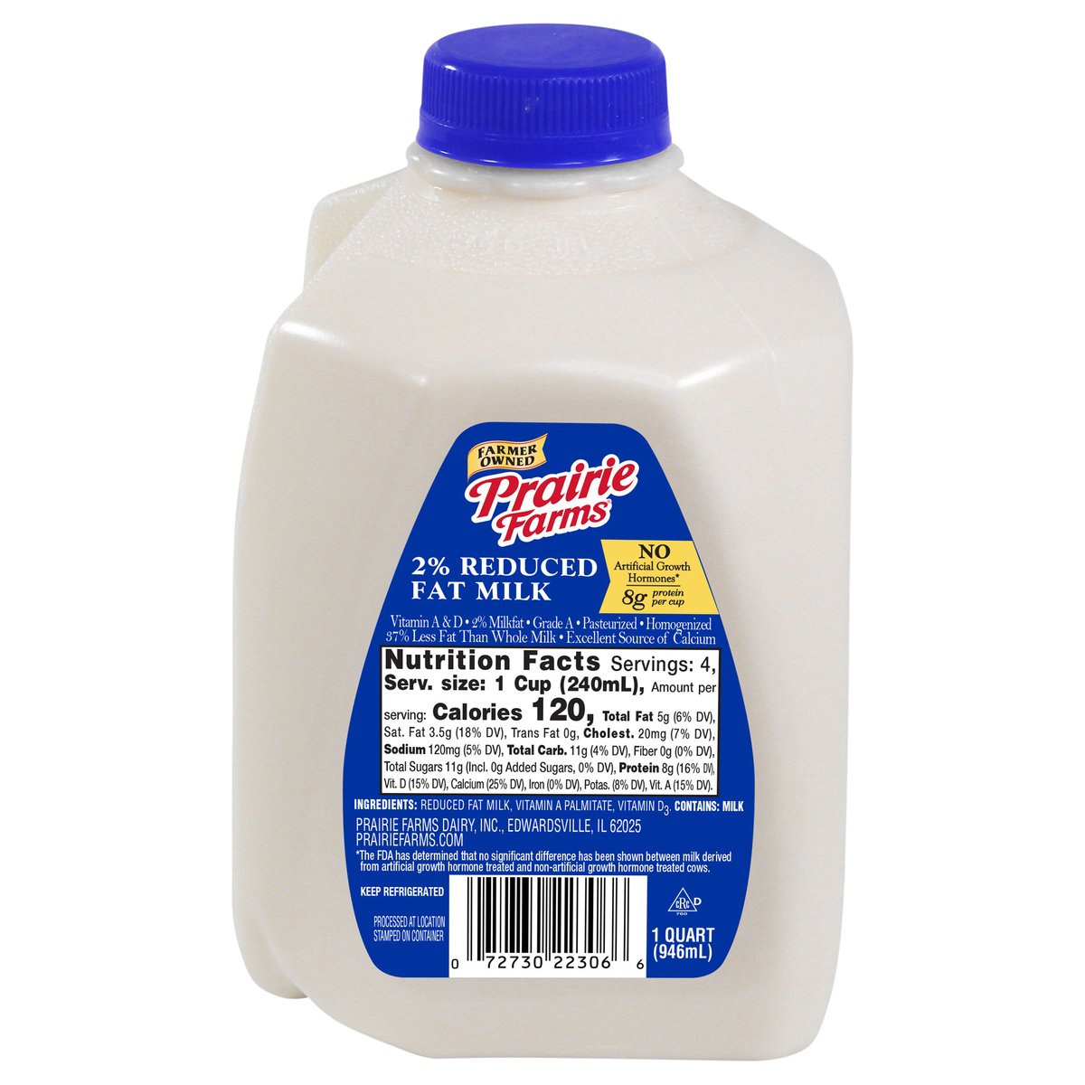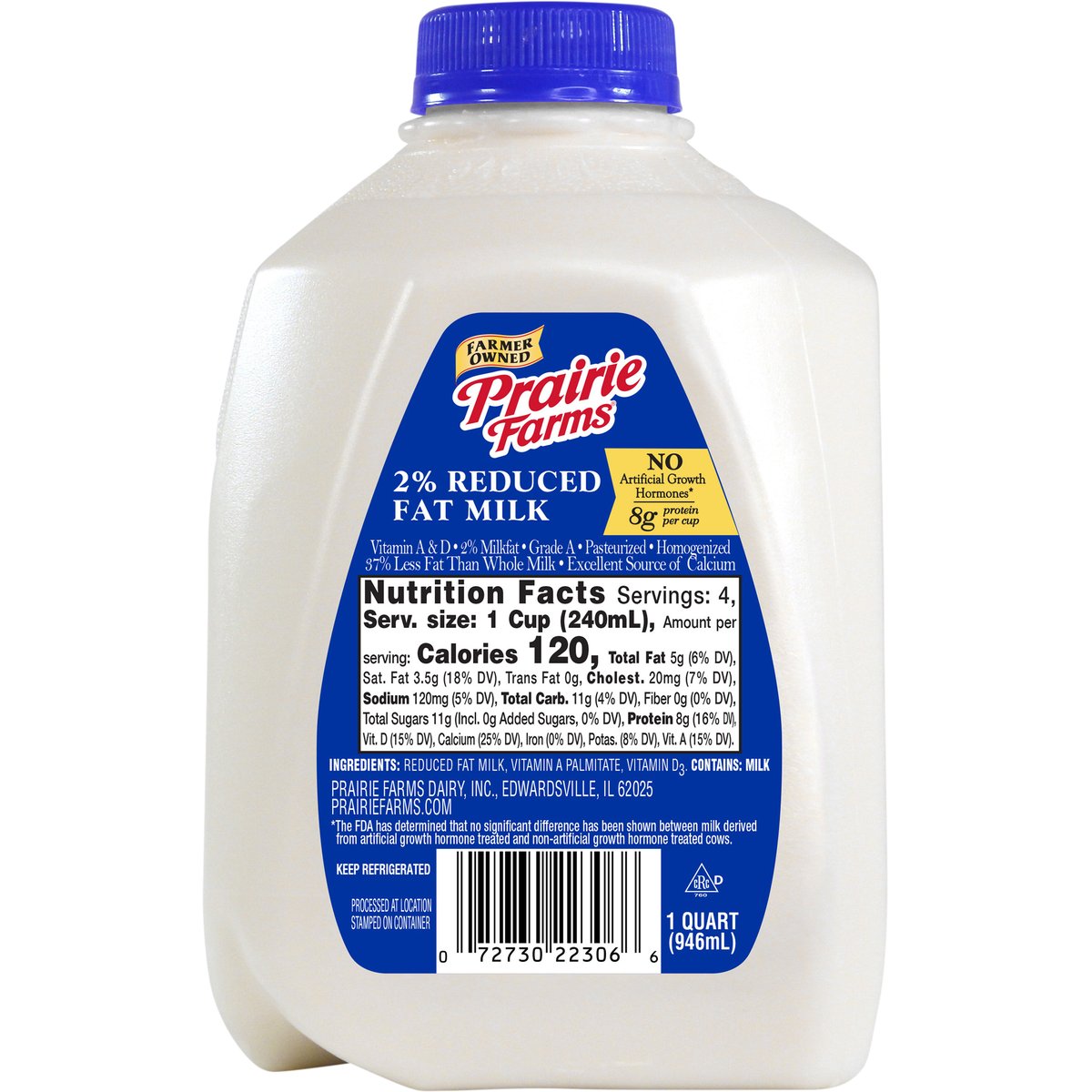 8 g protein per cup. 2% milkfat. Vitamin A & D. 37% less fat than whole milk. Excellent source of calcium. Farmer owned. Pasteurized. Homogenized. Processed at location stamped on container. No artificial growth hormones*. * The FDA has determined that no significant difference has been shown between milk derived from artificial growth hormone treated and non-artificial growth hormone treated cows. Grade A. prairiefarms.com.