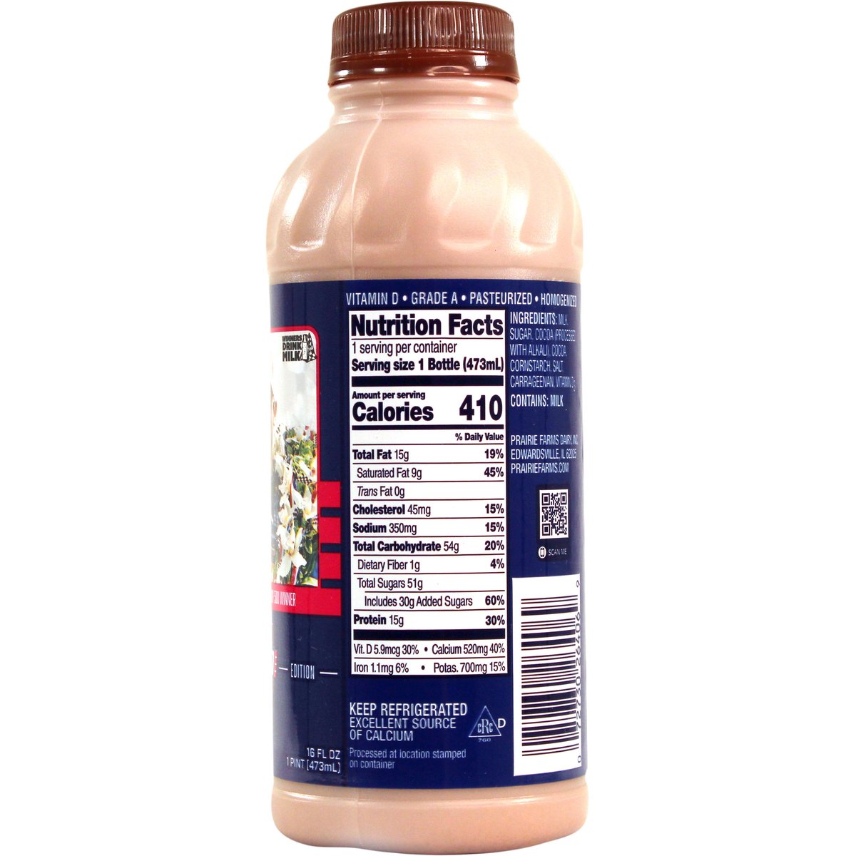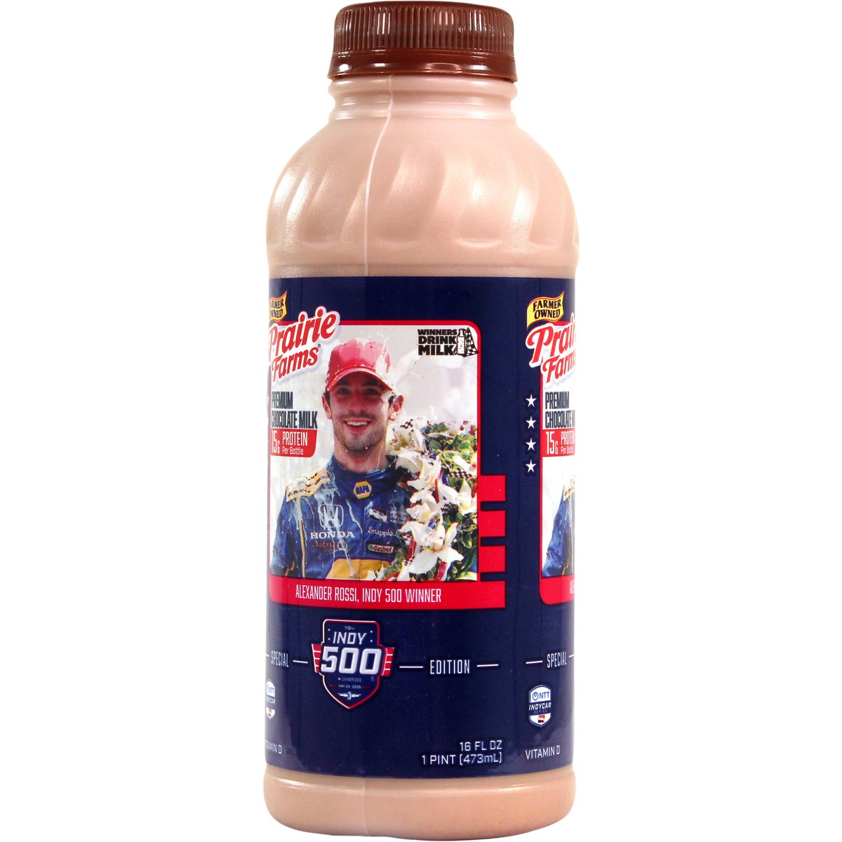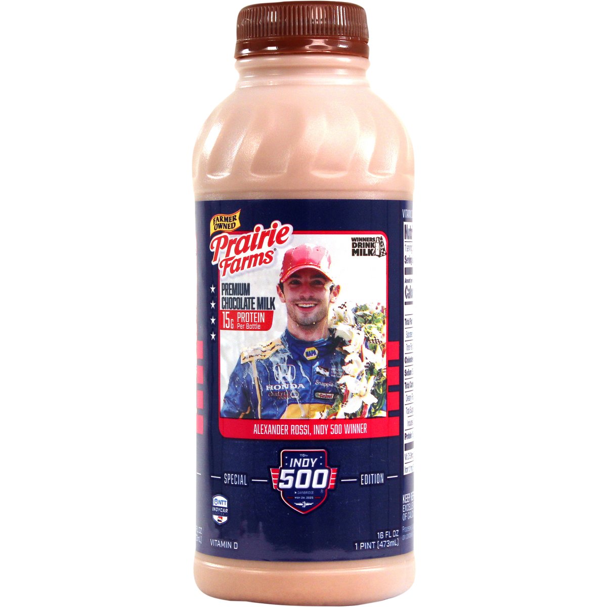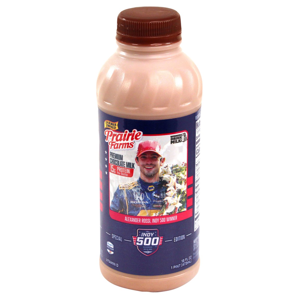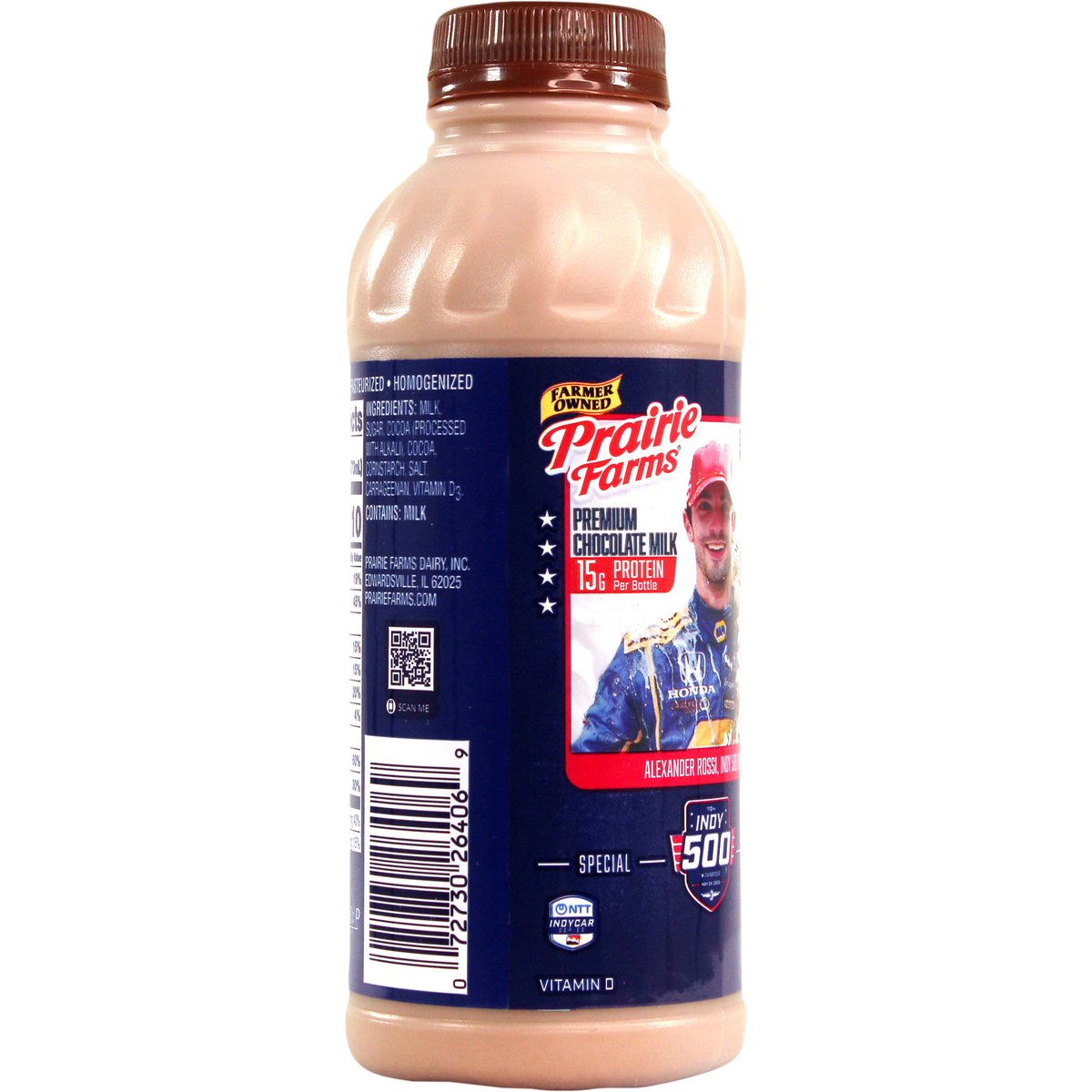 Special Edition 15 g protein per bottle. Vitamin D. Excellent source of calcium. Farmer owned. Winners drink milk. Alexander Rossi, Indy 500 Winner. NTT Indycar. Pasteurized. Homogenized. Processed at location stamped on container. Grade A. prairiefarms.com. Scan.