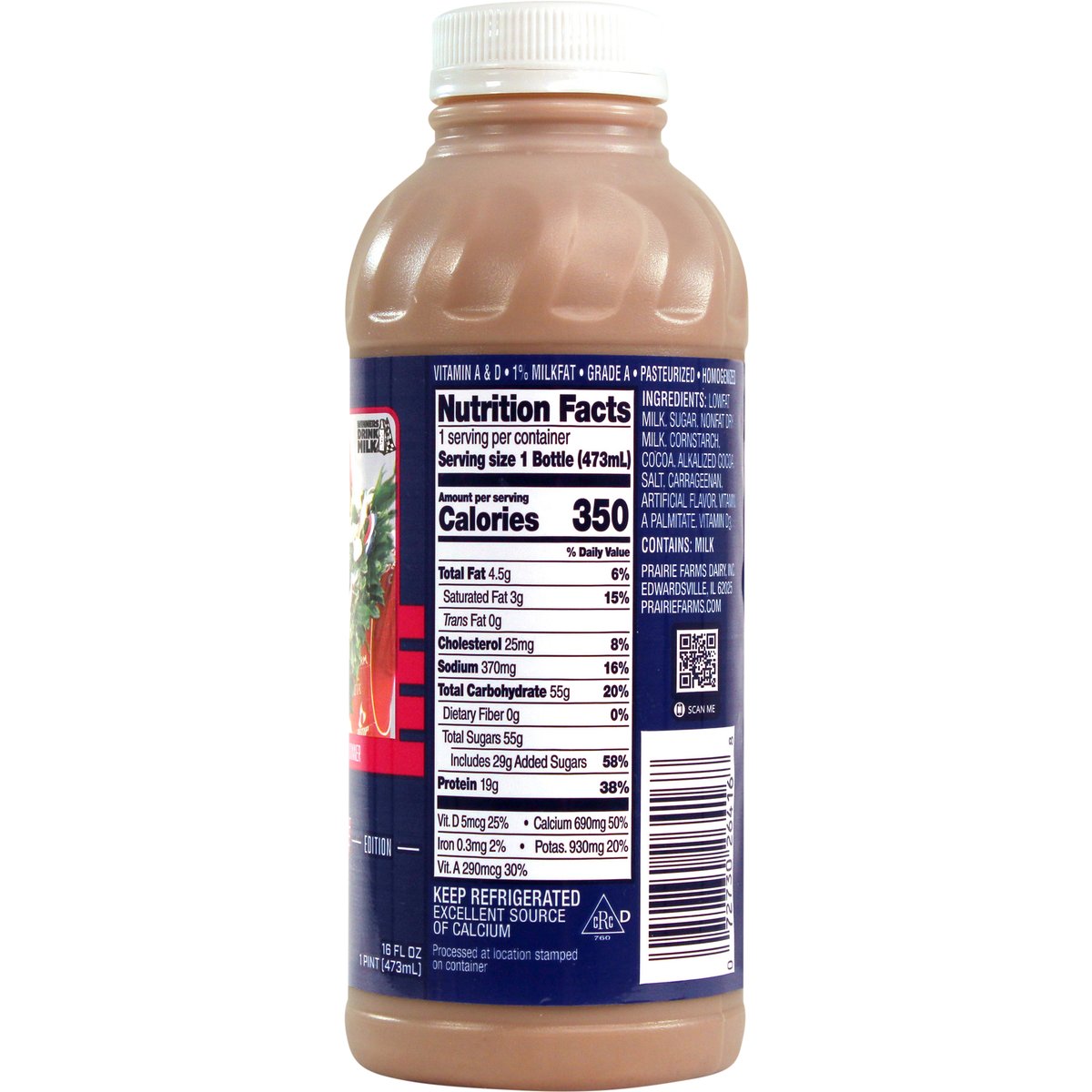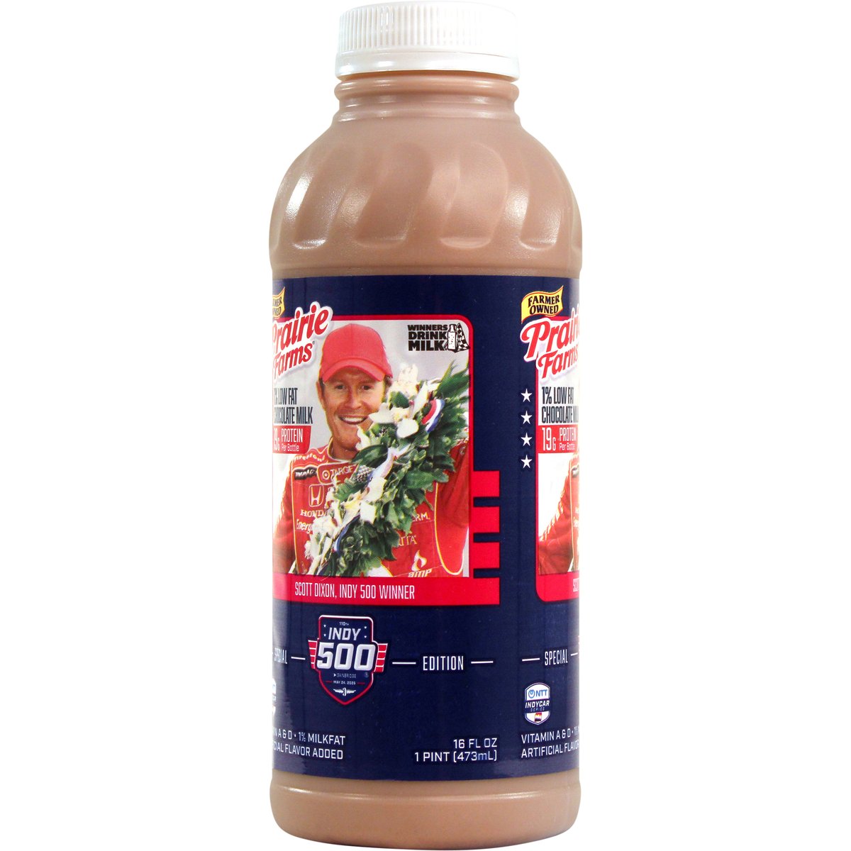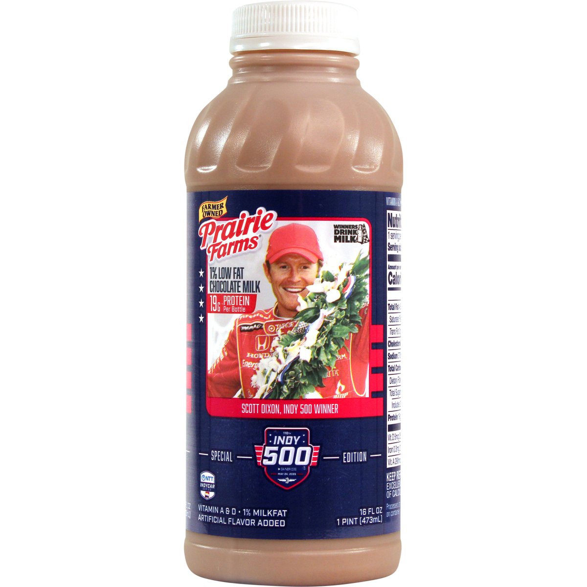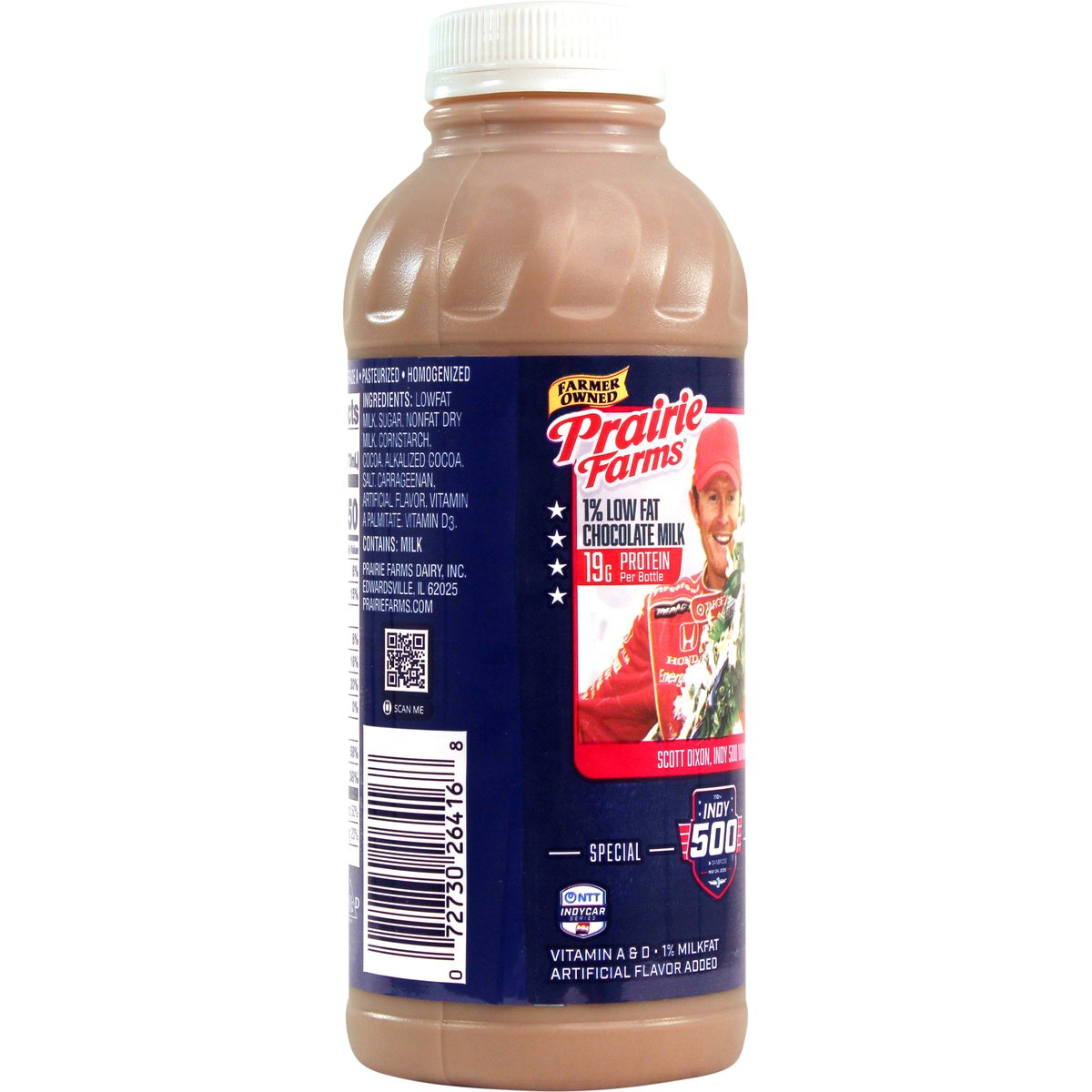 Special Edition Artificial flavor added. 19 g protein per bottle. 1% low fat. 1% milkfat. Vitamin A & D. Excellent source of calcium. Farmer owned. Winners drink milk. Scott Dixon, Indy 500 Winner. Pasteurized. Homogenized. Processed at location stamped on container. Grade A. prairiefarms.com. Scan me.