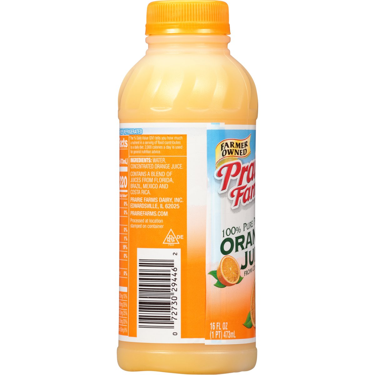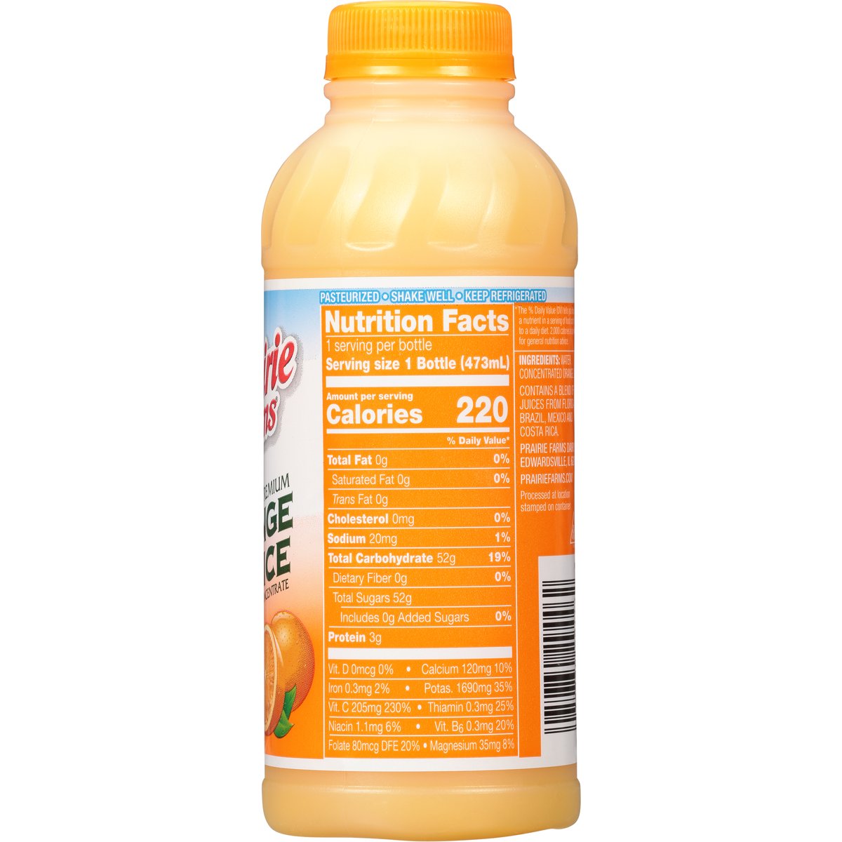 From concentrate. Farmer owned. Processed at location stamped on container. Pasteurized. prairiefarms.com. Contains a blend of juices from Florida, Brazil, Mexico, and Costa Rica.