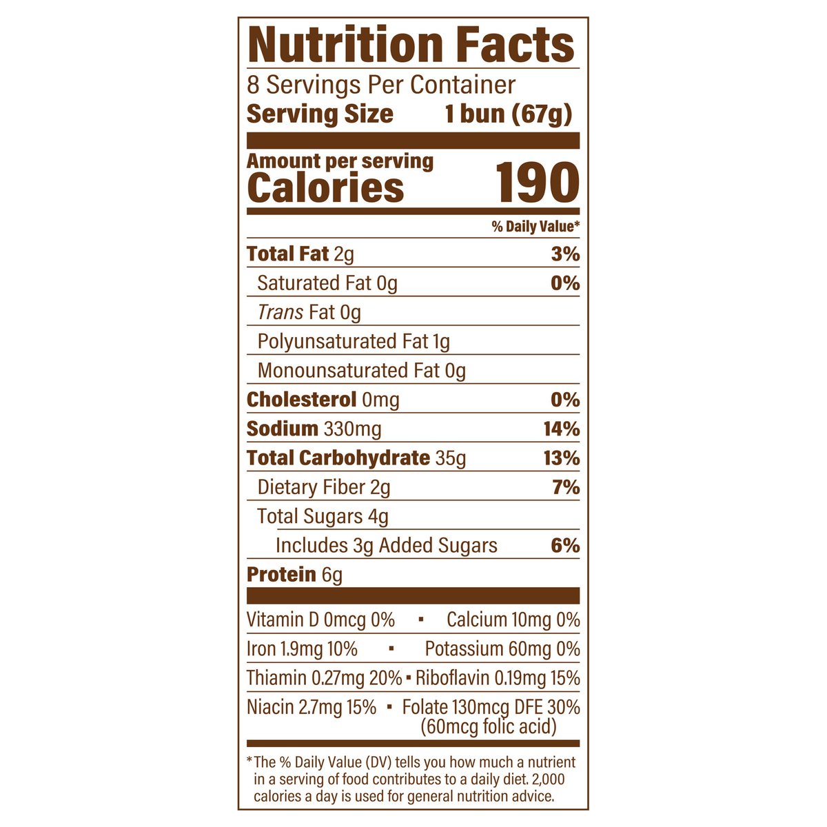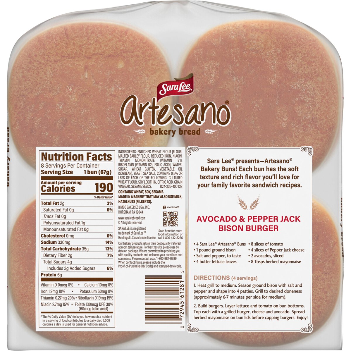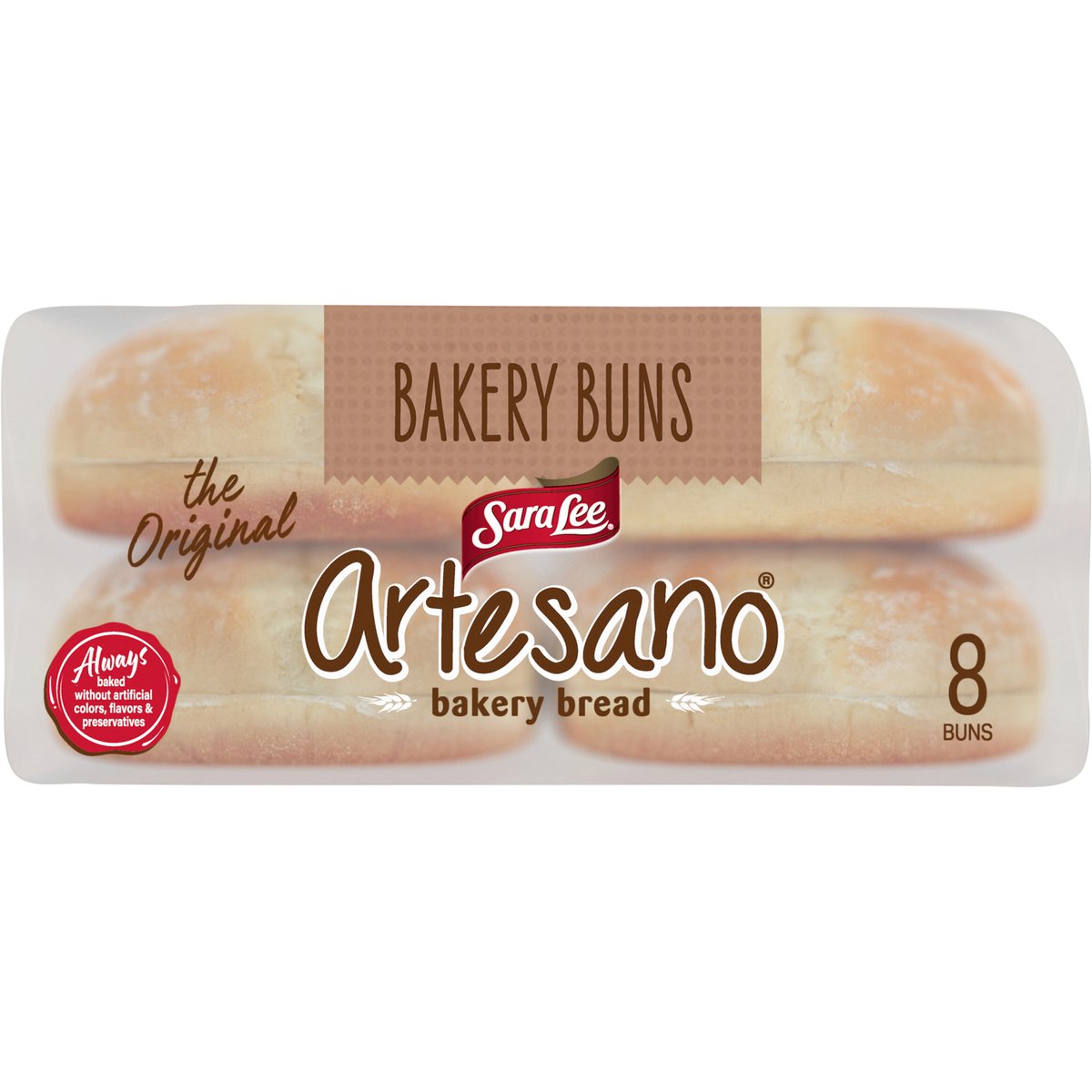 Always baked without artificial colors, flavors & preservatives. Per 1 Bun Serving: 190 calories; 0 g sat fat (0% DV); 330 mg sodium (14% DV); 3 g added sugars (6% DV). The original. Bakery bread. Sara Lee presents - Artesano Bakery Buns! Each bun has the soft texture and rich flavor you'll love for your family favorite sandwich recipes. www.saraleebread.com. how2recycle.info. SmartLabel: Scan for more food information or call 1-800-432-8266. We are committed to providing you with quality products and welcome your questions and comments. Call 1-800-984-0989, Consumer Relations Department. When writing, please include the proof-of-purchase (bar code) and stamped date code.