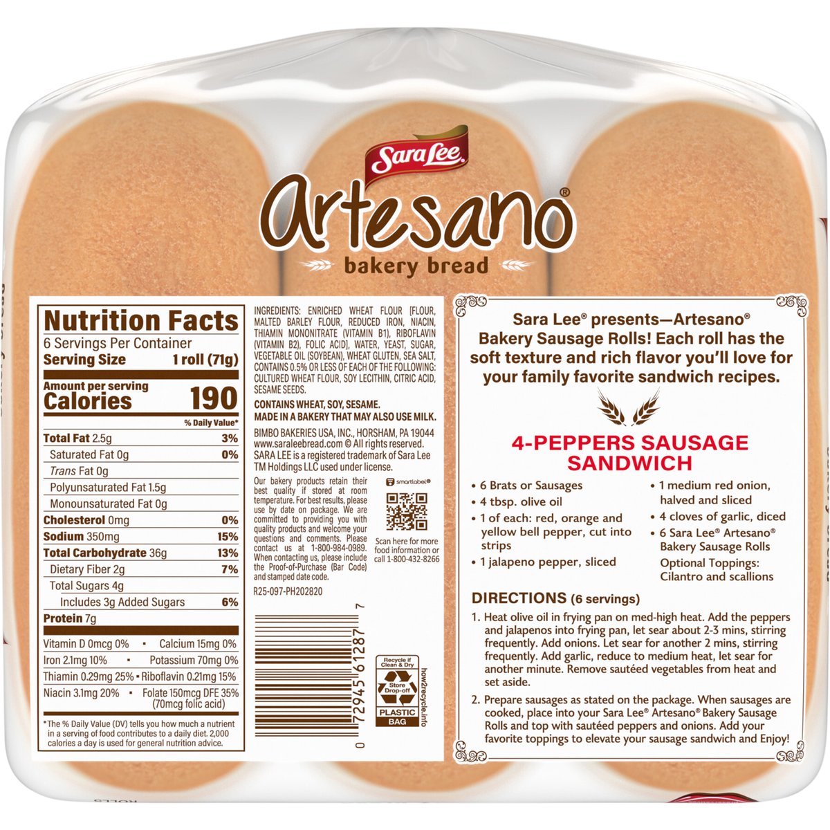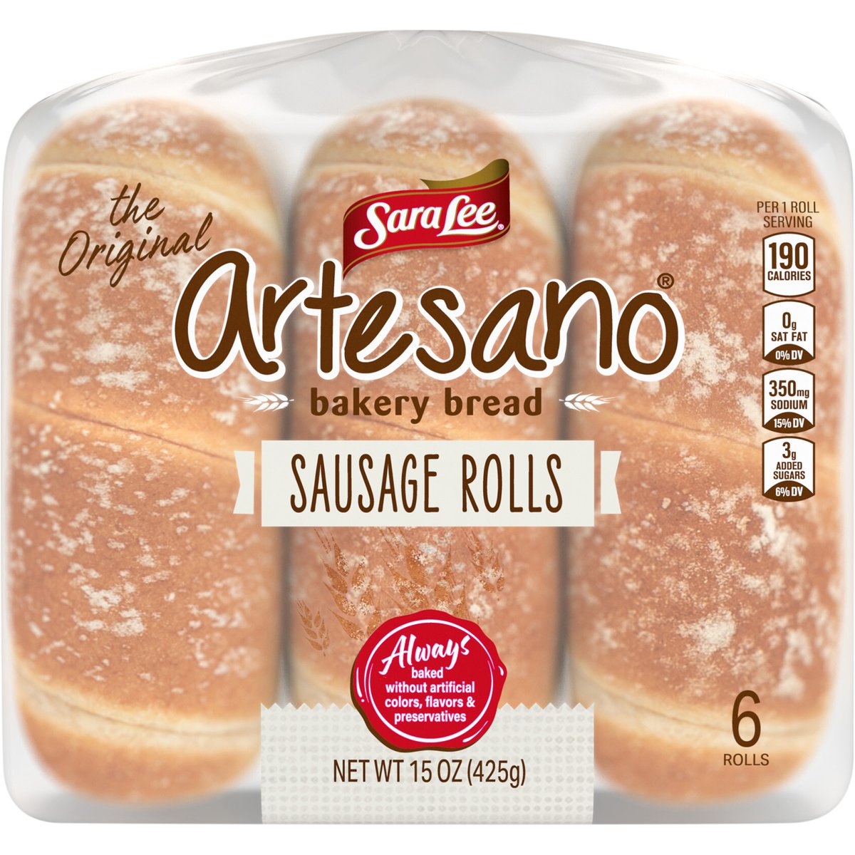 Always baked without artificial colors, flavors & preservatives. Per 1 Roll Serving: 200 calories; 0 g sat fat (0% DV); 350 mg sodium (15% DV); 4 g total sugars. The original. Bakery bread. Sara Lee presents-artesano Bakery sausage rolls! Each roll has the Soft texture and rich flavor you'll love for Your family favorite sandwich recipes. www.saraleebread.com. SmartLabel: Scan for more food information or call 1-800-432-8266. We are committed to providing you with quality products and welcome your questions and comments Call 1-800-984-0989, Consumer Relations Department. When writing, please include the Proof-of-Purchase (Bar Code) and stamped date code.
