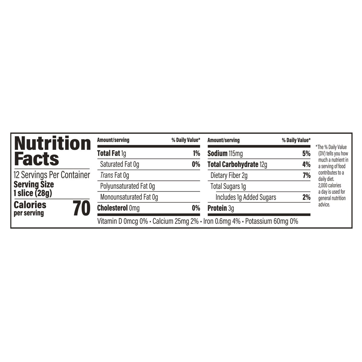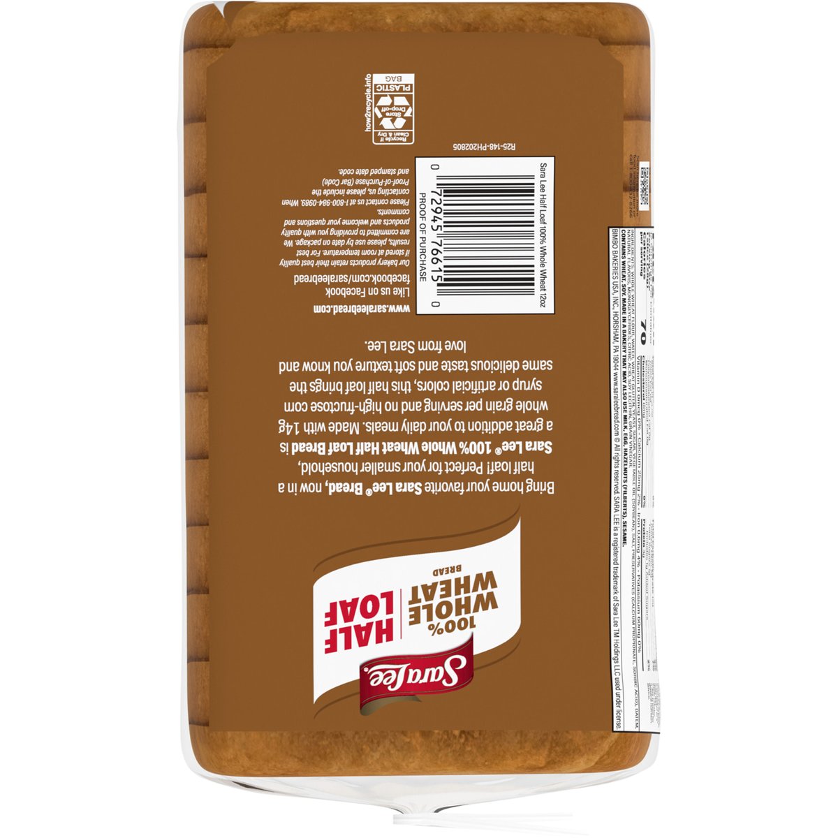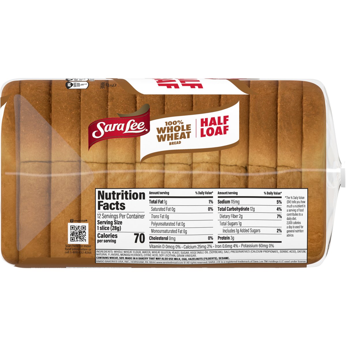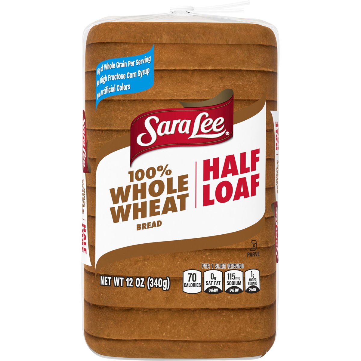 Per 1 Slice Serving: 70 calories; 0 g sat fat (0% DV); 115 mg sodium (5% DV); 1 g added sugars (2% DV). 14 g of whole grain per serving. Half Loaf. No high fructose corn syrup. No artificial colors. Bring home your favorite Sara Lee Bread, now in a half loaf! Perfect for your smaller household, Sara Lee 100% Whole Wheat Half Loaf Bread is a great addition to your daily meals. Made with 14g whole grain per serving and no high-fructose corn syrup or artificial colors, this half loaf brings the same delicious taste and soft texture you know and love from Sara Lee. www.saraleebread.com. how2recycle.info. SmartLabel: Scan for more food information or call 1-800-432-8266. Like us Facebook. facebook.com/saraleebread. We are committed to providing you with quality products and welcome your questions and comments. Please contact us at 1-800-984-0989. When contacting us, please include the Proof-of-Purchase (Bar Code) and stamped date code.