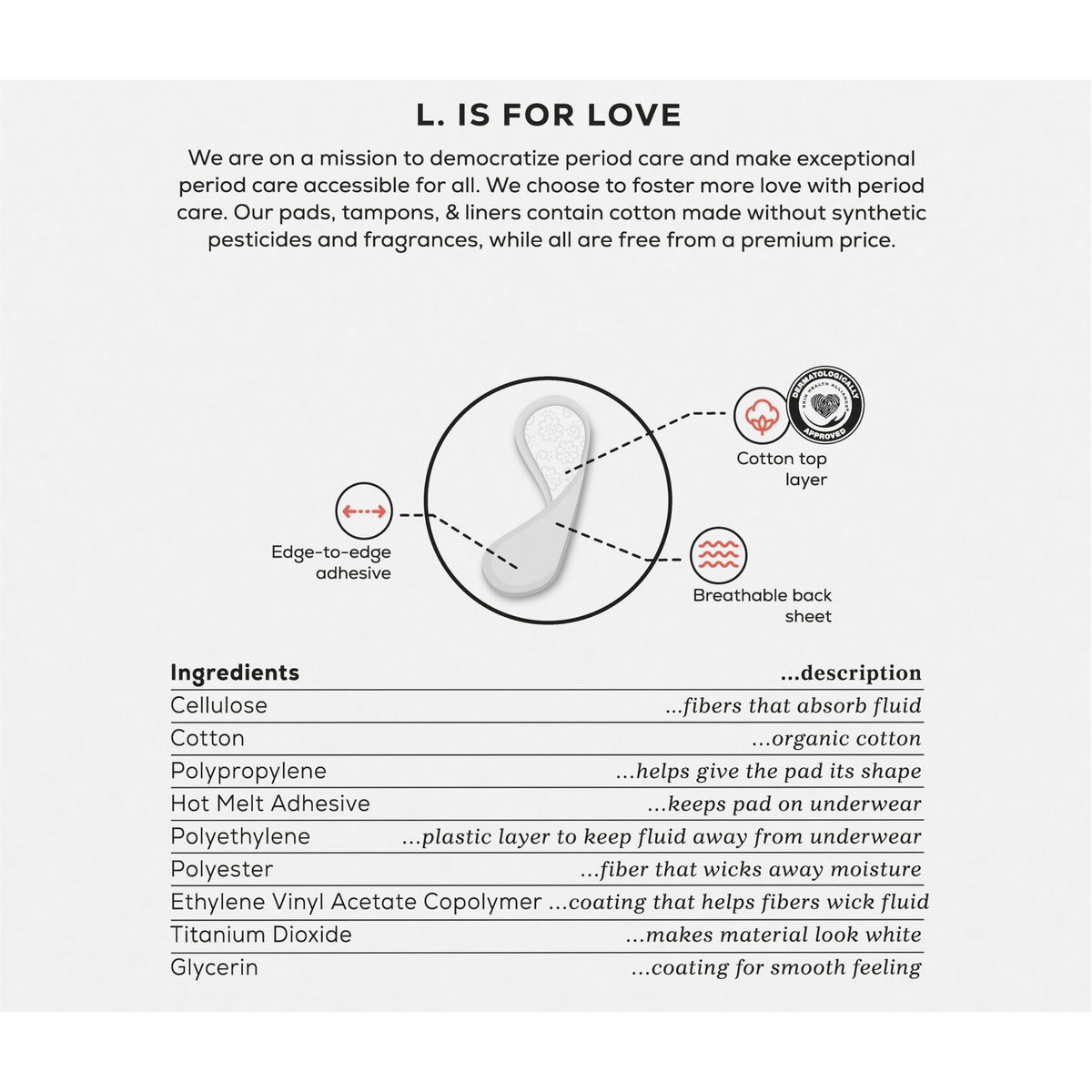 Made Without: Synthetic pesticides; fragrances. Hypoallergenic & gentle on skin. L. Is for Love: We are on a mission to democratize period care and make exceptional period care accessible for all. We choose to foster more love with period care. Our pads, tampons, & liners contain cotton made without synthetic pesticides and fragrances, while all are free from a premium price. Cotton top layer. Edge-to-edge adhesive. Breathable back sheet. Dermatologically approved. Skin health alliance. www.thisisL.com. how2recycle.info. Scan UPC for more product information. We'd love to hear from you! 1 (888) 574-9646. www.thisisL.com. Made in Mexico.