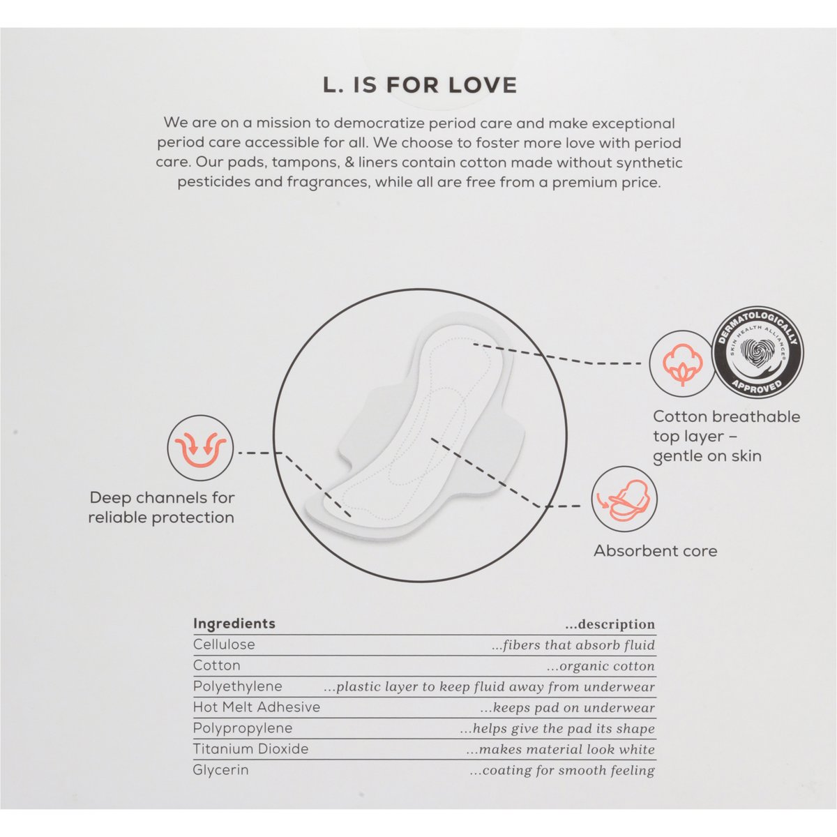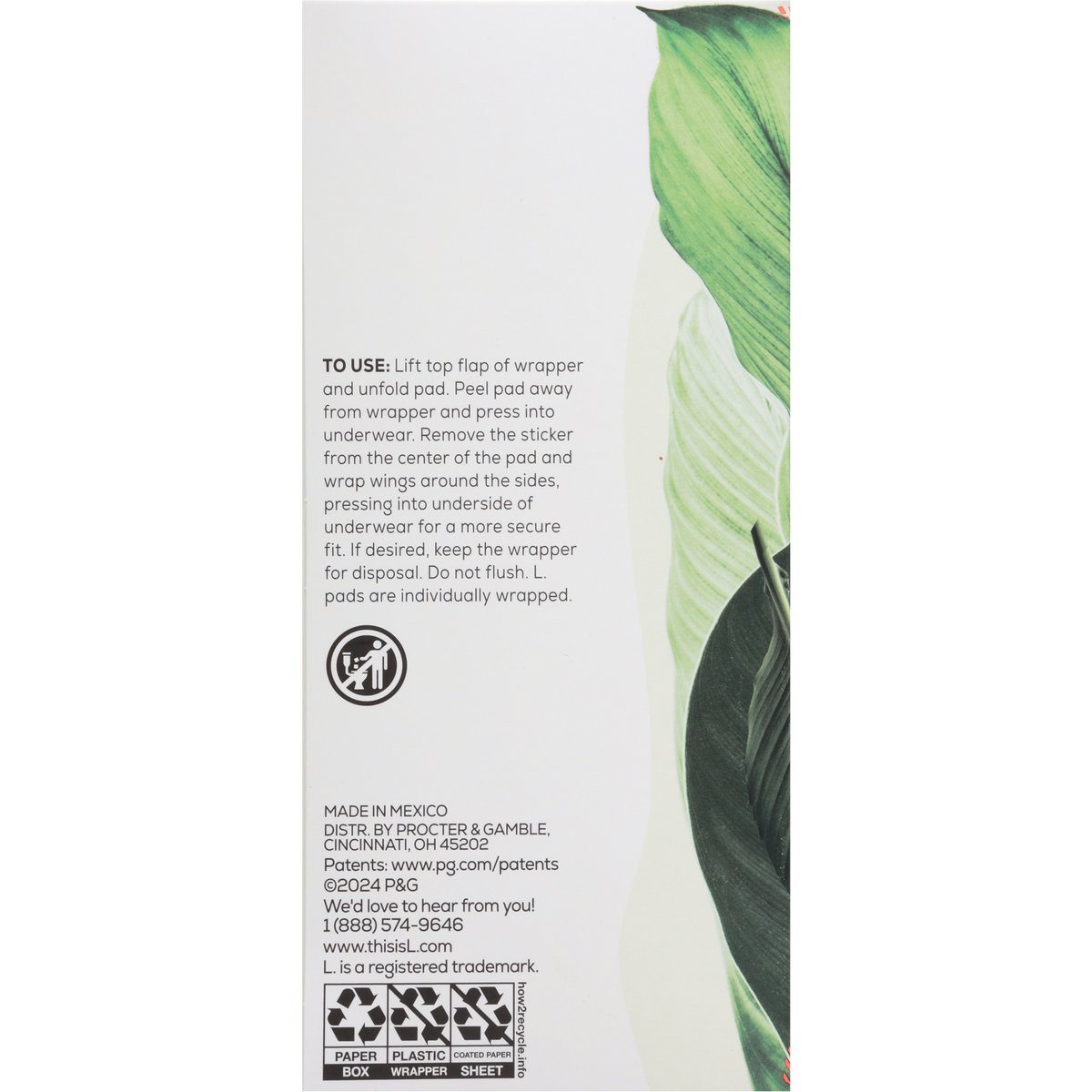 Hypoallergenic & gentle on skin. L. Is for Love: We are on a mission to democratize period care and make exceptional period care accessible for all. We choose to foster more love with period care. Our pads, tampons, & liners contain cotton made without synthetic pesticides and fragrances, while all are free from a premium price. Cotton breathable top layer - gentle on skin. Absorbent core. Deep channels for reliable protection. www.thisisL.com. how2recycle.info. Scan UPC for more product information. We'd love to hear from you! 1 (888) 574-9646. www.thisisL.com. Made in Mexico.