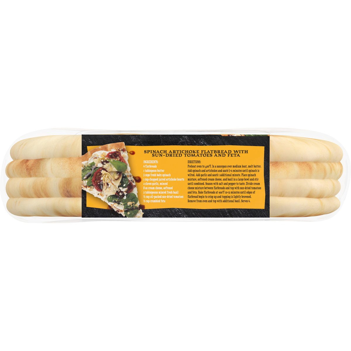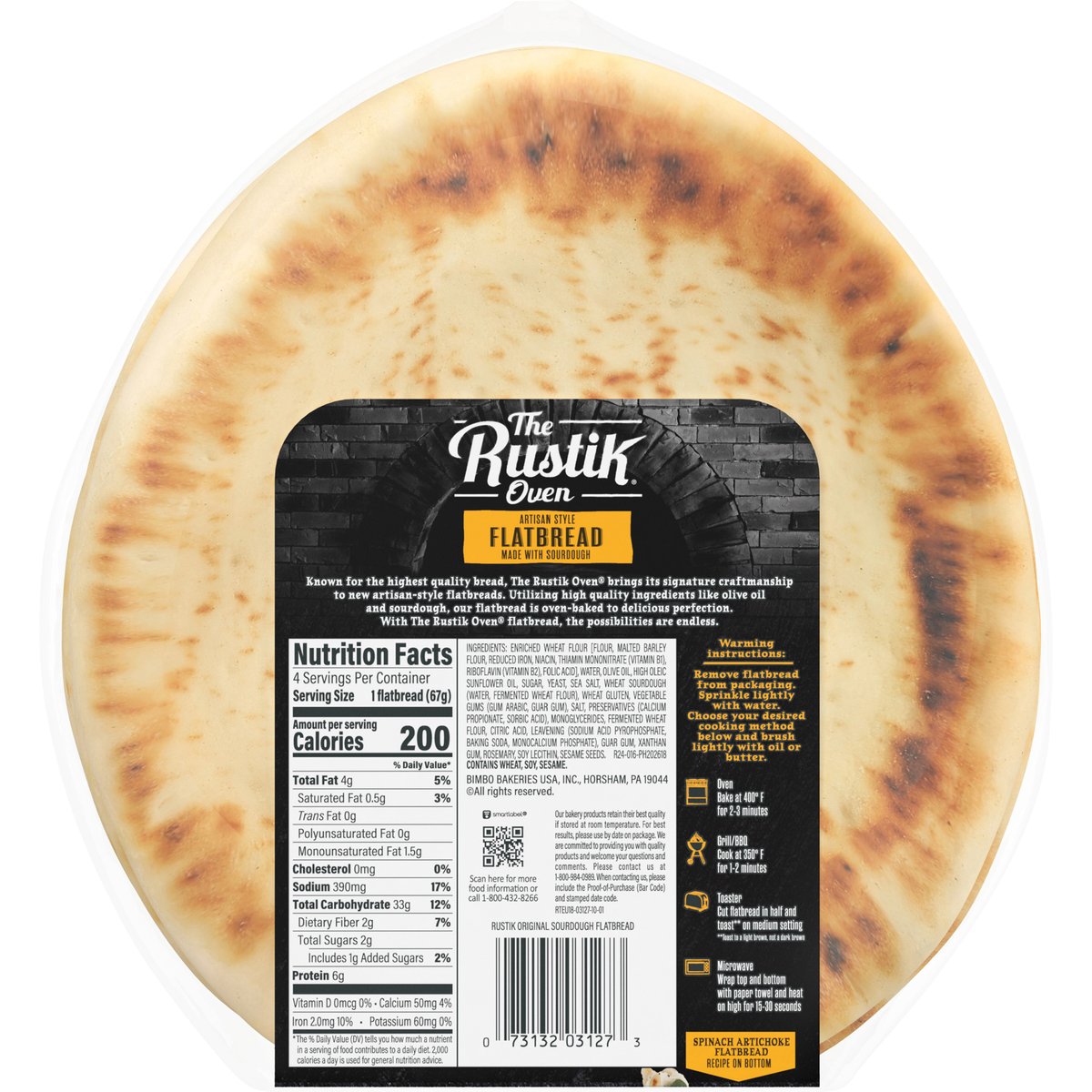 Per 2 Flatbread Serving: 200 calories; 0.5 g sat fat (3% DV); 390 mg sodium (17% DV); 1 g added sugars (2% DV). Known for the highest quality bread, The Rustik Oven brings its signature craftmanship to new artisan-style flatbreads. Utilizing high quality ingredients like olive oil and sourdough, our flatbread is oven-baked to delicious perfection. With The Rustik Oven flatbread, the possibilities are endless. SmartLabel: Scan for more food information or call 1-800-432-8266. We are committed to providing you with quality products and welcome your questions and comments. Please contact us at 1-800-984-0989. When contacting us, please include the Proof-of-Purchase (Bar Code) and stamped date code.