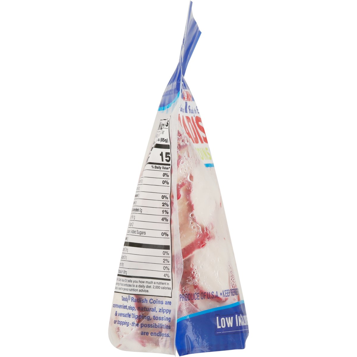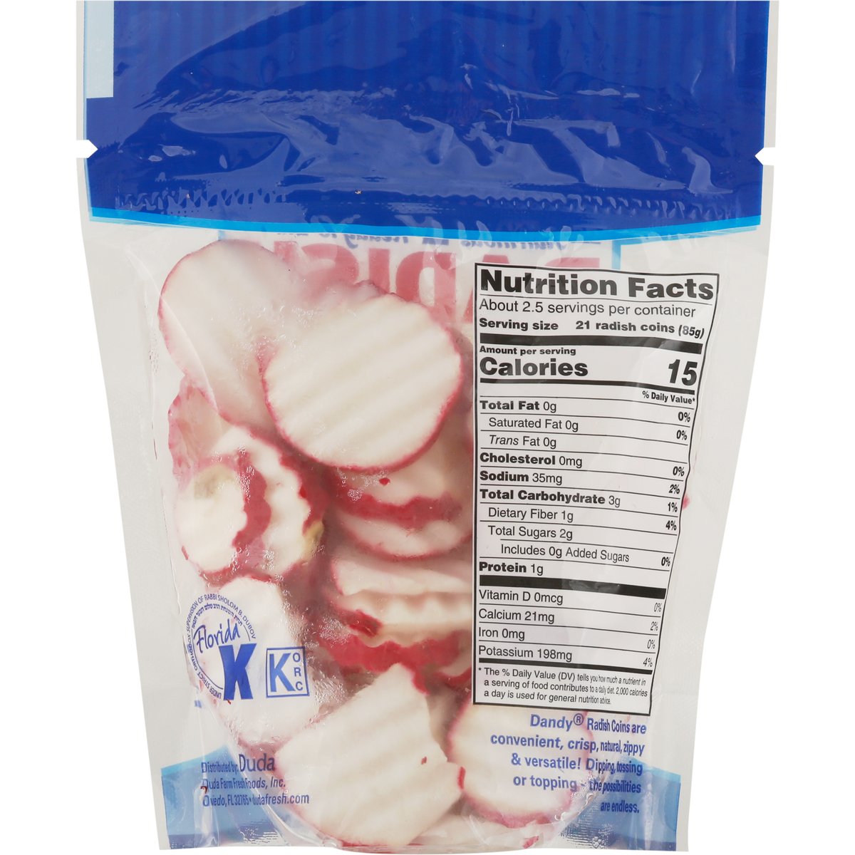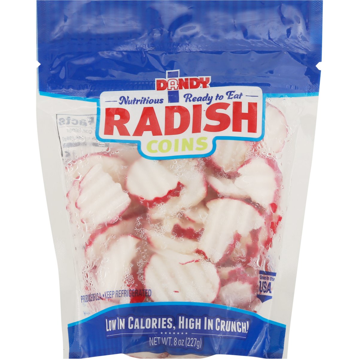Low in calories, high in crunch! Nutritious. Ready to eat. Dandy Radish Coins are convenient, crisp, natural, zippy & versatile! Dipping, tossing or topping - the possibilities are endless. dudafresh.com. Grown in the USA.