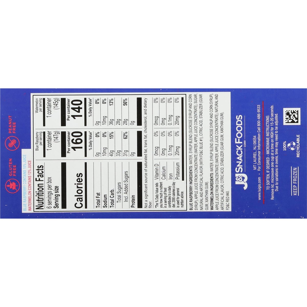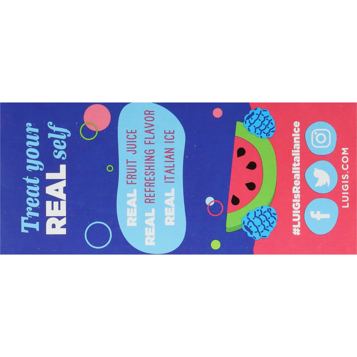 Naturally & artificially flavored. Peanut free. Gluten free. No high fructose corn syrup. Treat Your Real Self: Real fruit juice; Real refreshing flavor; Real Italian ice. www.luigis.com. (hasthag)Luigisrealtalianice. Facebook. Twitter. Instagram. For consumer information call 800-486-9533. 100% recyclable.