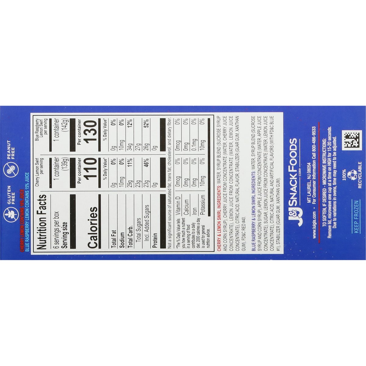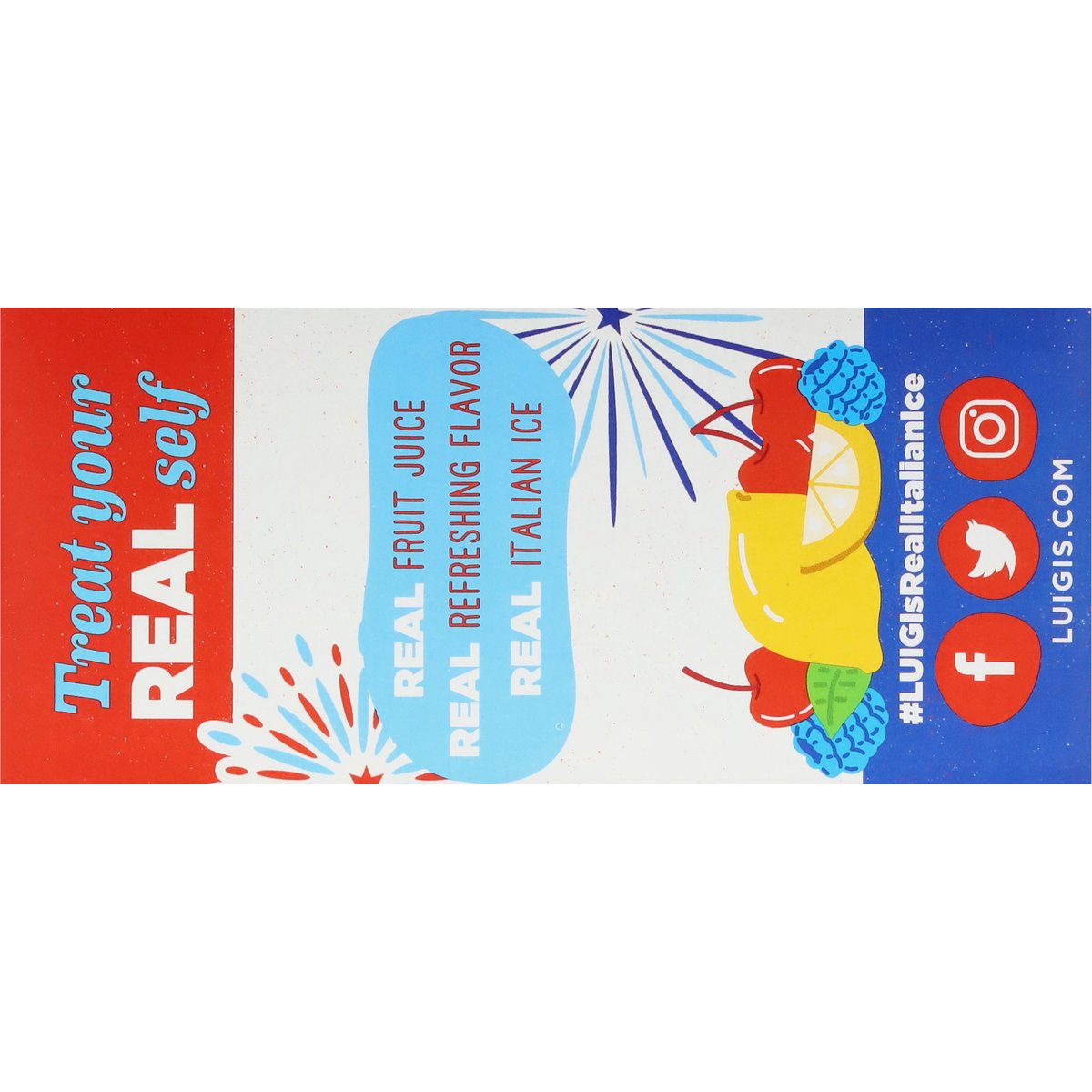 Naturally & artificially flavored. Real Italian ice. No high fructose corn syrup. Treat your real self. Real fruit juice. real refreshing flavor. Real Italian ice. www.luigis.com. (hashtag)luigisrealitalianice. Facebook. Twitter. Instagram. For consumer information call 800-486-9533. 100% recyclable.
