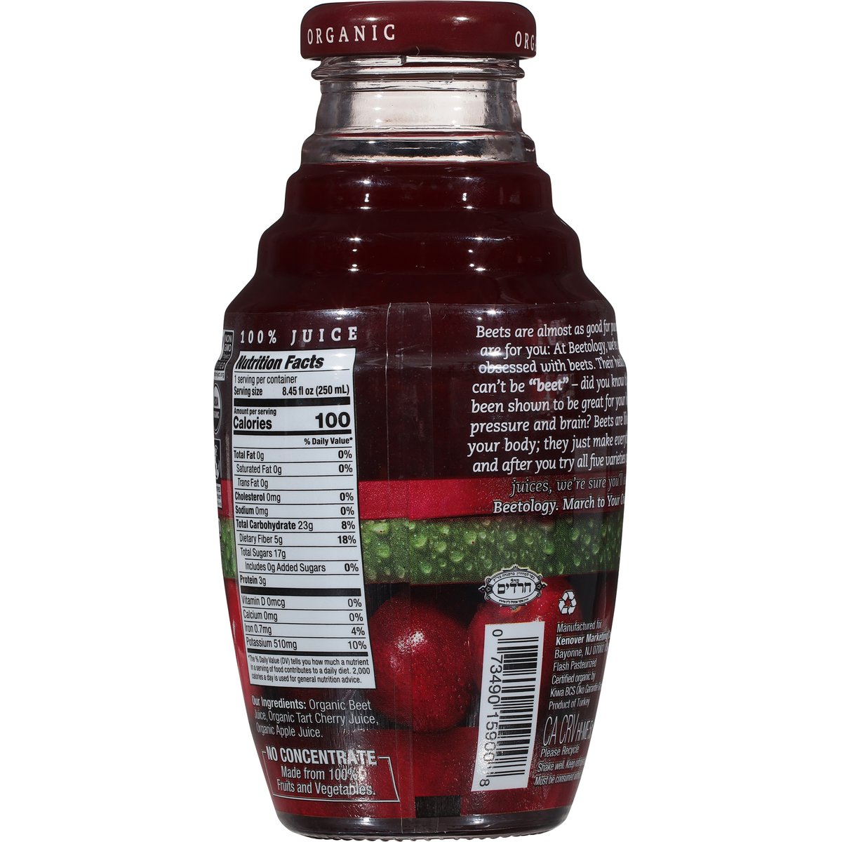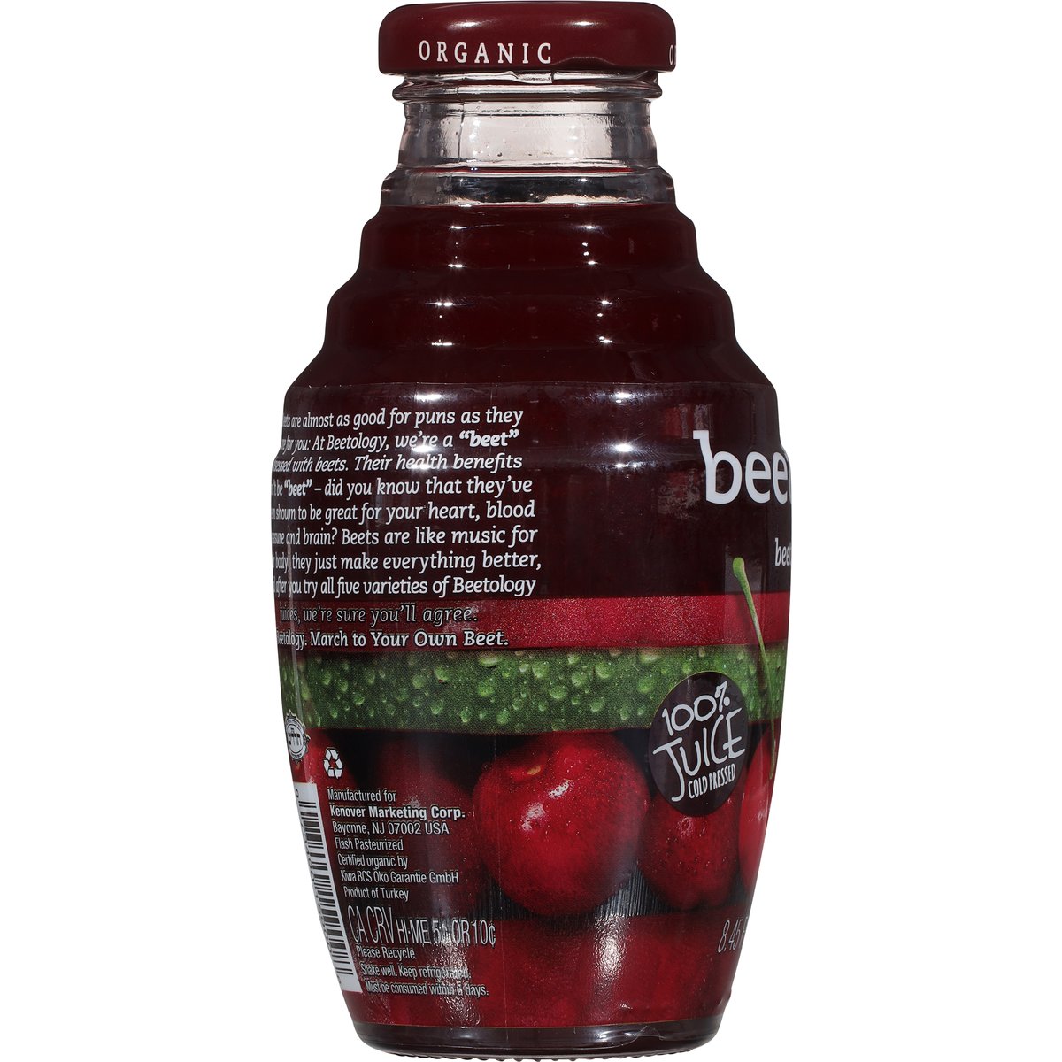 USDA Organic. Certified Organic by Kiwa BCS Oko Garantie. Non-GMO Project verified. nongmoproject.org. Beets are almost as good for puns as they are for you: At Beetology, we're a beet obsessed with beets. Their health benefits can be beet - did you know that they've been shown to be great for your heart, blood pressure and brain? Beets are like music for your body; they just make everything better, and after you try all five varieties of Beetology juices, we're sure you'll agree. Beetology. March to your own beet. Flash pasteurized. No concentrate. Certified Fair Trade. fairtsa.org. Please recycle. Product of Turkey.