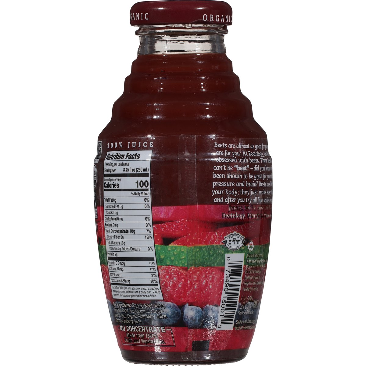 USDA Organic. Certified Organic by Kiwa BCS Oko Garantie GmbH. Non-GMO Project verified. nongmoproject.org. Cold pressed. Beets are almost as good for puns as they are for you: At Beetology, we're a beet obsessed with beets. Their health benefits can't be beet - did you know that they've been shown to be great for your heart, blood pressure and brain? Beets are like music for your body; they just make everything better, and after you try all five varieties of Beetology juices, we're sure you'll agree. Beetology. March to your own beet. Flash pasteurized. Certified Fair Trade. fairtsa.org. Please recycle. Product of Turkey.