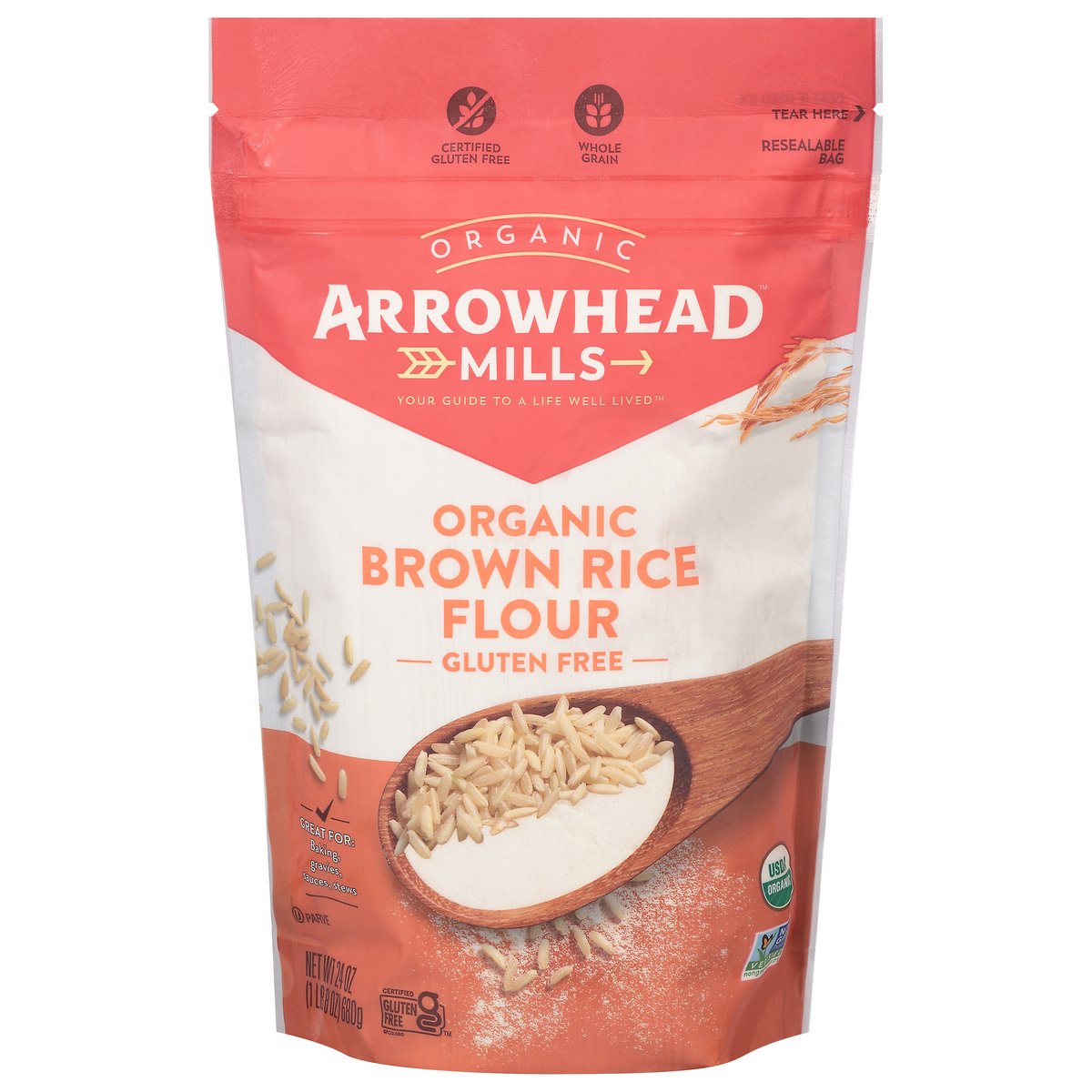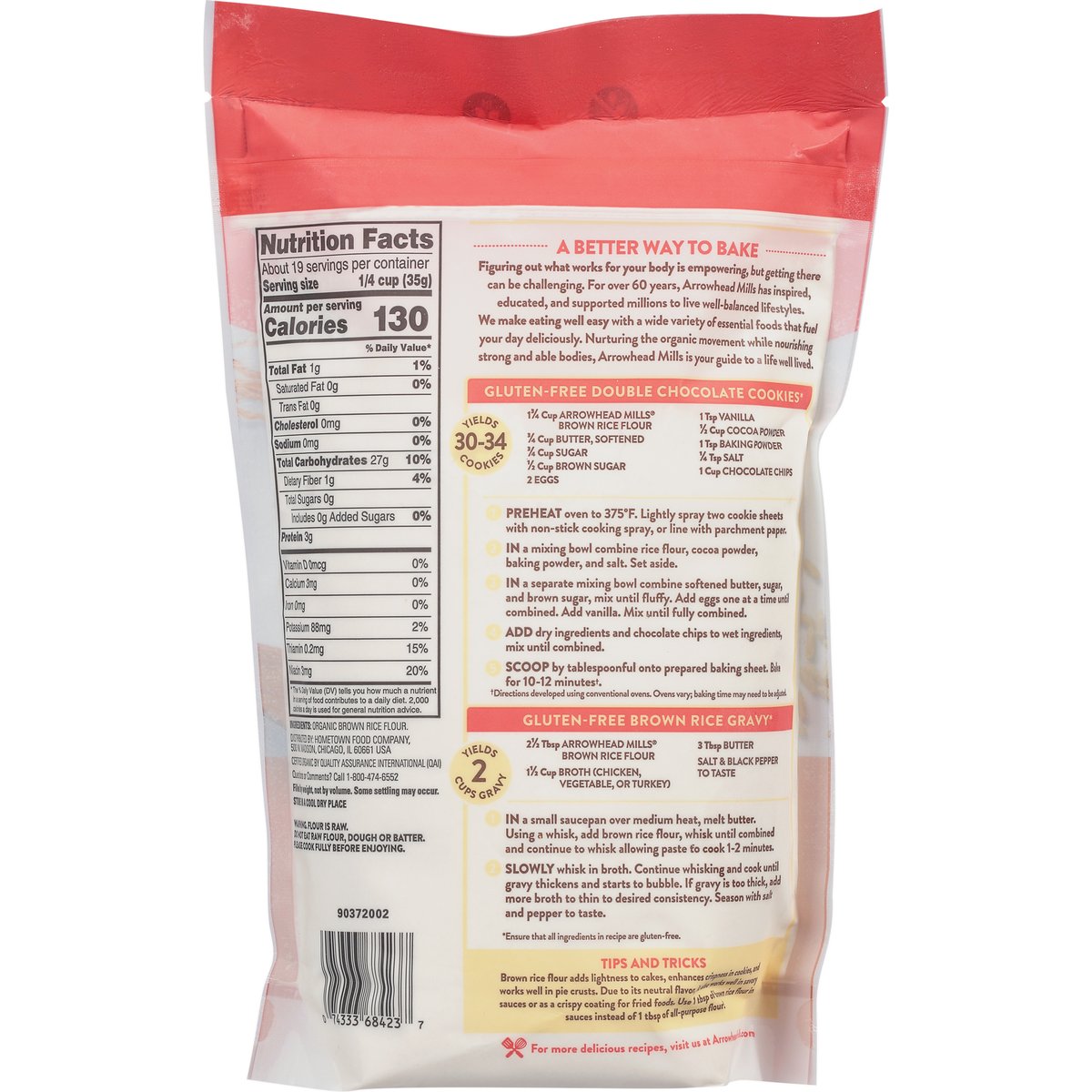 Certified gluten free. USDA Organic. Certified gluten free. gfco.org. Certified Organic by Quality Assurance International (QAI). Non-GMO Project verified. nongmoproject.org. Whole grain. Your guide to a life well lived. Filled by weight, not by volume. Some settling may occur. A better way to bake. Figuring out what works for your body is empowering, but getting there can be challenging, for over 60 years, arrowhead mills has inspired, educated, and supported millions to live well-balanced lifestyles, we make eating well easy with a wide variety of essential foods that fuel your day deliciously, nurturing the organic movement while nourishing strong and able bodies, arrowhead mills is your guide to a life well lived. Tips and Tricks: Brown rice flour adds lightness to cakes, enhances crispiness, and in cookies, and works well in pie crusts. Due to its neutral flavor, it also works well in sauces or as a crispy coating for fried foods. Use 1 tbsp of brown rice flour in sauces instead of 1 tbsp of all-purpose flour. www.arrowheadmills.com. Questions or comments? Call 1-800-474-6552. For more delicious recipes, visit us at www.Arrowheadmills.com. Resealable bag.