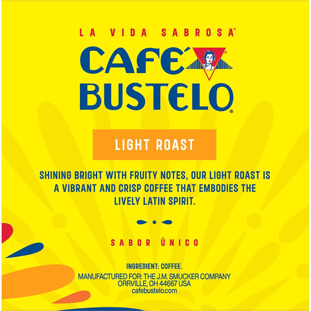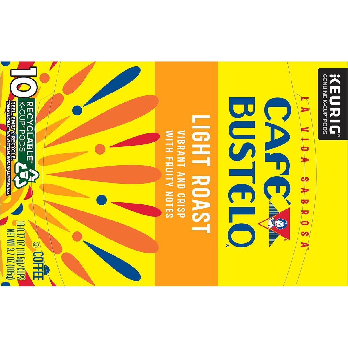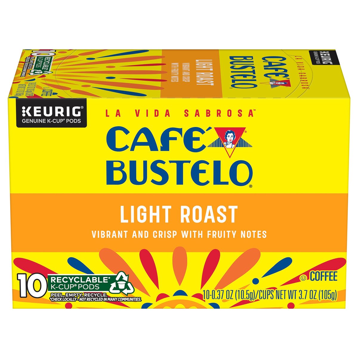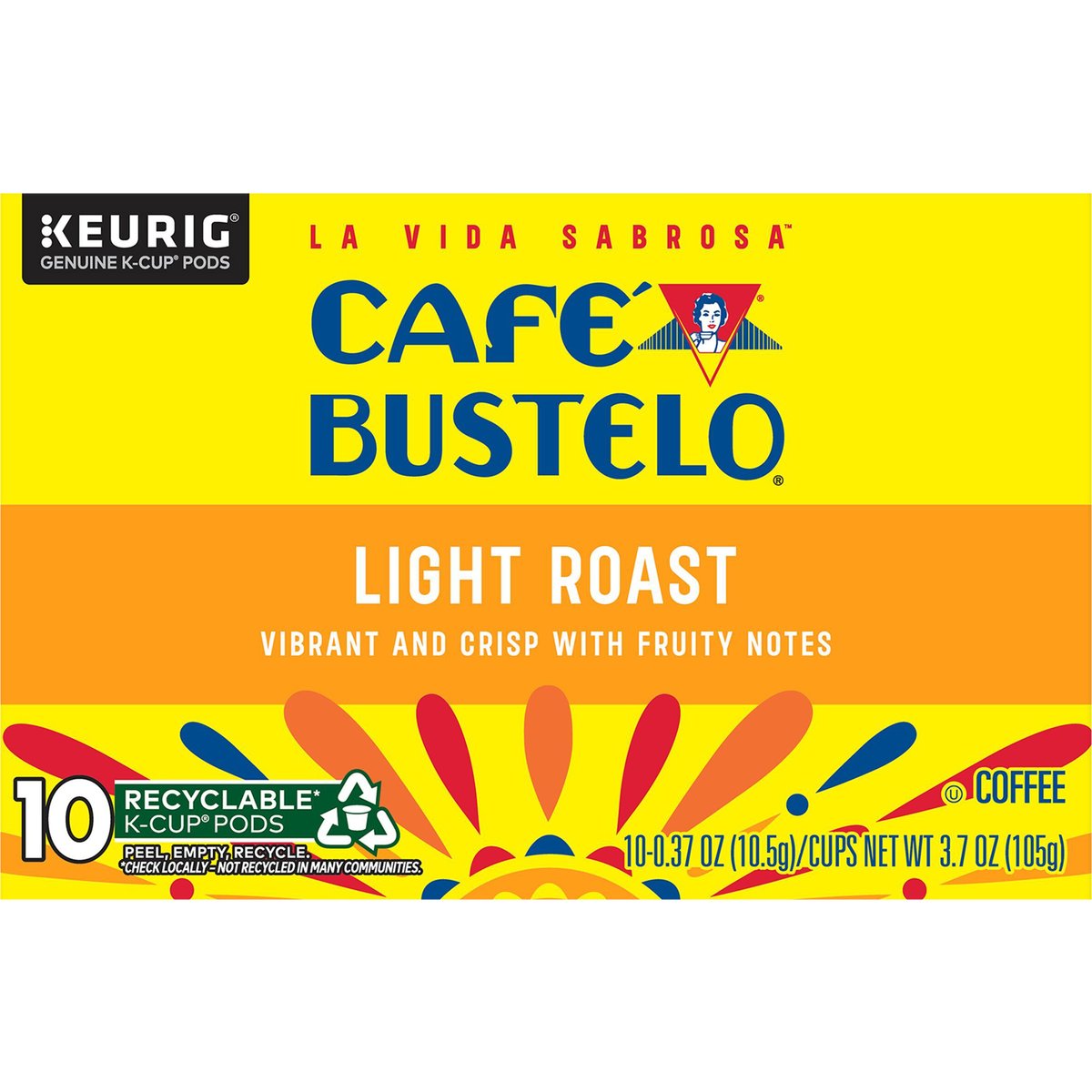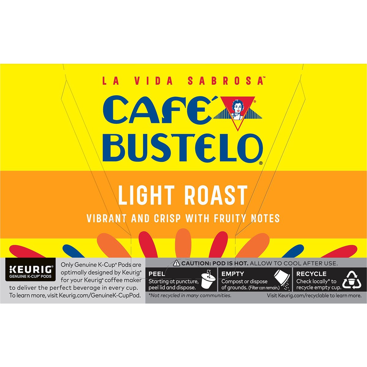 Vibrant and crisp with fruity notes. Only Genuine K-Cup Pods are optimally designed by Keurig for your Keurig coffee maker to deliver the perfect beverage in every cup. Since 1928. With nearly 100 years of coffee experience serving the Latin community, Cafe Bustelo embodies an iconic passion, energy and thirst for life. Our coffee is crafted for a bold and lively experience in every cup. With Cafe Bustelo, life is more flavorful! Shining bright with fruity notes, our light roast is a vibrant and crisp coffee that embodies the lively Latin spirit. cafebustelo.com. www.Keurig.com. how2recycle.info. Find us on Facebook.com/Keurig or Instagram.com/Keurig. To learn more, visit keurig.com/genuinek-cuppod. For more information about Cafe Bustelo products contact: the J.M. Smucker Company Orrville, OH 44667 USA; 1-800-990-9039/cafebustelo.com. For brewer inquiries contact: Keurig Green Mountain, Inc. 1-866-901-brew / 1-866-901-2739; www.keurig.com. This carton is made with recycled material. Recyclable* k-cup pods. Peel, empty, recycle. Peel: Starting at puncture, peel lid and dispose. Empty: Compost or dispose of grounds. (Filter can remain). Recycle: Check locally* to recycle empty cup. Visit Keurig.com/recyclable to learn more. * Check locally - not recycled in many communities. * Not recycled in many communities.