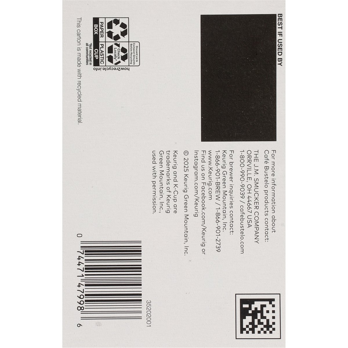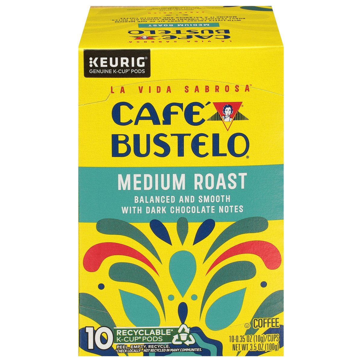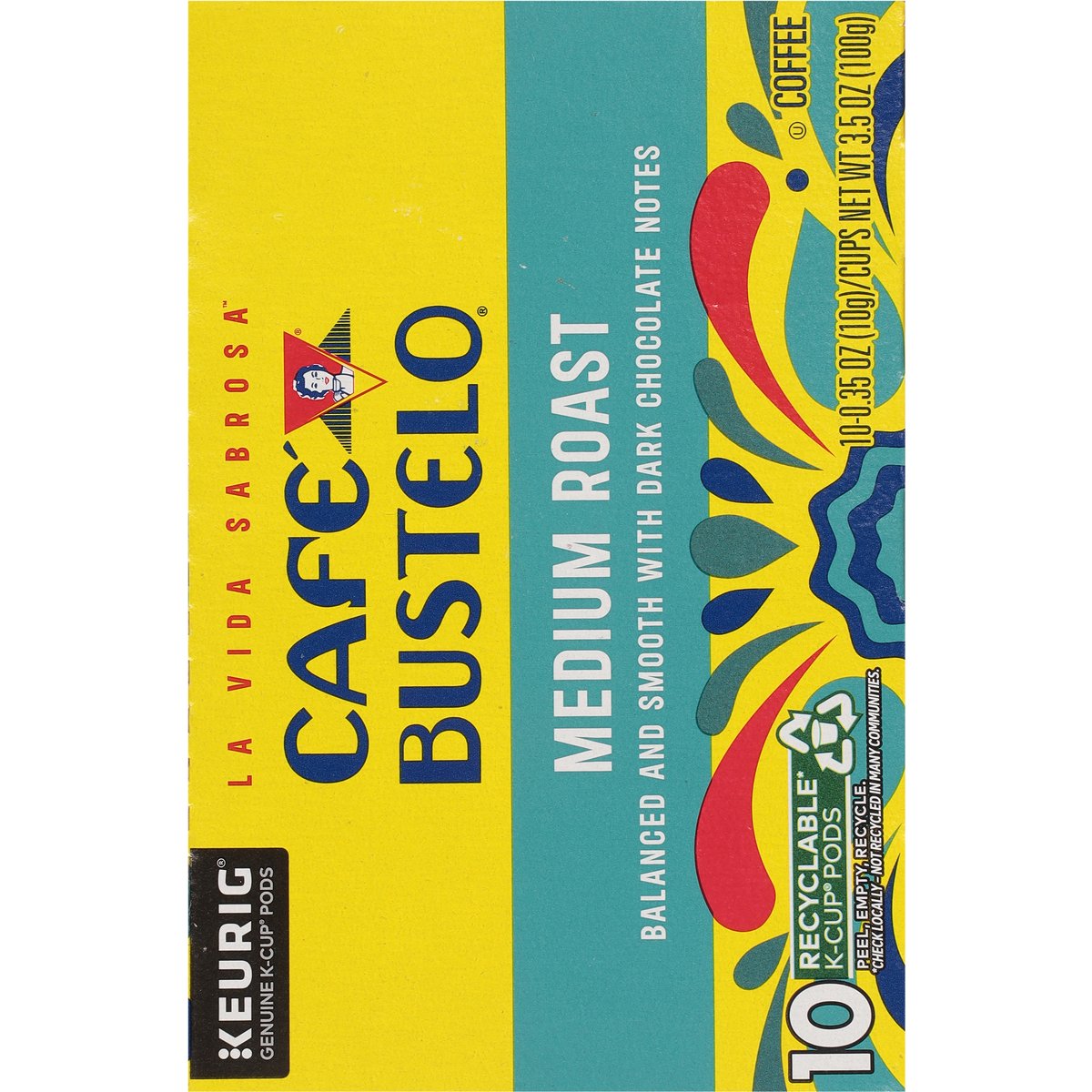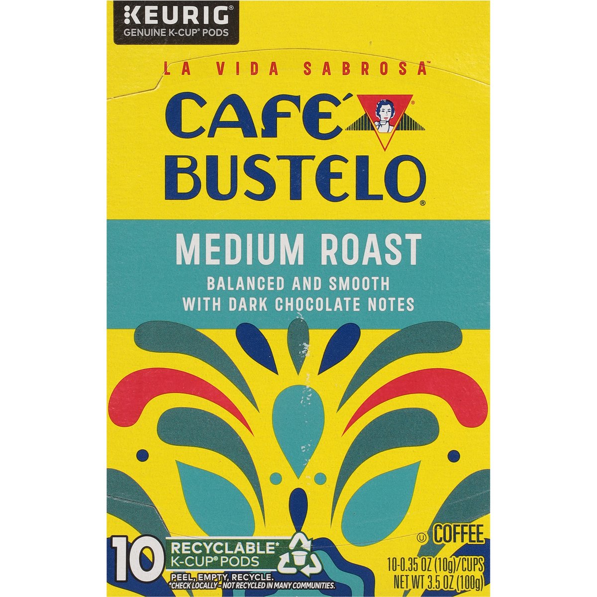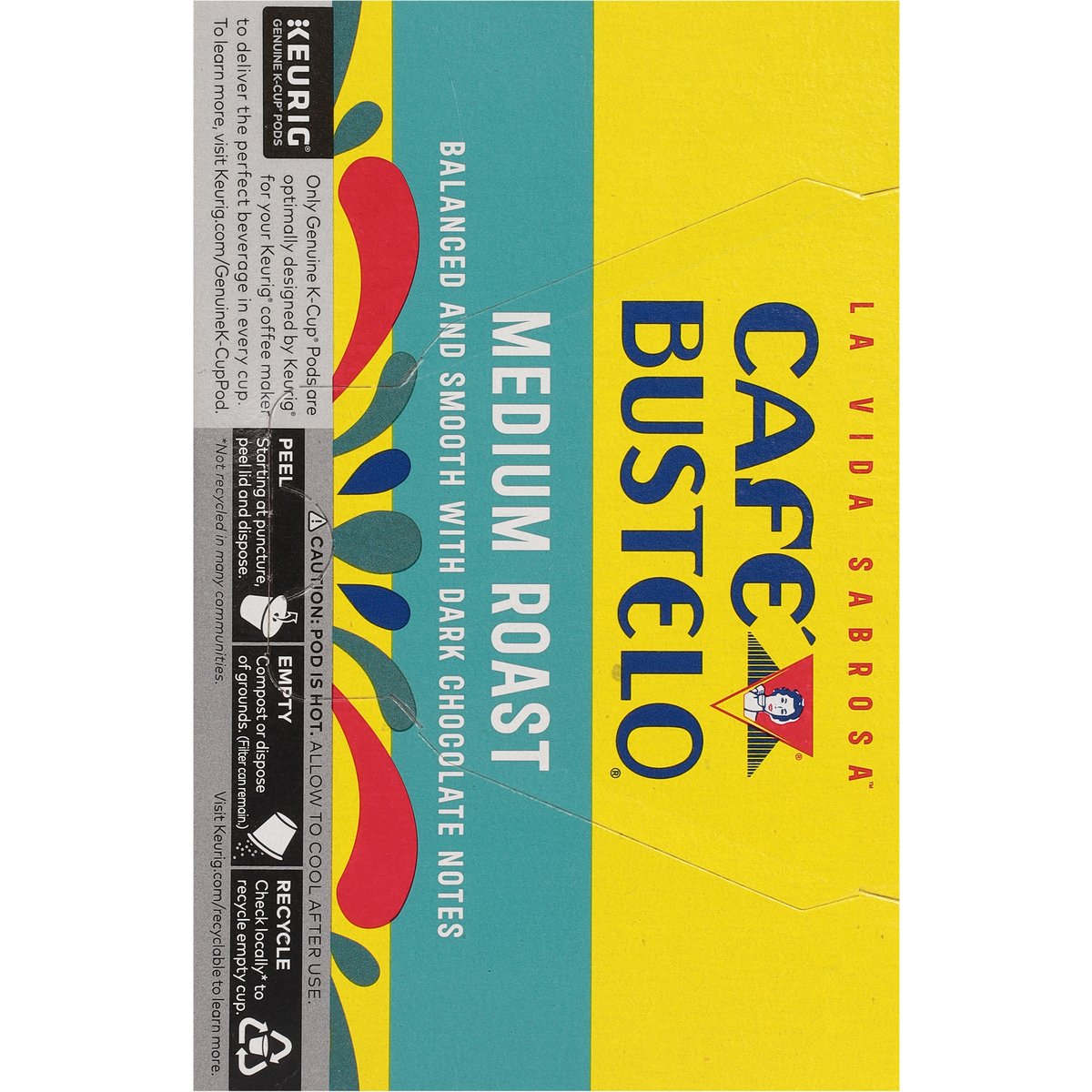 Balanced and smooth with dark chocolate notes. Genuine K-Cup Pods. Only Genuine K-Cup pods are optimally designed by Keurig for your Keurig coffee maker to deliver the perfect beverage in every cup. With lively energy, every sip of our medium roast features vibrant dark chocolate notes, making it a balanced and smooth coffee. With nearly 100 years of coffee experience serving the latin community, cafe bustelo embodies an iconic passion, energy and thirst for life. Our coffee is crafted for a bold and lively experience in every cup. With cafe bustelo, life is more flavorful! how2recycle.info. www.keurig.com. cafebustelo.com. Find us on Facebook.com/Keurig or Instagram.com/Keurig. To learn more, visit Keurig.com/GenuineK-CupPod. For more information about Cafe Bustelo products contact: The J.M. Smucker Company Orrville, OH 44667 USA. 1-800-990-9039/cafebustelo.com. For brewer inquiries contact: Keurig Green Mountain, Inc. 1-866-901-BREW/1-866-901-2739. www.keurig.com. This carton is made with recycled material. Recyclable* K-Cup Pods: Peel, empty, recycle. Peel: Starting at puncture, peel lid and dispose. Empty: Compost or dispose of grounds. (Filter can remain). Recycle: Check locally* to recycle empty cup. Visit Keurig.com/recyclable to learn more. * Check locally - not recycled in many communities. * Not recycled in many communities.