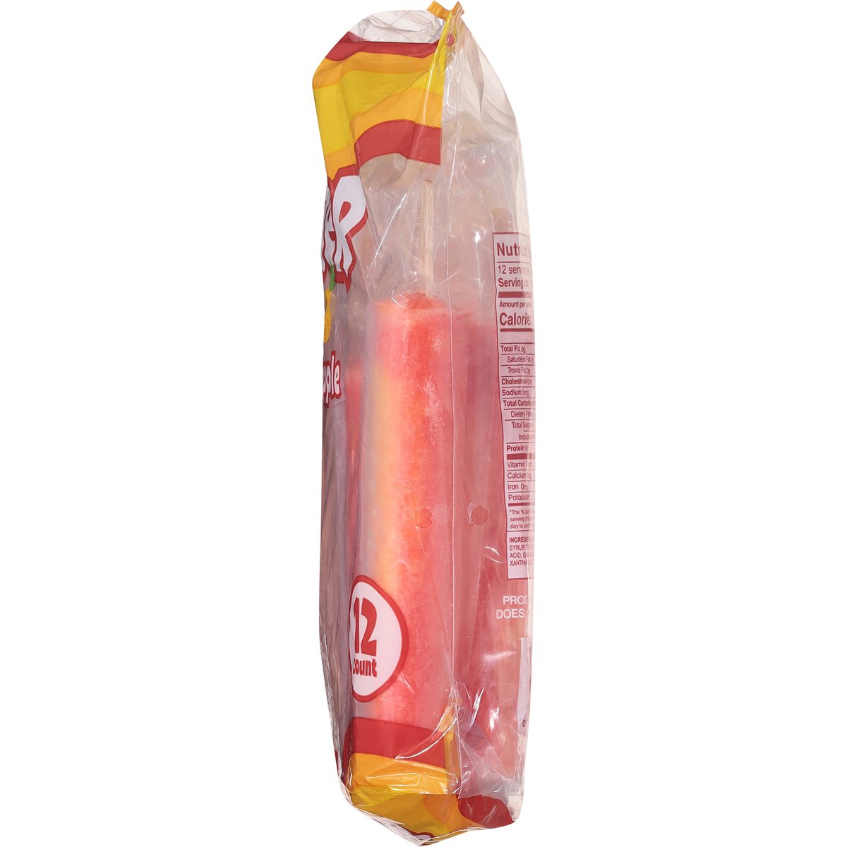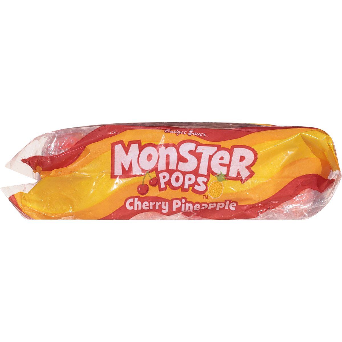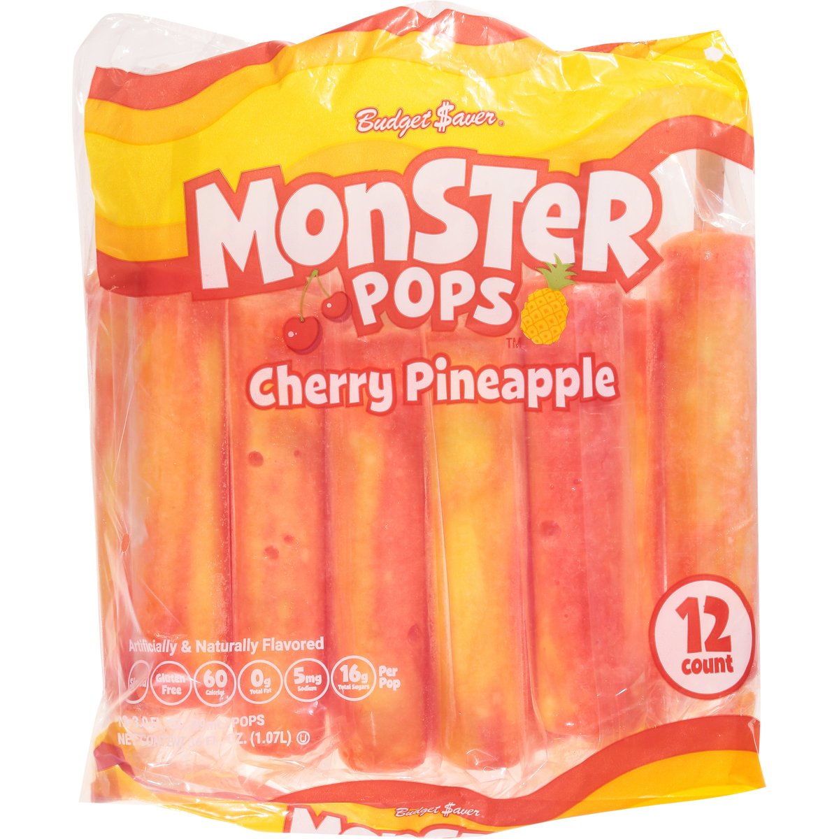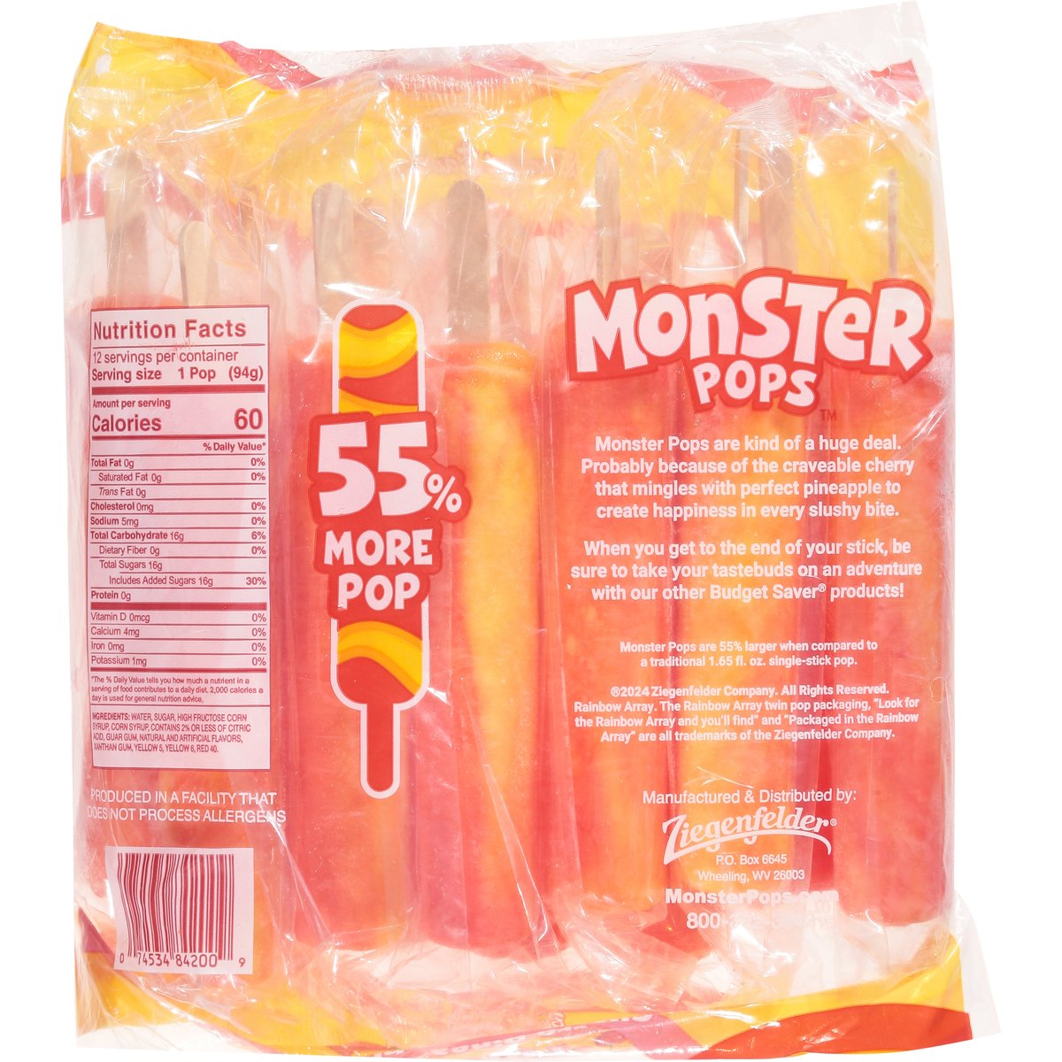 Artificially & naturally flavored. Per pop: 60 calories; 0 g total fat; 5 mg sodium; 16 g total sugars. Gluten Free. 55% more pop. Monster Pops are kind of a huge deal. Probably because of the craveable cherry that mingles with perfect pineapple to create happiness in every slushy bite. When you get to the end of your stick, be sure to take your tastebuds on an adventure with our other Budget Saver products! monsterpops.com. 800-322-3642.