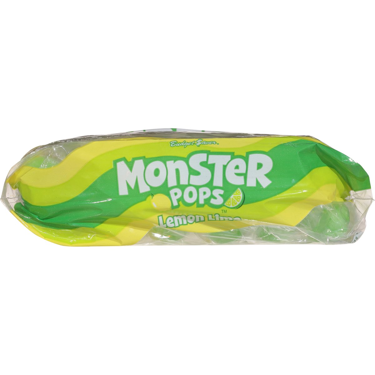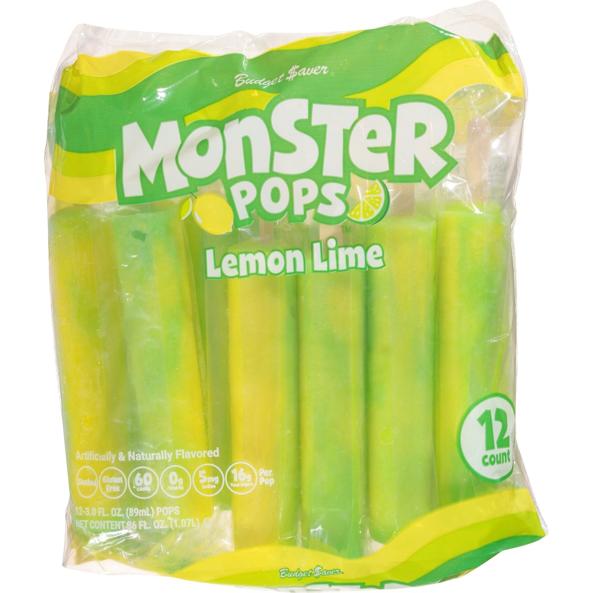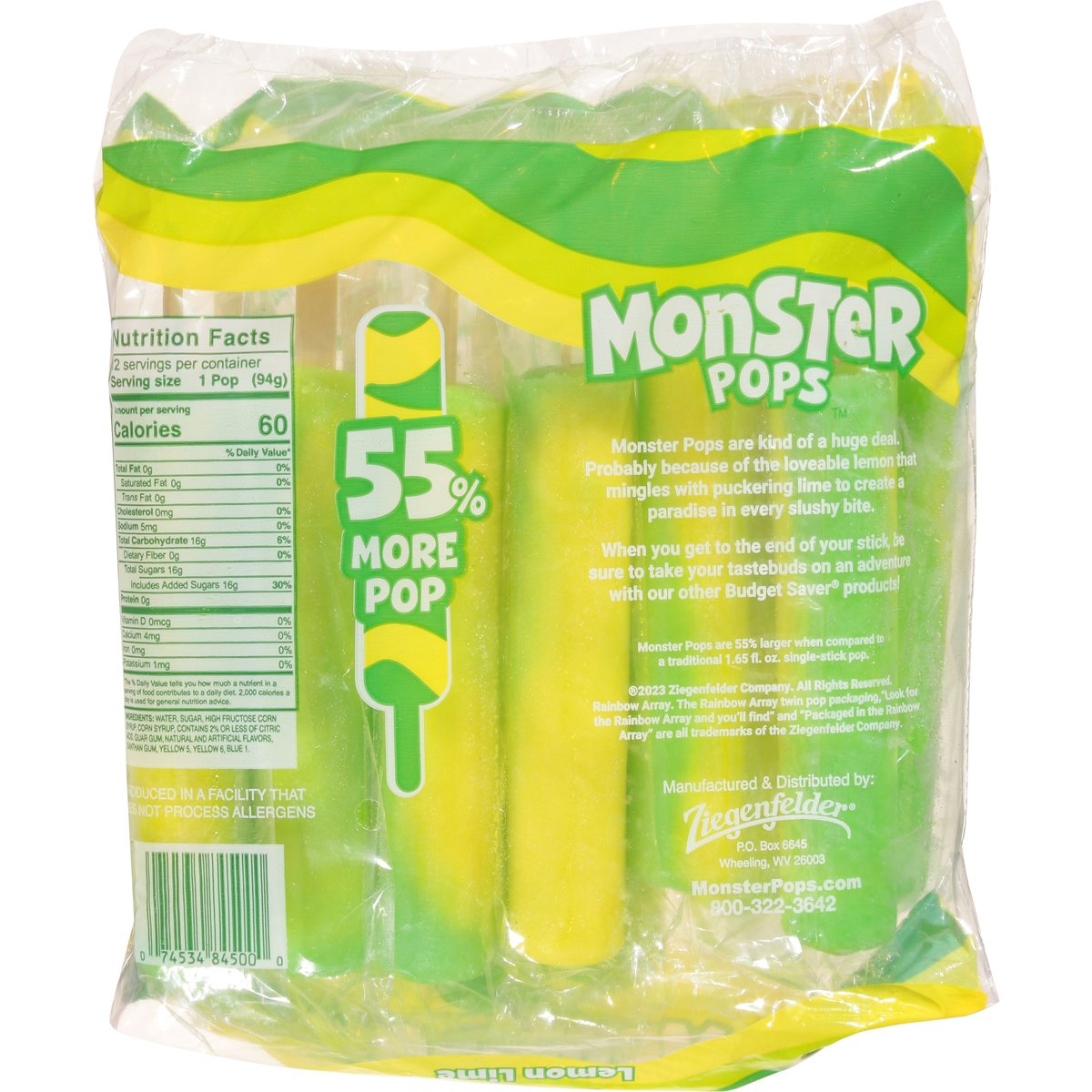 Artificially & naturally flavored. Per Pop: 60 calories; 0 g total fat; 5 mg sodium; 16 g total sugars. Gluten free. 55% more pop. Monster Pops are kind of a huge deal. Probably because of the loveable lemon that mingles with puckering lime to create a paradise in every slushy bite. When you get to the end of your stick, be sure to take your tastebuds on an adventure with our other Budget Saver products! MonsterPops.com. 800-322-3642.