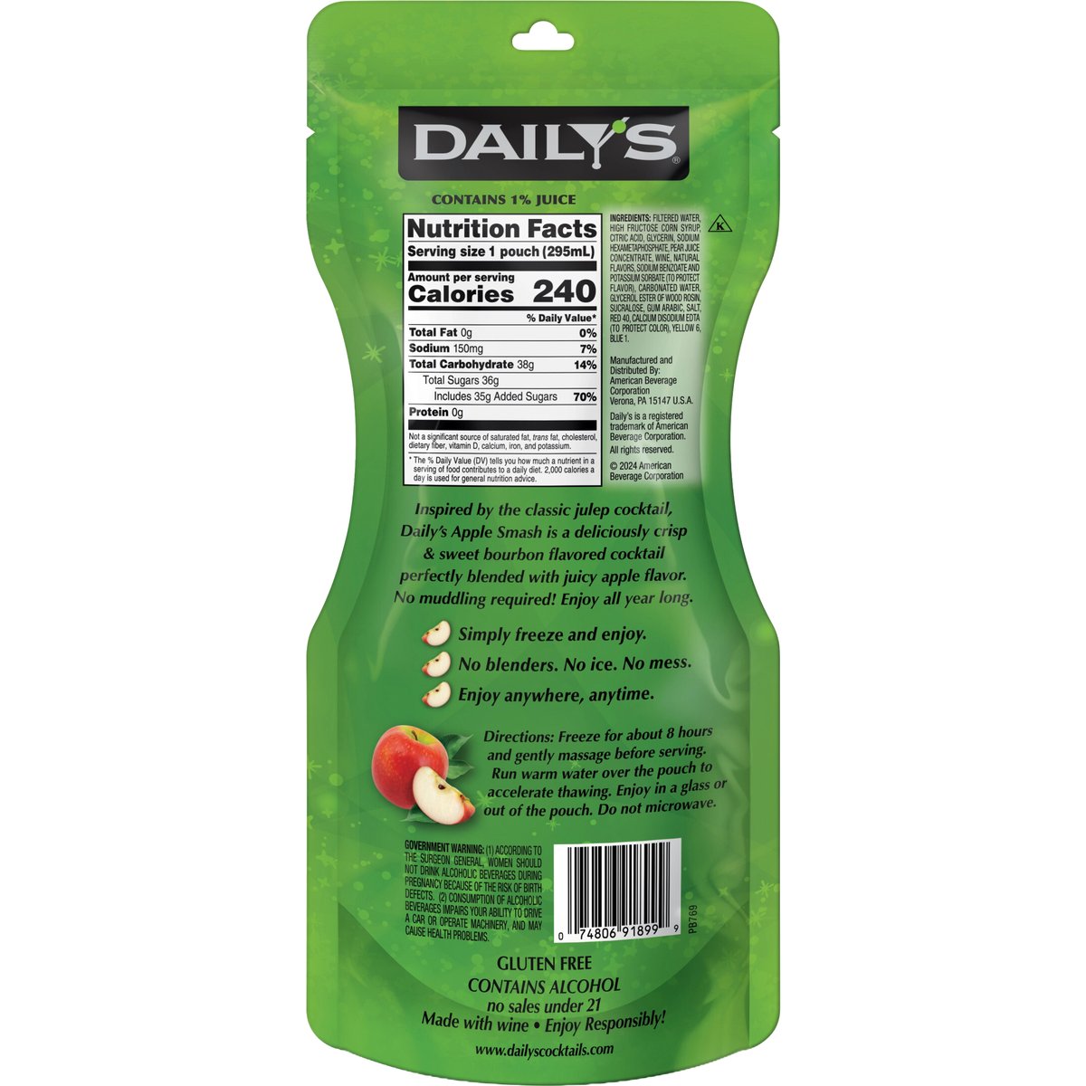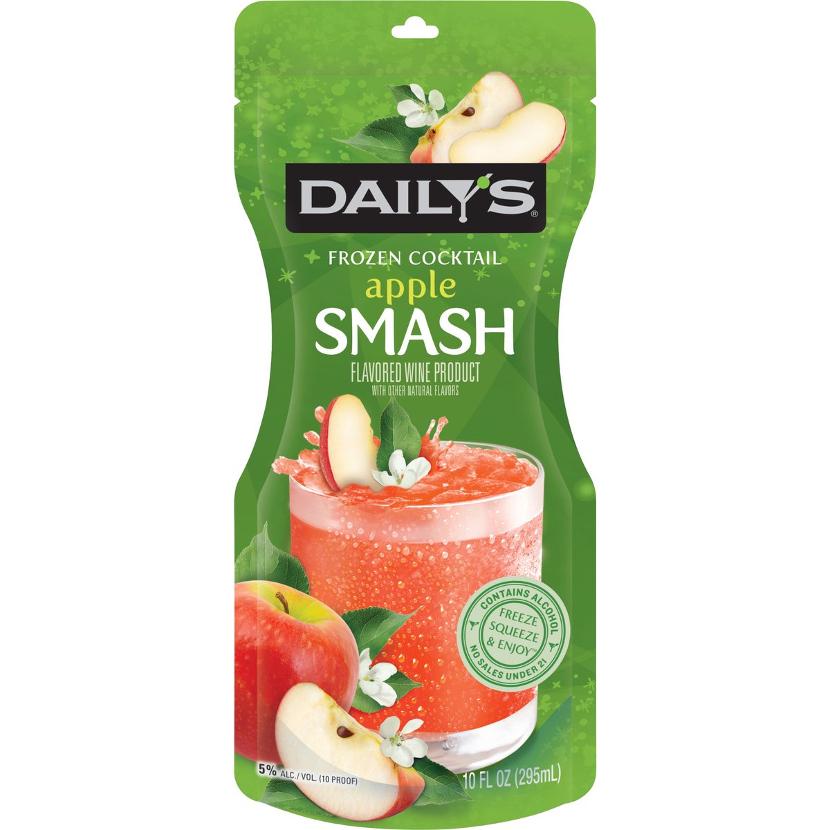 Flavored wine product with other natural flavors. Gluten free. Frozen cocktail. Freeze squueze & enjoy. Inspired by the classic julep cocktail, daily's apple smash is a deliciously crisp & sweet bourbon flavored cocktail perfectly blended with juicy apple flavor. No muddling required! Enjoy all year long. Simply freeze and enjoy. No blenders. No ice. No mess. Enjoy anywhere, anytime. Enjoy responsibly! www.dailyscocktails.com. 5% alc./vol. 10