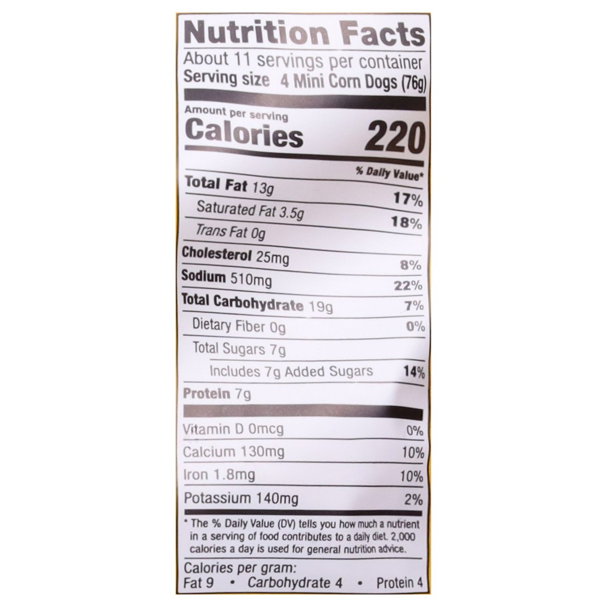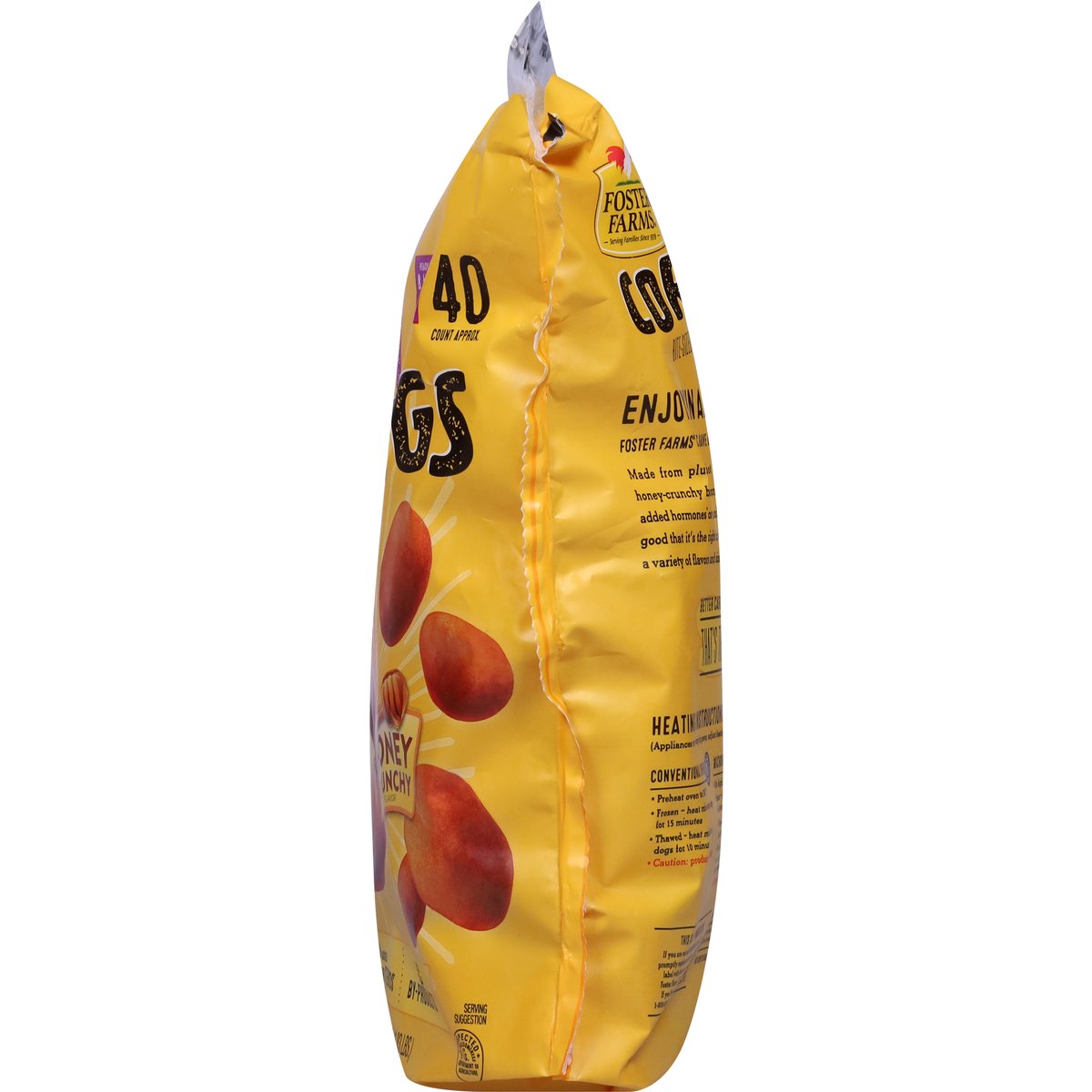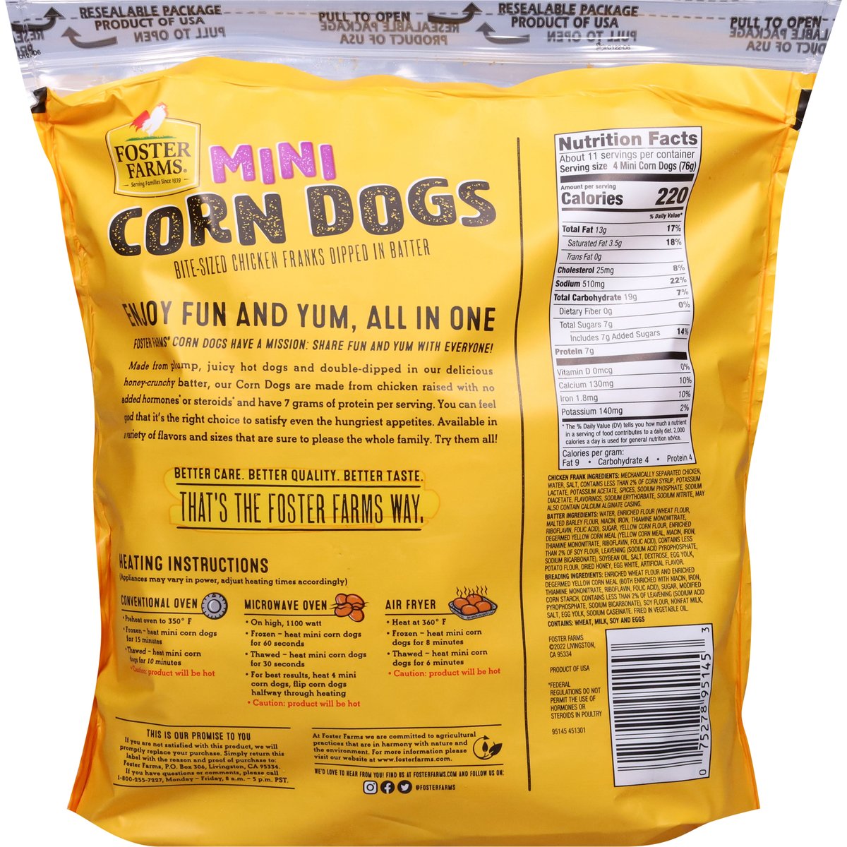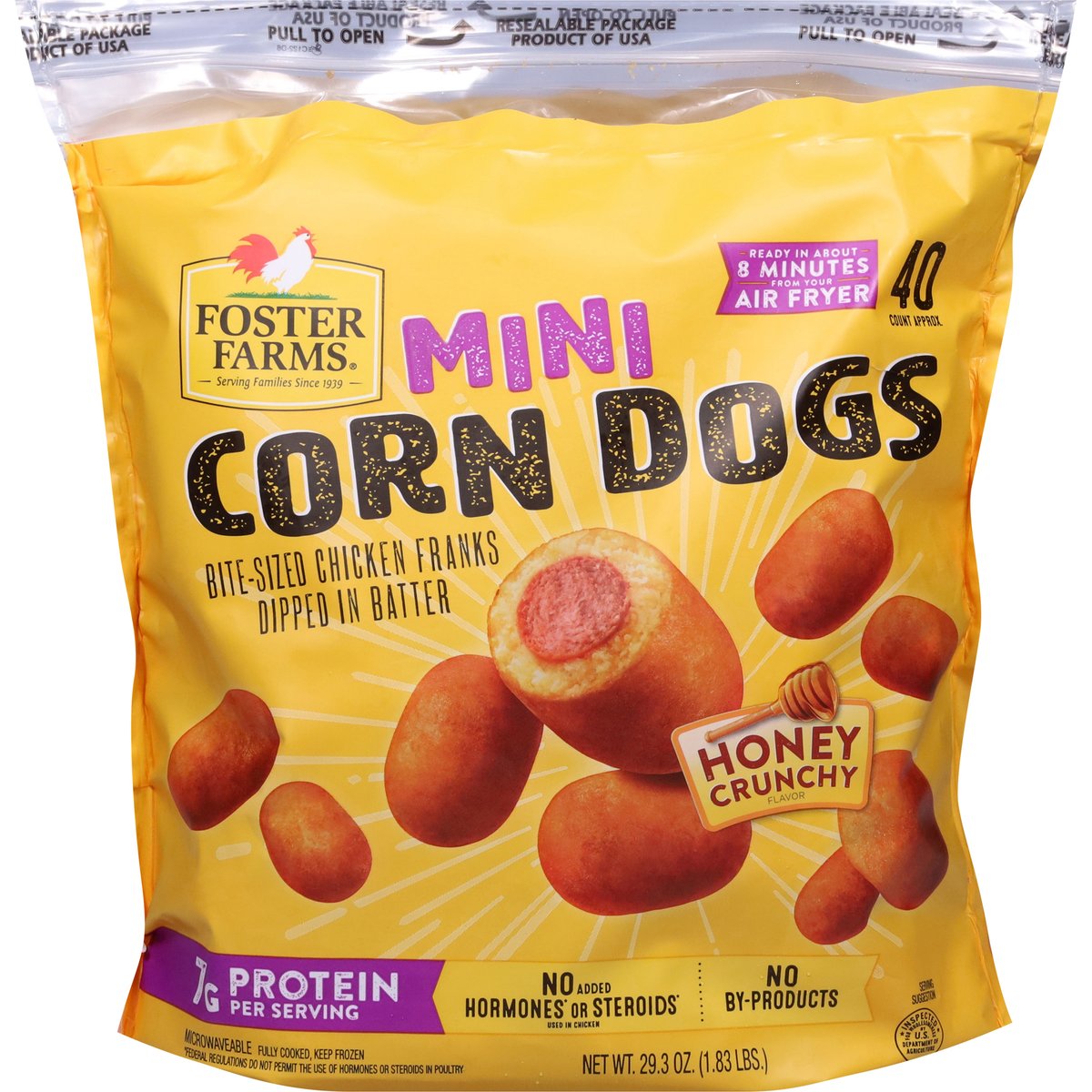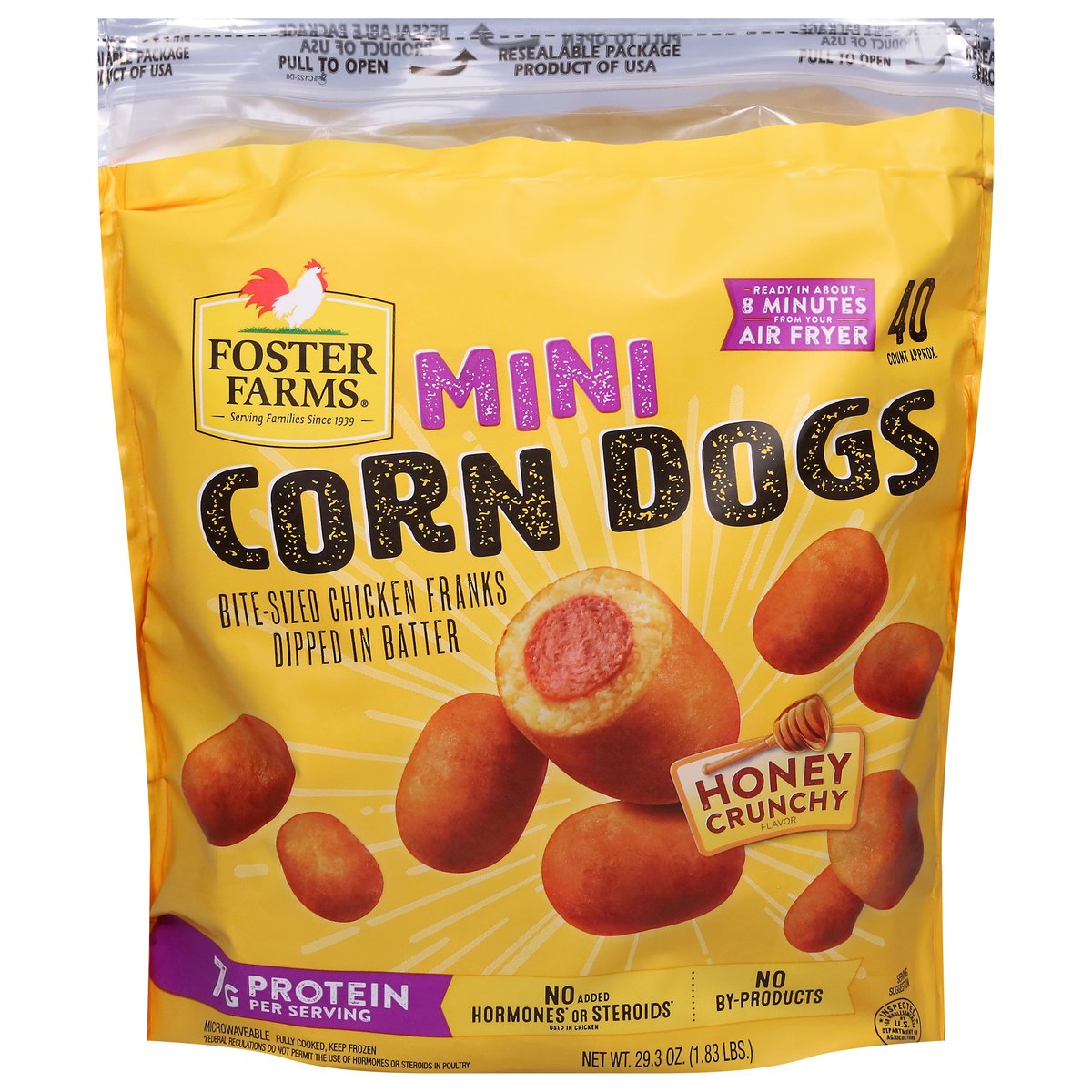 Bite-sized chicken franks dipped in batter. 7 g protein per serving. No added hormones (Federal regulations prohibit the use of hormones or steroids in chicken) or steroids (Federal regulations prohibit the use of hormones or steroids in chicken) used in chicken. Foster farms serving families since 1939. Ready in about 8 minutes from your air fryer. Microwaveable. Fully cooked. Enjoy fun and yum, all in one. Foster farms corn dogs have a mission: Share fun and yum with everyone! Made from plump, juicy hot dogs and double-dipped in our delicious honey-crunchy batter, our Corn Dogs are made from chicken raised with no added hormones (Federal regulations do not permit the use of hormones or steroids in poultry) or steroids (Federal regulations do not permit the use of hormones or steroids in poultry) and have 7 grams of protein per serving. You can feel good that it's the right choice to satisfy even the hungriest appetites. Available in a variety of flavors and sizes that are sure to please the whole family. Try them all! Better care. Better quality. Better taste. That's the Foster Farms way. This is our promise to you: If you are not satisfied with this product, we will promptly replace your purchase. Simply return this label with the reason and proof of purchase to: Foster Farms, P.O. Box 306, Livingston, CA 95334. If you have questions or comments, please call 1-800-255-7227, Monday - Friday, 8 a.m. - 5 p.m. PST. Inspected for wholesomeness by U.S. Department of Agriculture. www.fosterfarms.com. We'd love to hear from you! Find us at fosterfarms.com and follow us on: Instagram. Facebook. Tweeter (at)fosterfarms. Resealable package. At Foster Farms we are committed to agricultural practices that are in harmony with nature and the environment. For more information please visit our website at www.fosterfarms.com. Product of USA.