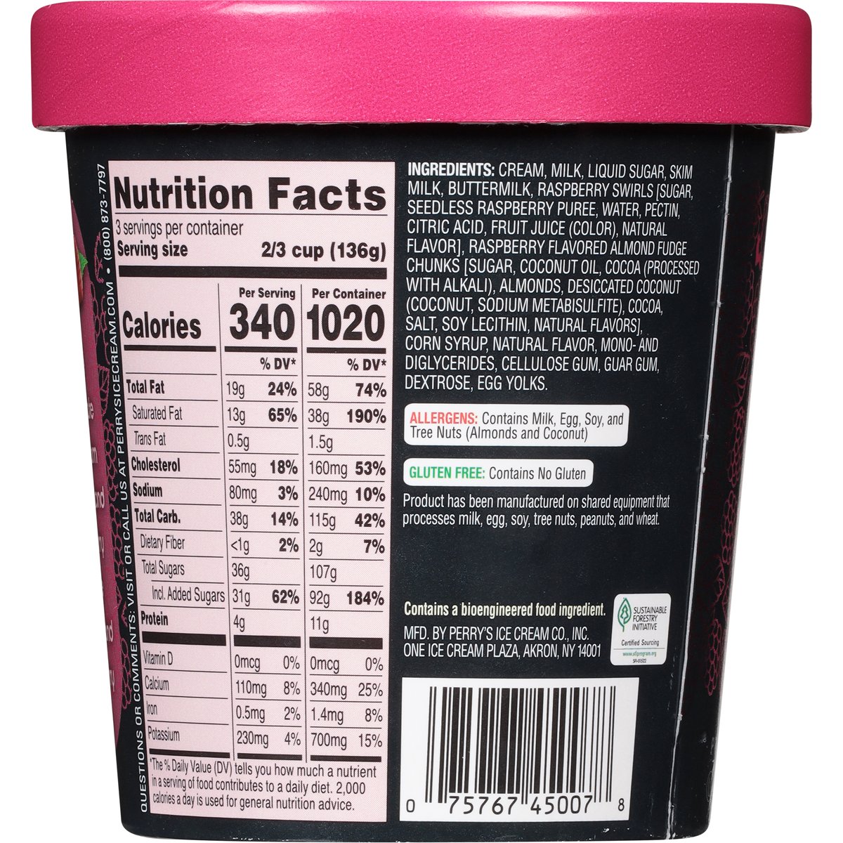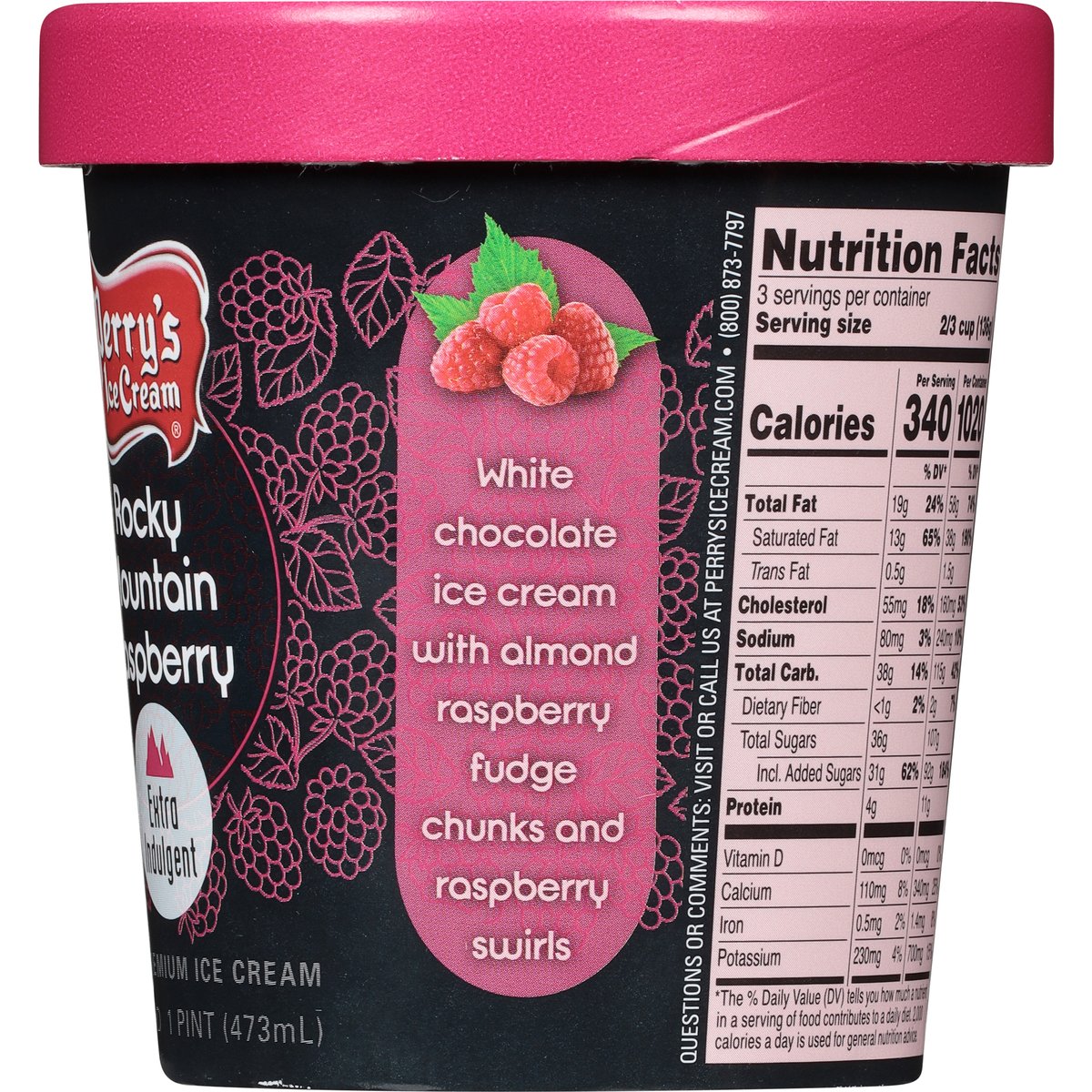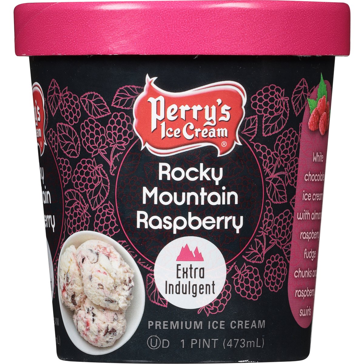 White chocolate ice cream with almond raspberry fudge chunks and raspberry swirls. Gluten Free: Contains no gluten. Contains a bioengineered food ingredient. Extra indulgent. perrysicecream.com. Questions or comments: Visit or call us at perrysicecream.com; (800) 873-7797. Sustainable Forestry Initiative Certified Sourcing. www.sfiprogram.org.