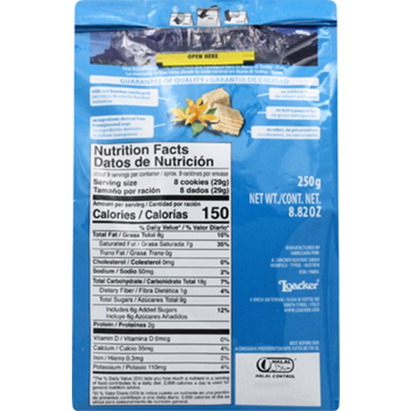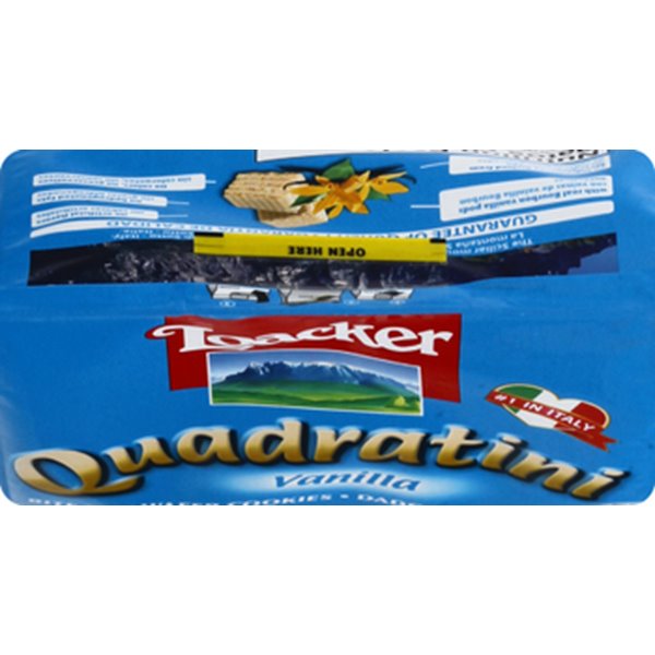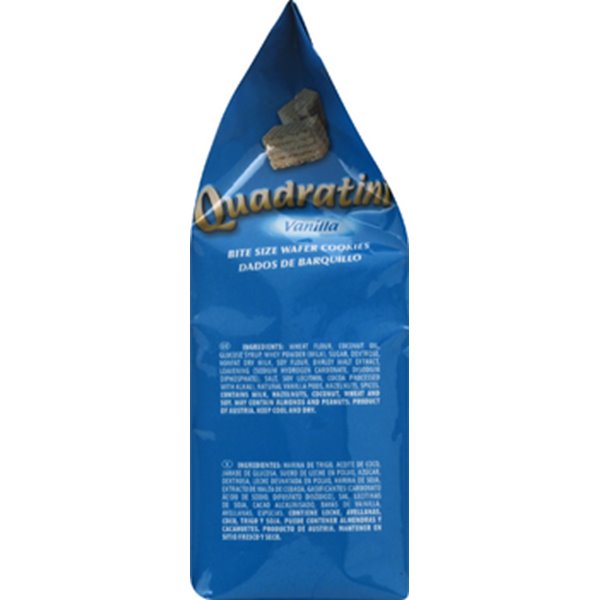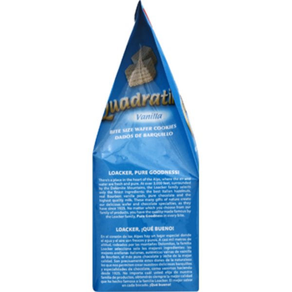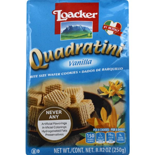Vanilla cream filled wafer cookies (74% cream filling). No. 1 in Italy. Pure goodness! There's a place in the heart of the Alps, where the air and water are fresh and pure. At over 3,000 feet, surrounded by the Dolomite Mountains, the Loacker family selects only the finest ingredients: the best Italian hazelnuts, real Bourbon vanilla pods, pure chocolate and the highest quality milk. These many gifts of nature create our delicious wafer and chocolate specialties, as they have since 1925. No matter which you choose from our family of products, you have the quality made famous by the Loacker family, Pure Goodness in every bite. Guarantee of Quality: No artificial flavours; No artificial colorants; No ingredients derived from bioengineered crops; Real bourbon vanilla pods used for the cream filling; No preservatives; No hydrogenated fats. Bite the crispy wafer, taste the delicious cream filling and enjoy! You will certainly want more than one. The handy, resealable bag allows you to have as many or as few tasty bites as you wish! Loacker, the difference is in the taste. Loacker Quadratini Bite Size Wafer Cookies are Available in Various Flavors: Dark chocolate; Chocolate; Hazelnut; Vanilla; Coconut; Cappuccino; Tiramisu; Almond; Lemon; Blackcurrant; Espresso. No colourings and no preservatives. Dispose of properly. www.loacker.it. Product of Austria.