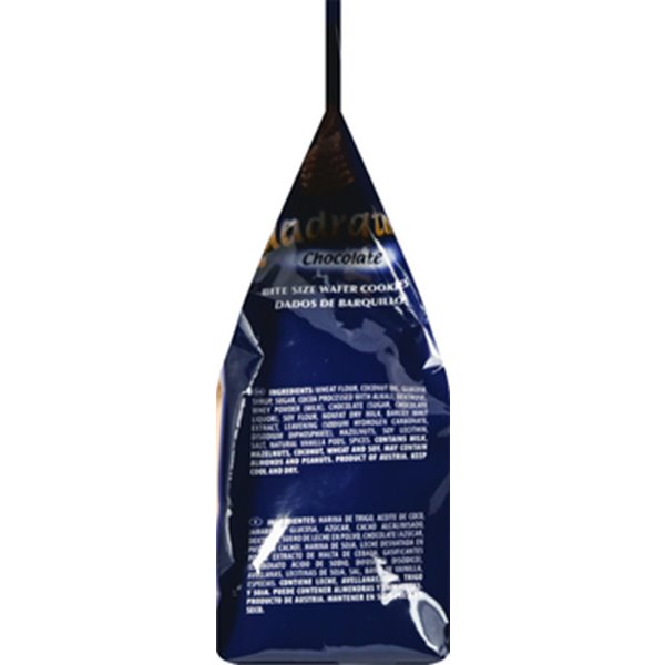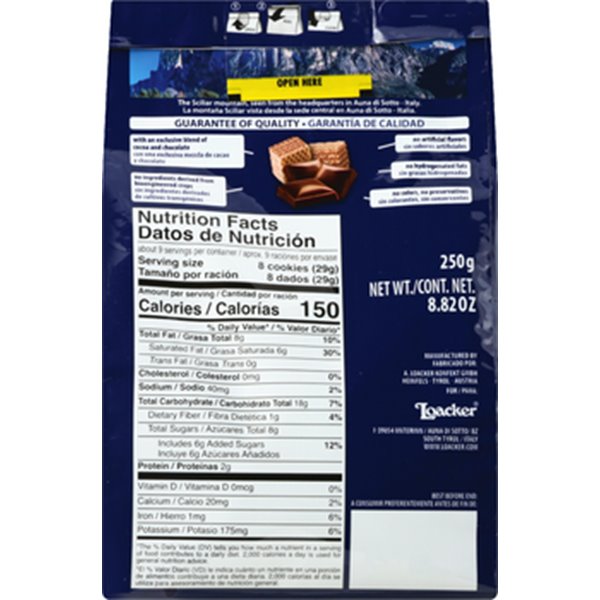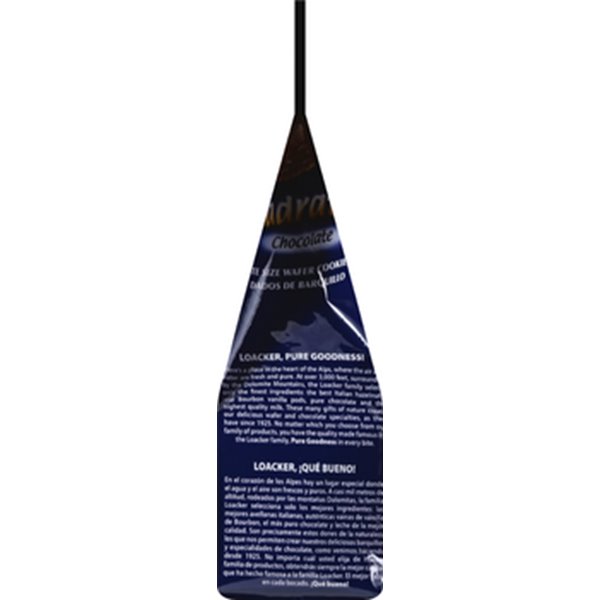 Chocolate cream filled wafer cookies (74% cream filling). No. 1 in Italy. Pure goodness! There's a place in the heart of the Alps, where the air and water are fresh and pure. At over 3,000 feet, surrounded by the Dolomite Mountains, the Loacker family selects only the finest ingredients: the best Italian hazelnuts, real Bourbon vanilla pods, pure chocolate and the highest quality milk. These many gifts of nature create our delicious wafer and chocolate specialties, as they have since 1925. No matter which you choose from our family of products, you have the quality made famous by the Loacker family, Pure goodness in every bite. Guarantee of Quality: no artificial flavours; no artificial colorants; no ingredients derived from bioengineered crops; an exclusive blend of cocoa and chocolate; no preservatives; no hydrogenated fats. Bite the crispy wafer, taste the delicious cream filling and enjoy! You will certainly want more than one. Dispose of properly. The handy, resealable bag allows you to have as many or as few tasty bites as you wish! Loacker, the difference is in the taste. Loacker Quadratini Bite Size Wafer Cookies are available in various flavors: Dark Chocolate; Chocolate; Hazelnut Vanilla; Coconut; Cappuccino; Tiramisu Almond; Lemon; Blackcurrant; Espresso. www.loacker.it. No colourings and no preservatives. Product of Austria.