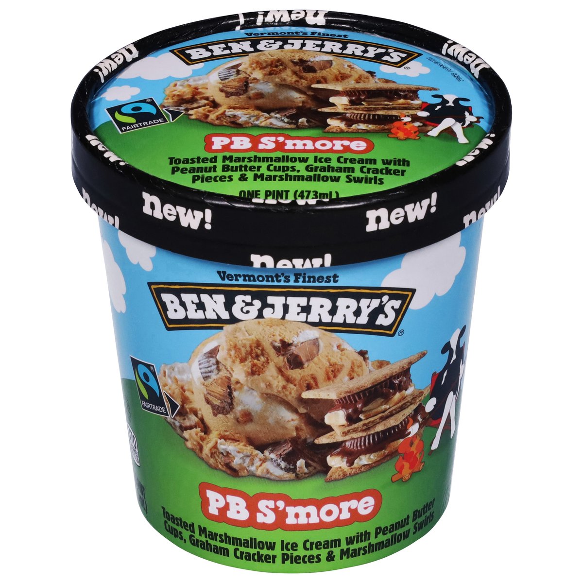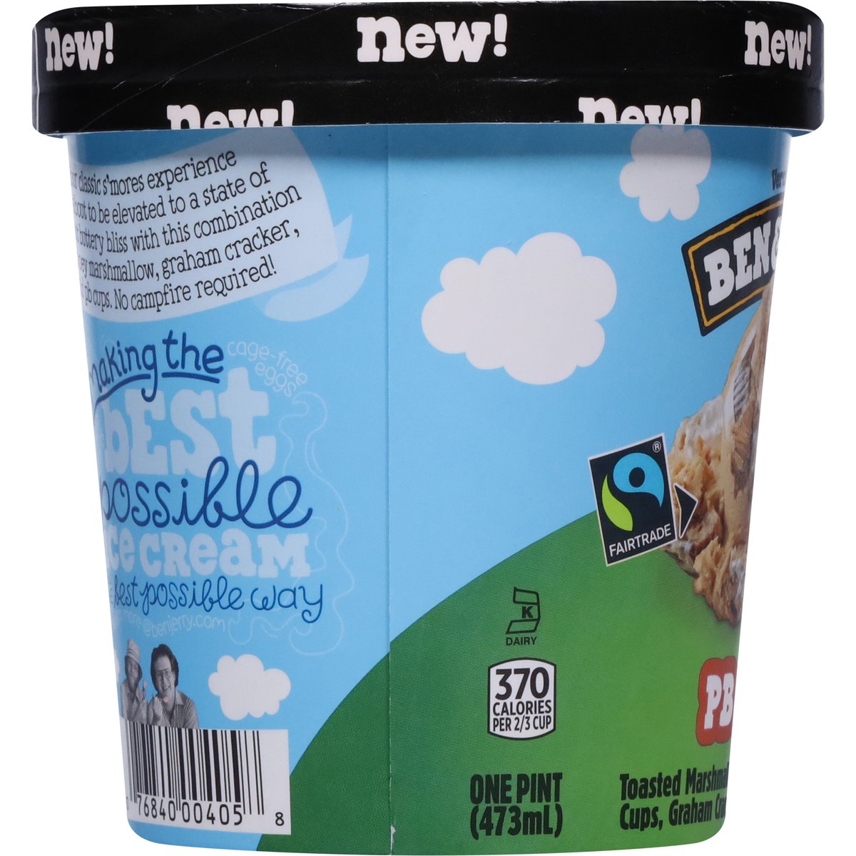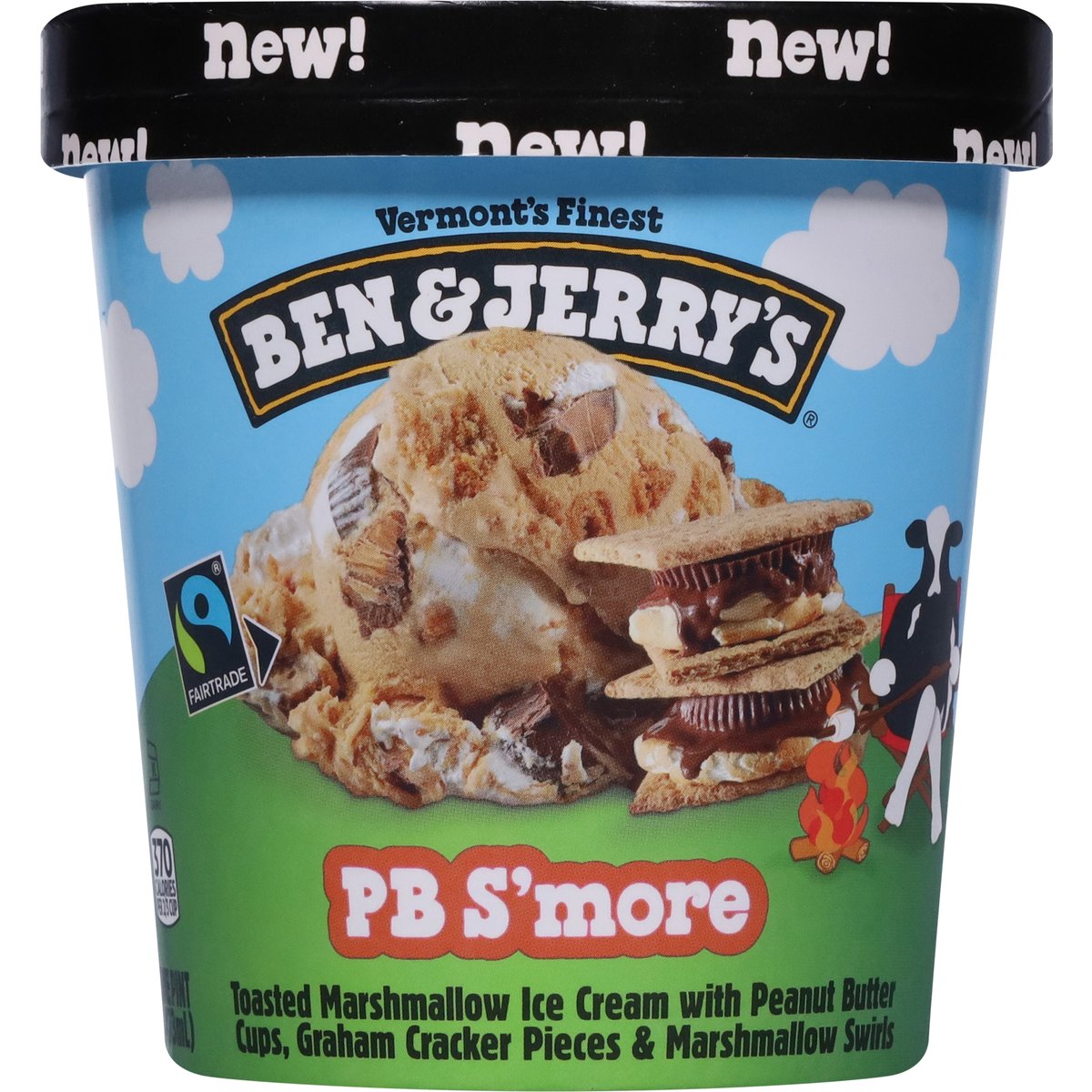 Toasted marshmallow ice cream with peanut butter cups, graham cracker pieces & marshmallow swirls. 370 Calories per 2/3 cup. New! Vermont's finest. Your classic s'mores experience is about to be elevated to a state of peanut buttery bliss with this combination of gooey marshmallow, graham cracker, and pb cups. No campfire required! Make the best possible ice cream in the best possible way. Your satisfaction guaranteed. benjerry.com. how2recycle.info. Get in touch with us: benjerry.com/contact-us. Learn more (at)benjerry.com. Certified Fair Trade by FLOCert (Cocoa, sugar & vanilla: mass balance is used to match Fairtrade sourcing, total 48% excluding water & dairy. info.fairtrade.net/sourcing). FSC: Mix packaging. Fairtrade ingredients.