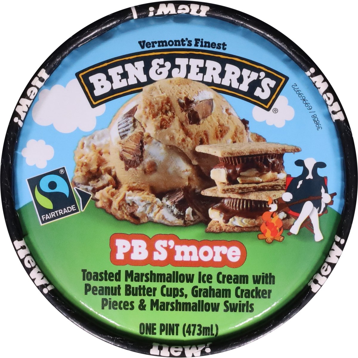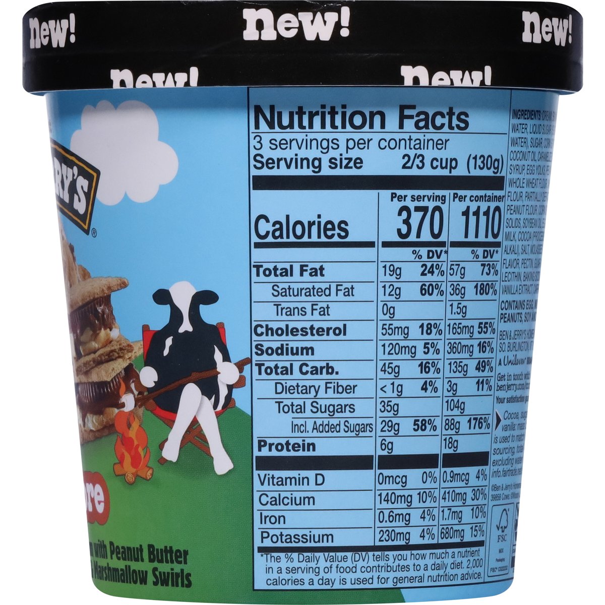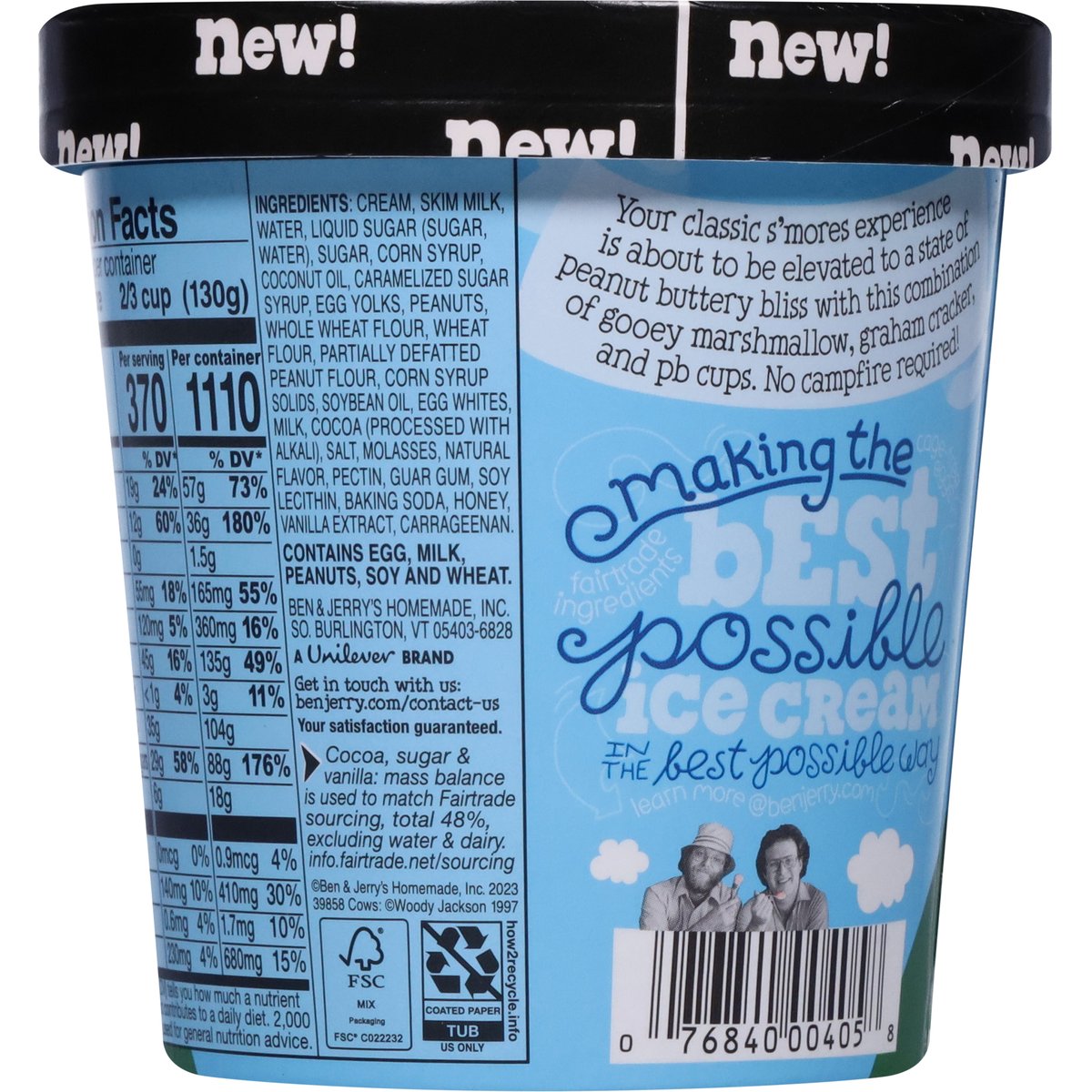 Toasted marshmallow ice cream with peanut butter cups, graham cracker pieces & marshmallow swirls. 370 Calories per 2/3 cup. New! Vermont's finest. Your classic s'mores experience is about to be elevated to a state of peanut buttery bliss with this combination of gooey marshmallow, graham cracker, and pb cups. No campfire required! Make the best possible ice cream in the best possible way. Your satisfaction guaranteed. benjerry.com. how2recycle.info. Get in touch with us: benjerry.com/contact-us. Learn more (at)benjerry.com. Certified Fair Trade by FLOCert (Cocoa, sugar & vanilla: mass balance is used to match Fairtrade sourcing, total 48% excluding water & dairy. info.fairtrade.net/sourcing). FSC: Mix packaging. Fairtrade ingredients.