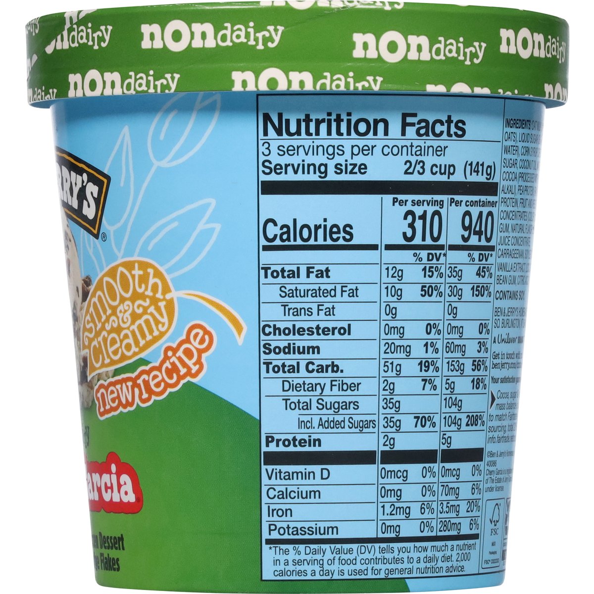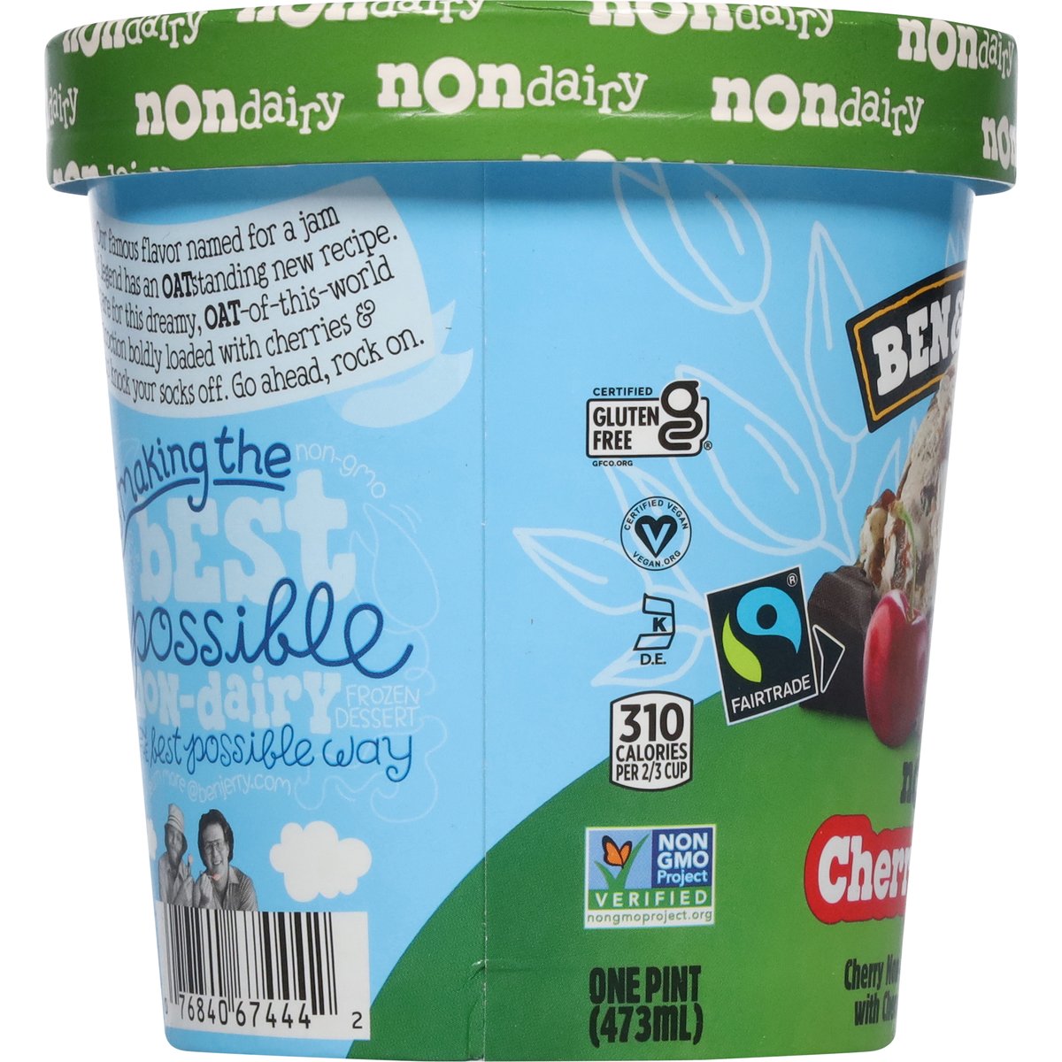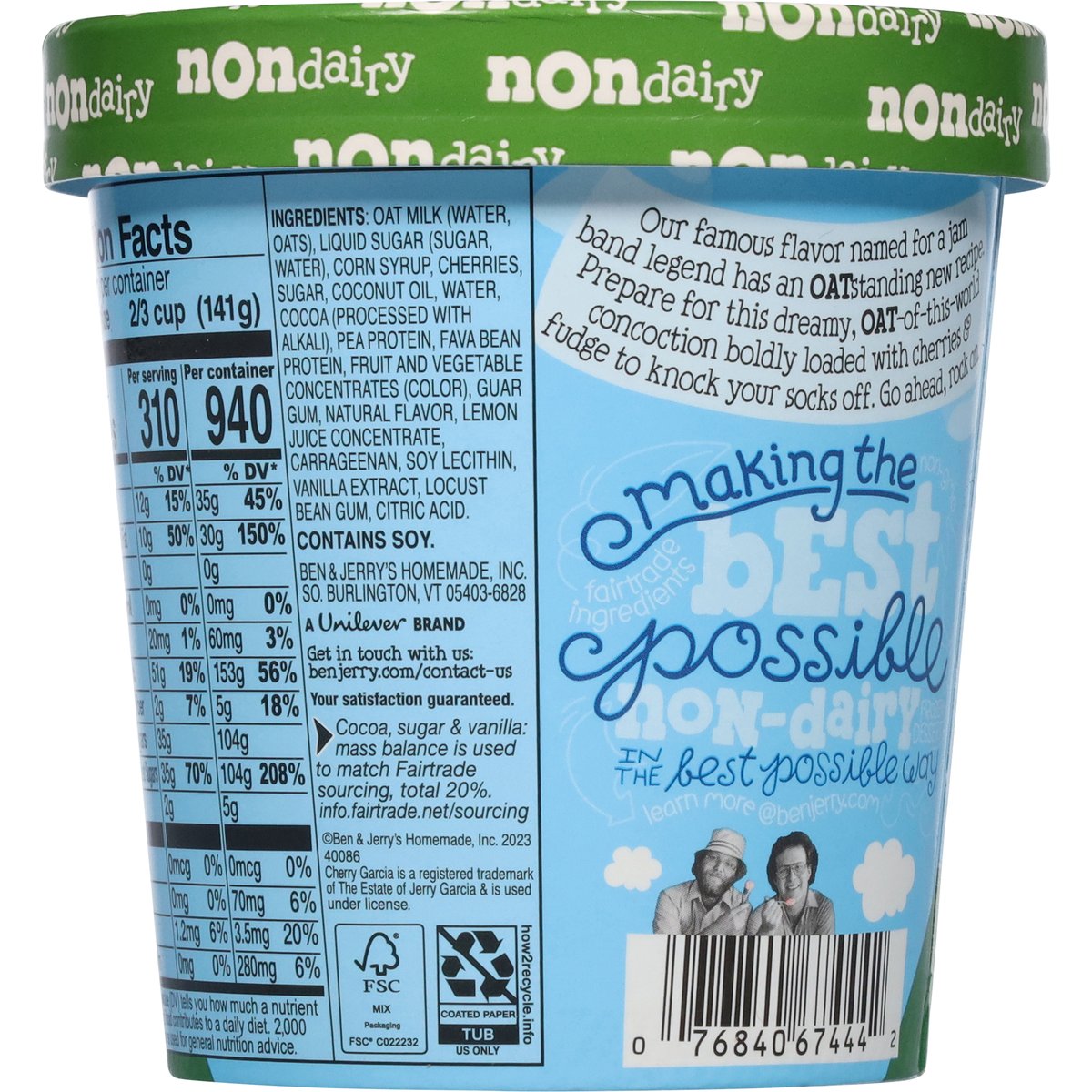 Cherry non-dairy frozen dessert with cherries & fudge flakes. 310 calories per 2/3 cup. Certified vegan. vegan.org. Certified gluten free. gfco.org. Non-dairy. Non-GMO Project verified. nongmoproject.org. Our famous flavor named for a jam band legend lives on in this non-dairy cherry creation, made with dreamy almond milk & boldly loaded with cherries & fudge go ahead, rock on. We strive to make the best possible non-dairy frozen dessert in the best possible way. We source non-GMO ingredients, & our cocoa, sugar, vanilla & a portion of our almonds are Fairtrade. Smooth & creamy. New recipe. Our famous flavor named for a jam band legend has an oatstanding new recipe. Prepare for this dreamy, oat-of-this-world concoction boldly loaded with cherries & fudge to knowck your socks off. Go ahead, rock on. Making the best possible non-dairy frozen dessert in the best possible way. A Unilever brand. Your satisfaction is guaranteed. www.benjerry.com. Learn more at benjerry.com. Get in touch with us: benjerry.com/contact-us. Fair Trade: Cocoa, sugar & vanilla: mass balance is used to match Fairtrade sourcing, total 20%. info.fairtrade.net/sourcing. Fairtrade ingredients. FSC: Mix - Packaging.