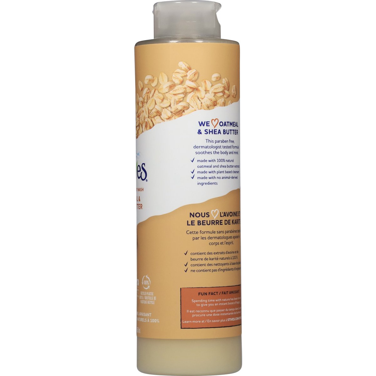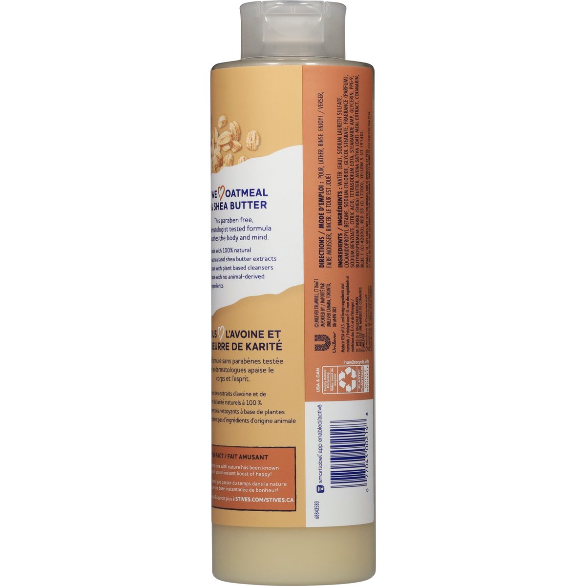 Made with 100% natural extracts. Plant based cleansers. We love oatmeal & shea butter. This paraben free. Dermatologist tested formula soothes the body and mind. Made with 100% natural oatmeal and shea butter extracts. Made with plant based cleansers. Made with no animal-derived ingredients. Fun Fact: Spending time with nature has been known to give you an instant boost of happy. stives.com. how2recycle.info. SmartLabel app enabled. Questions & Comments? USA: 1-866-912-9867. Learn more at stives.com/stives.ca. PETA: Approved global animal test policy. 100% Recycled plastic bottle. Globally St Ives does not test on animal and is approved by peta. Made in USA of US and foreign ingredients and materials.