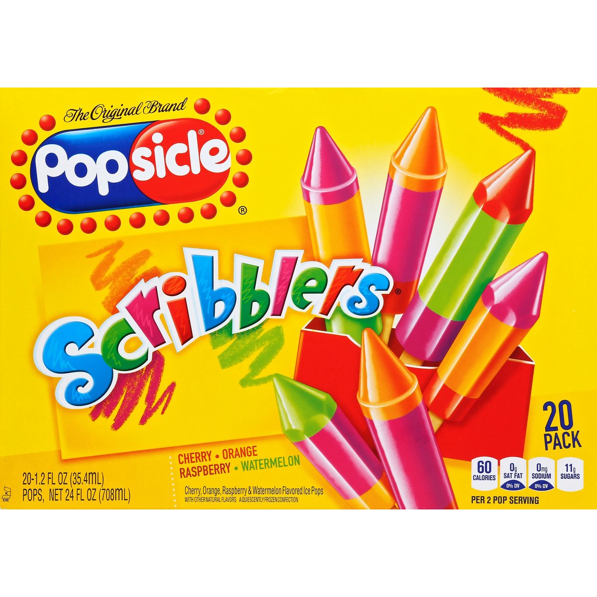 Cherry, orange, raspberry & watermelon flavored ice pops. With other natural flavors. A quiescently frozen confection. Cherry. Orange. Raspberry. Watermelon. Per 2 Pop Serving: 60 calories; 0 g sat fat (0% DV); 0 mg sodium (0% DV); 11 g sugars. The original brand. Toll Free: 1-800-931-2849. www.popsicle.com. Recyclable. Question or comments? Call: 800-931-2849 or visit us online at popsicle.com.