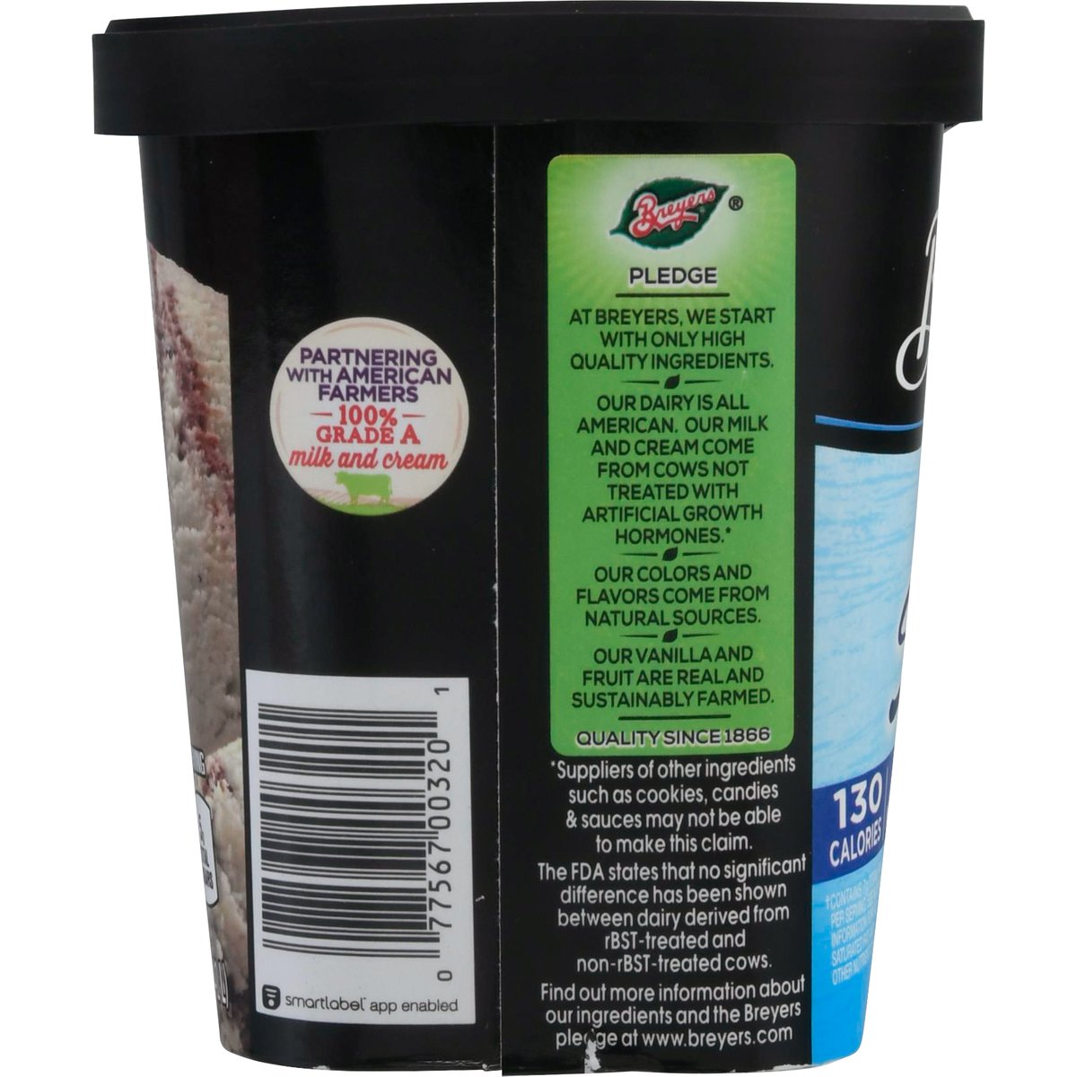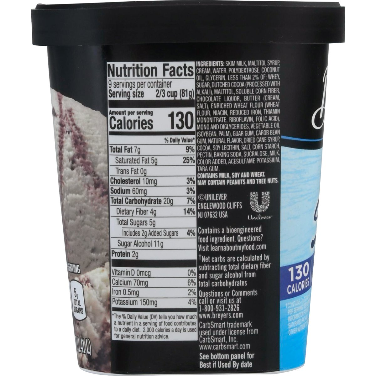 Mint flavored with fudge swirl and chocholatey crunchies. Per 2/3 Cup Serving (Contains 7g total fat per serving. See nutrition information for fat, saturated fat, and other nutrient content) (Net Carbs are calculated by subtracting total dietary fiber and sugar alcohol from total carbohydrates): 130 calories; 5 g sat fat (25% DV); 60 mg sodium (3% DV); 5 g total sugars. Contains a bioengineered food ingredient. Breyers Pledge: At Breyers, we start with only high quality ingredients. Our dairy is all American. Our milk and cream come from cows not treated with artificial growth hormones (Suppliers of other ingredients such as cookies, candies & sauces may not be able to make this claim. The FDA states that no significant difference has been shown between dairy derived from rBST-treated and non-rBST-treated cows). Our colors and flavors come from natural sources. Our vanilla and fruit are real and sustainably farmed. Quality since 1866. Partnering with American farmers 100% Grade A milk and cream. www.breyers.com. learnaboutmyfood.com. Find out more information about our ingredients and the Breyers pledge at www.breyers.com. Questions? Visit learnaboutmyfood.com. Questions or Comments? call or visit us at 1-800-931-2826. www.breyers.com.
