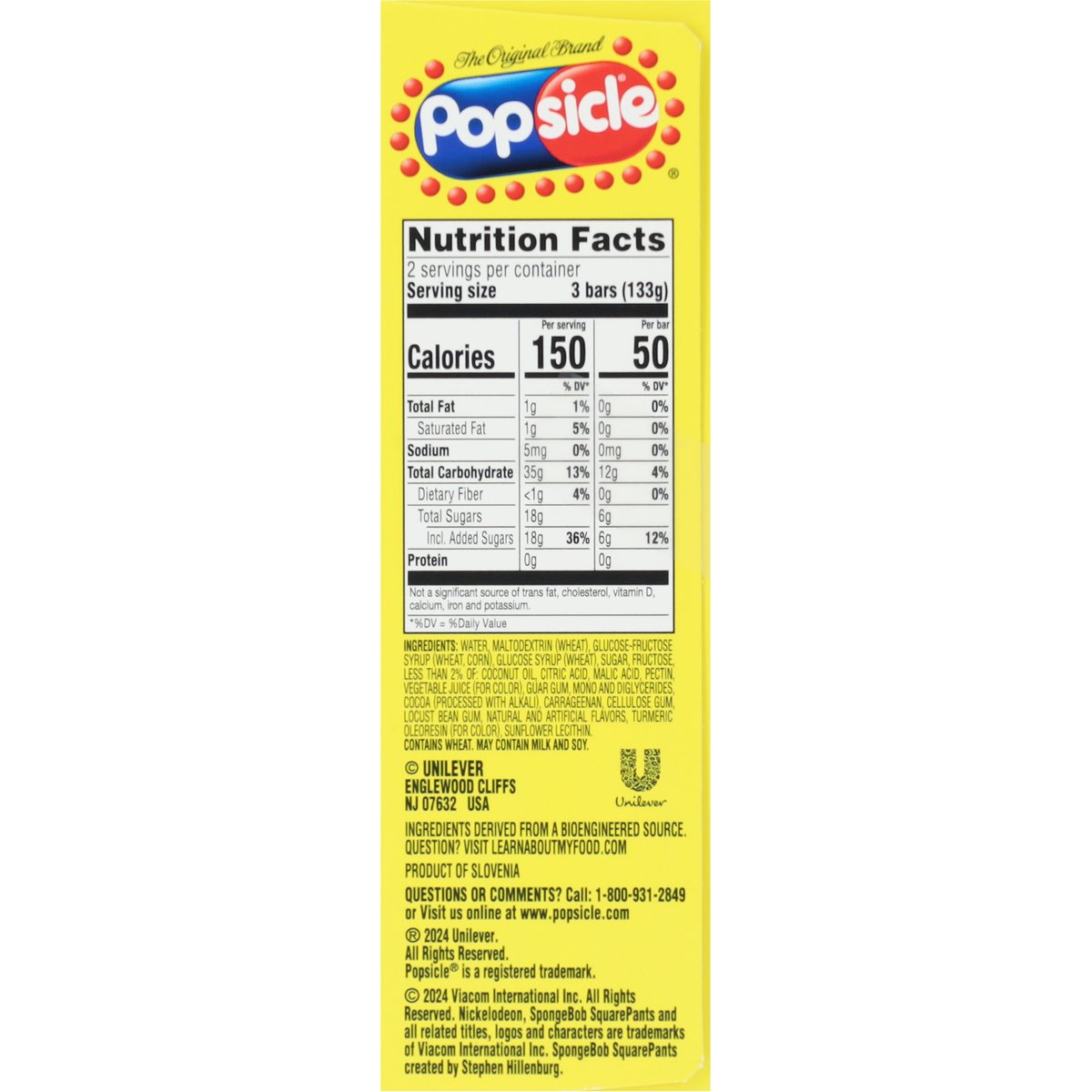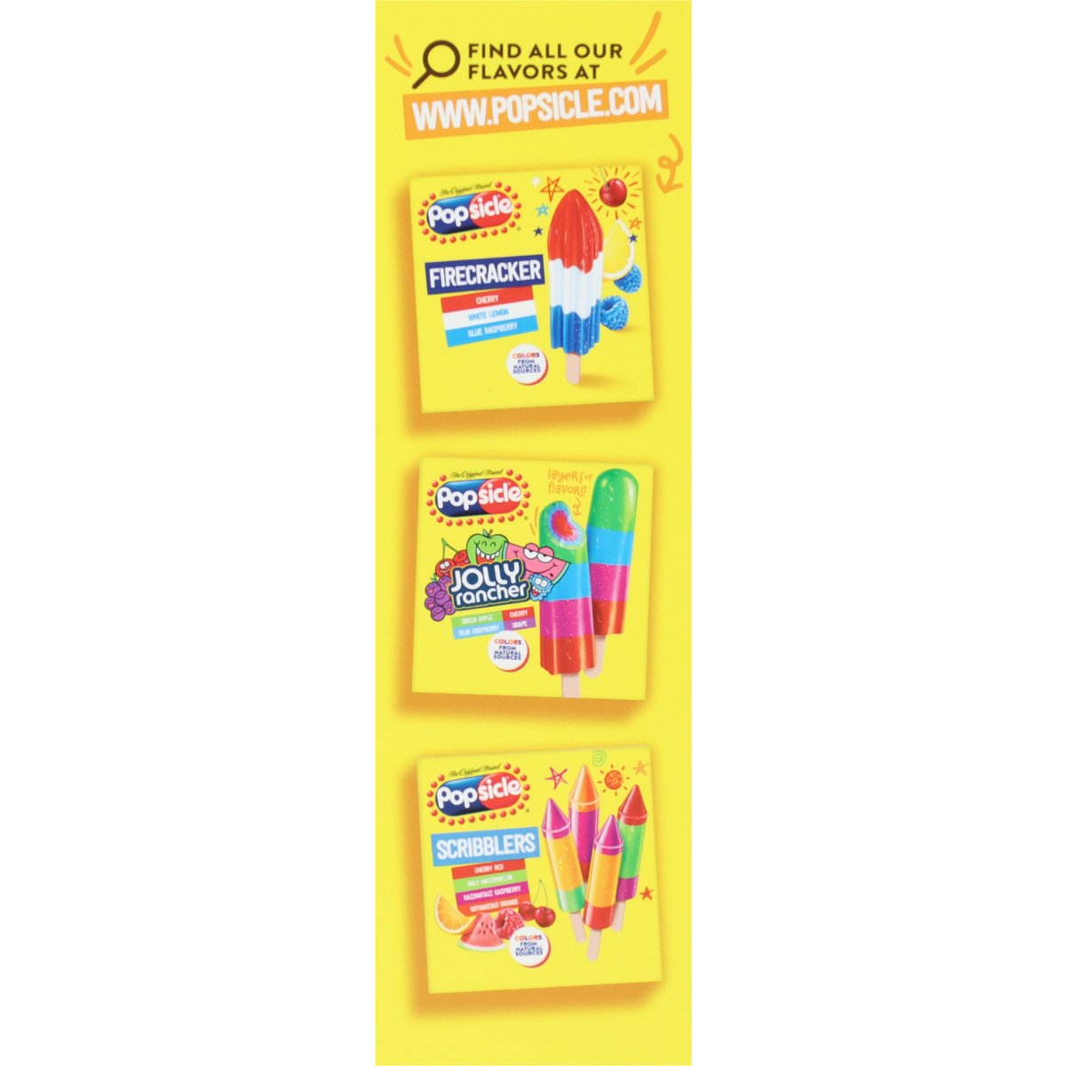 Fruit punch & cotton candy. Naturally and artificially flavored. Per Bar: 50 calories; 0 g sat fat (0% DV); 0 mg sodium (0% DV); 6 g added sugars (12% DV). Ingredients derived from a bioengineered source. Question? Visit learnaboutmyfood.com. The Original Brand. Color from natural sources. Inner units not labeled for retail sale. www.popsicle.com. learnaboutmyfood.com. how2recycle.info. QR made accessibility ready. Questions or comments? Call: 1-800-931-2849 or visit us online at www.popsicle.com. Find all our flavors at www.popsicle.com. Popsicle Firecracker cherry, white lemon, blue raspberry. Popsicle: Orange, cherry, grape. Popsicle Scribblers cherry red, wild watermelon, razzmatazz raspberry, outrageous orange. Product of Slovenia.