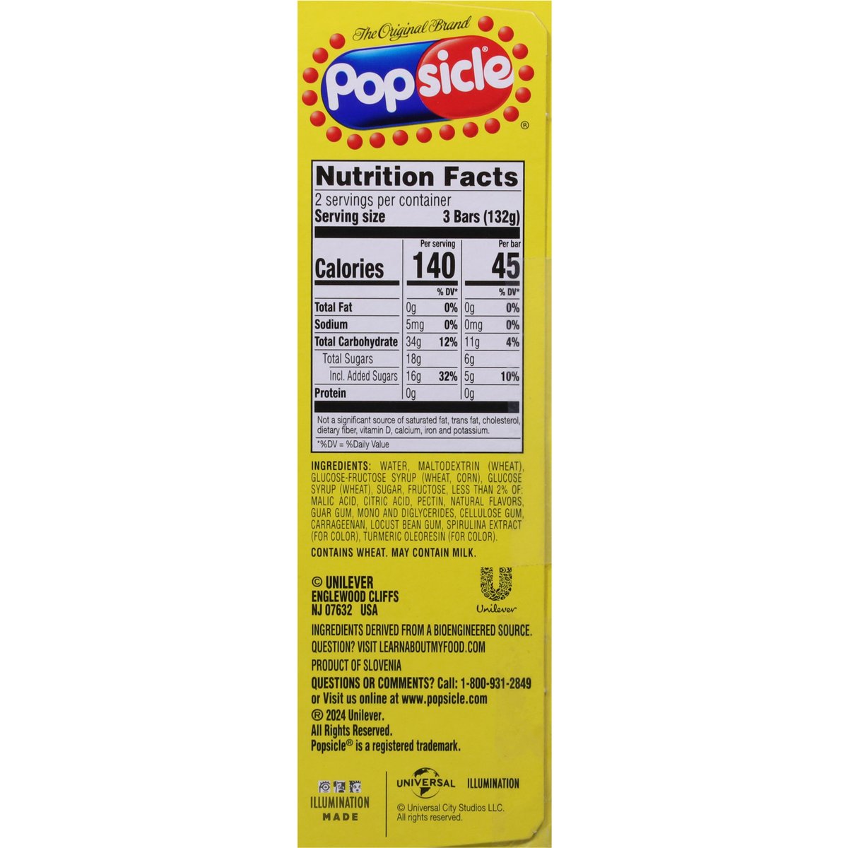 Strawberry banana. Blue raspberry. Natural flavor with other natural flavor. Per Bar: 45 calories; 0 g sat fat (0% DV); 0 mg sodium (0% DV); 5 g added sugars (10% DV). Ingredients derived from a bioengineered source. Question? Visit learnaboutmyfood.com. Colors from natural sources. The original brand. Illumination presents minions. Illumination made. Inner units not labeled for retail sale. www.popsicle.com. how2recycle.info. QR made accessibility ready. Questions or comments? Call: 1-800-931-2849 or visit us online at www.popsicle.com. Find all our flavors at www.popsicle.com. Popsicle Firecracker cherry, white lemon, blue raspberry; Popsicle Jolly rancher green apple, cherry, blue raspberry, grape; Popsicle Scribblers cherry red, wild watermelon, razzmatazz raspberry, outrageous orange. Product of Slovenia.