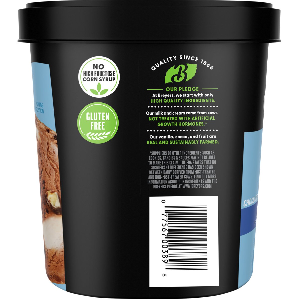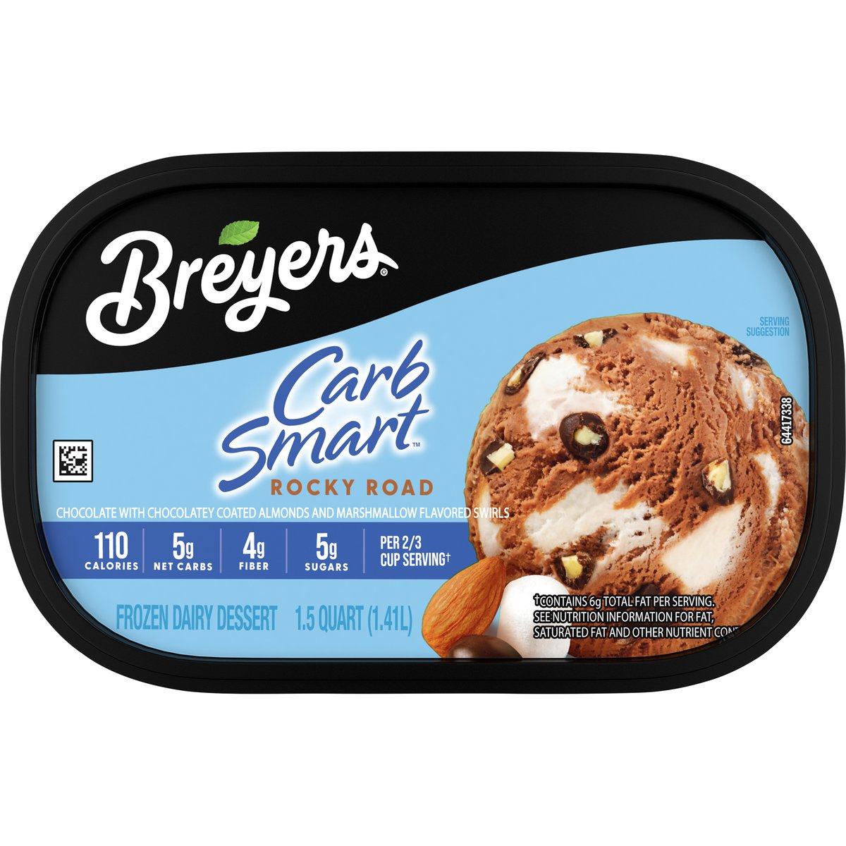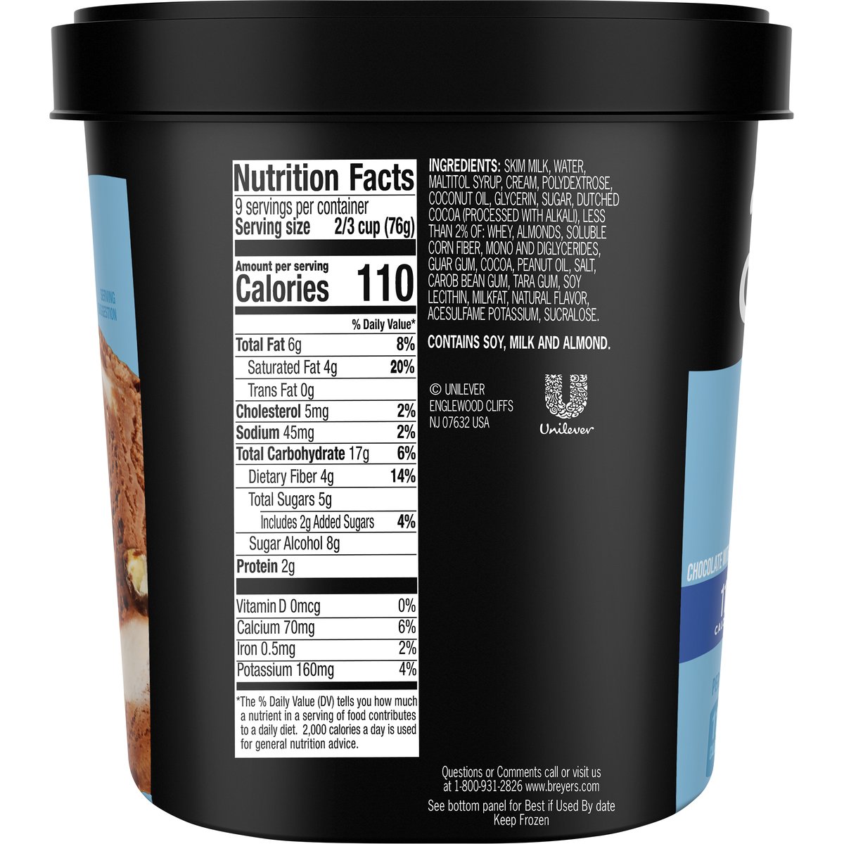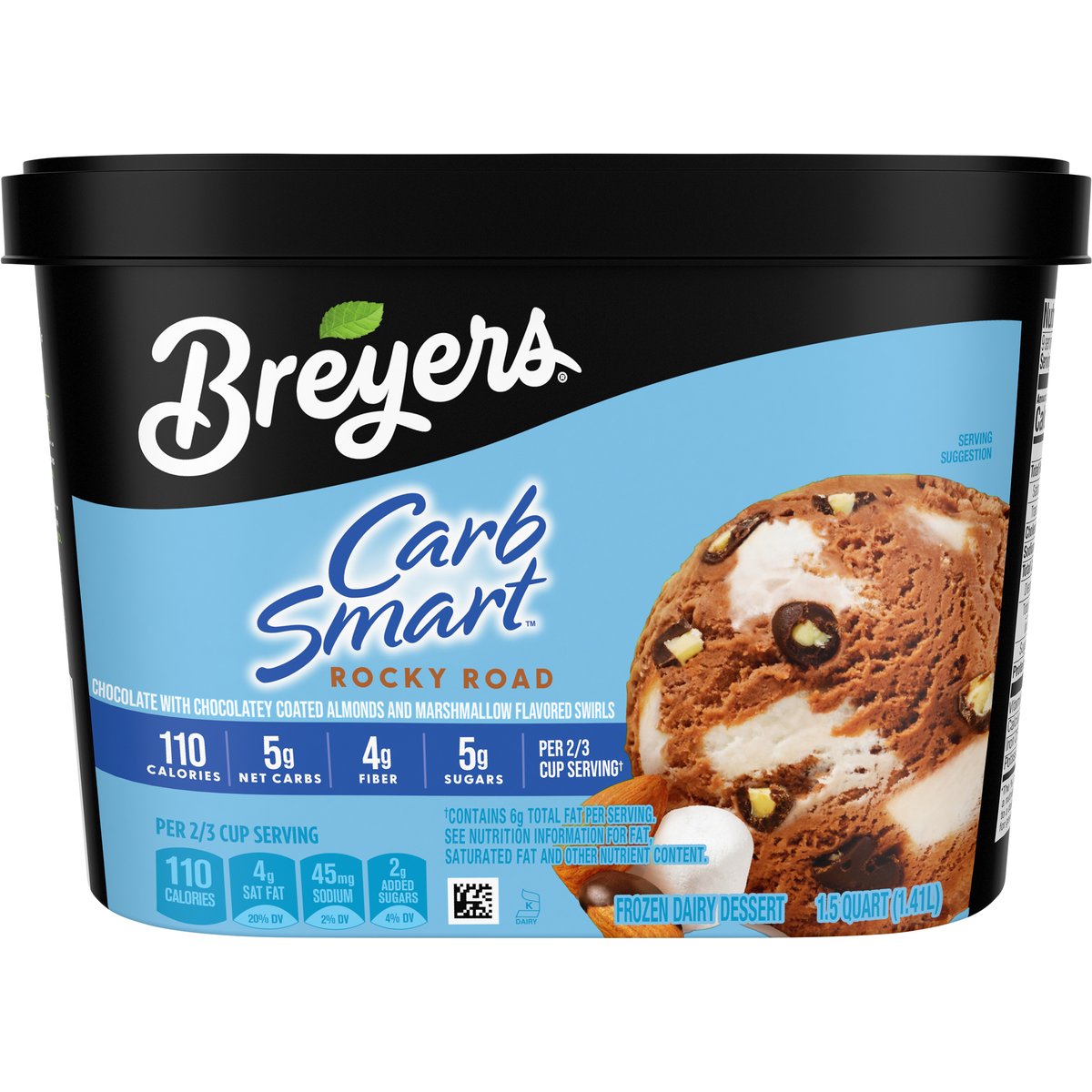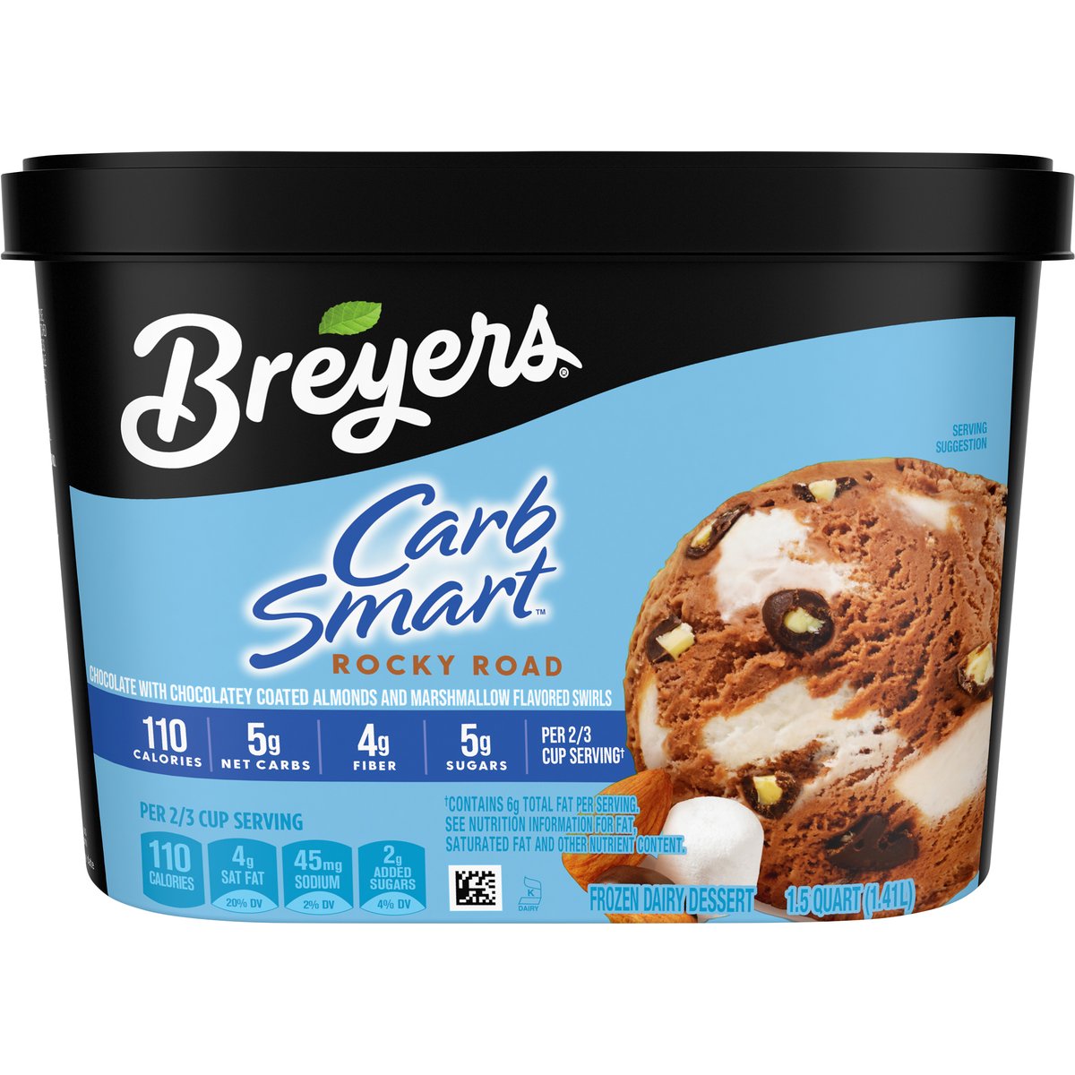 Chocolate with chocolatey coated almonds and marshmallow flavored swirls. Per 2/3 cup serving (a): 110 calories. 5 g net carbs. 4 g fiber. 5 g sugars. Per 2/3 Cup Serving: 110 calories; 4 g sat fat (20% DV); 45 mg sodium (2% DV); 2 g added sugars (4% DV). (a) Contains 6 g total fat per serving. Gluten free. See nutrition information for fat, saturated fat and other nutrient content. No high fructose corn syrup. Quality since 1866. Our Pledge: At Breyers, we start with only high quality ingredients. Our milk and cream come from cows. Not treated with artificial growth hormones*. Our vanilla, cocoa, and fruit are real and sustainably farmed. * Suppliers of other ingredients such as cookies, candies & sauces may not be able to make this claim. The FDA states that no significant difference has been shown between dairy derived from rBST-treated and non-rBST-treated cows. Find out more information about our ingredients and the Breyers pledge at www.breyers.com. www.breyers.com. Find our more information about our ingredients and the Breyers pledge at www.breyers.com. Questions or comments call or visit us at 1-800-931-2826; www.breyers.com. Our vanilla, cocoa, and fruit are real and sustainably farmed.