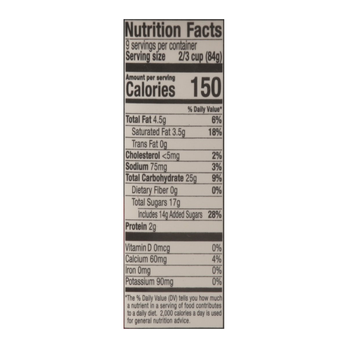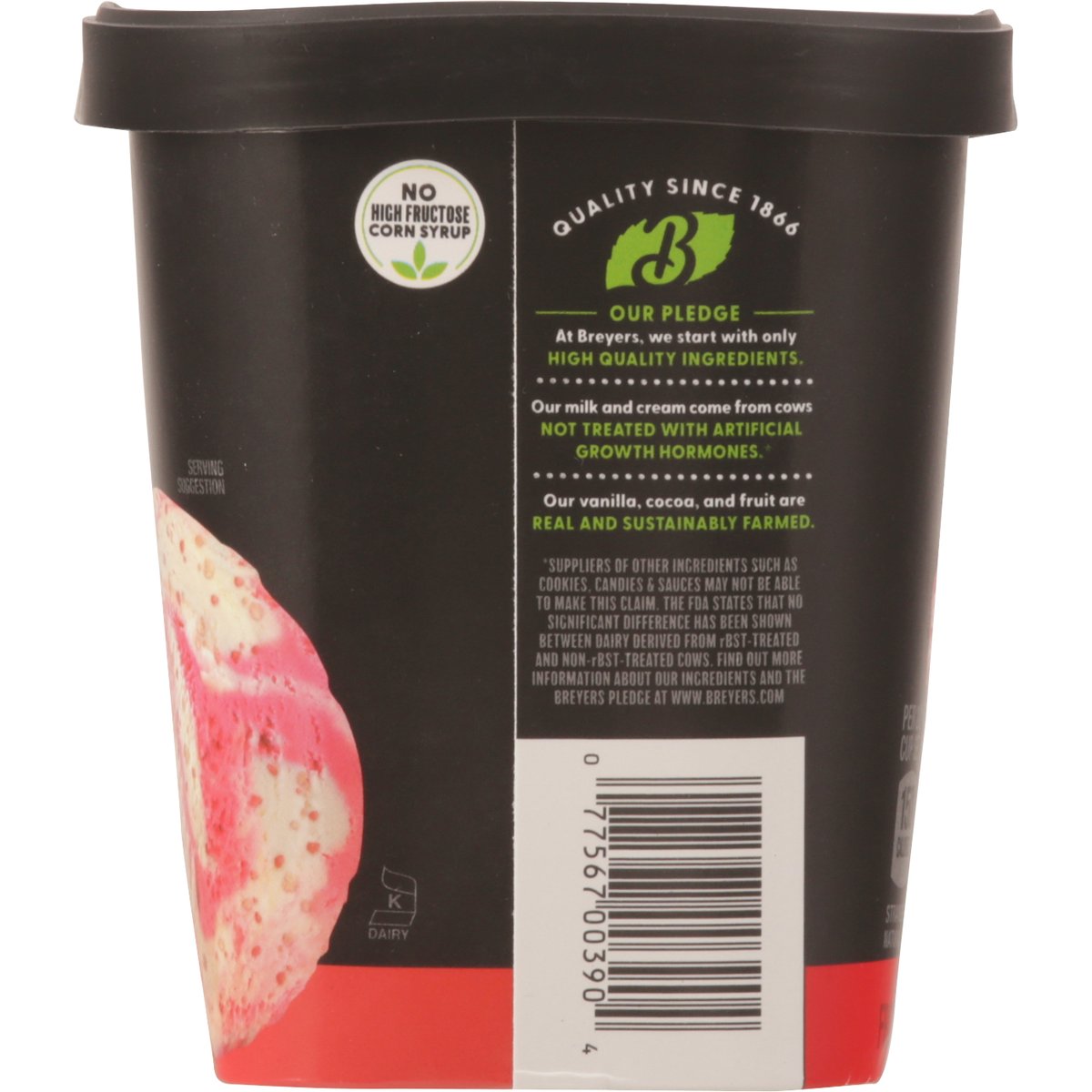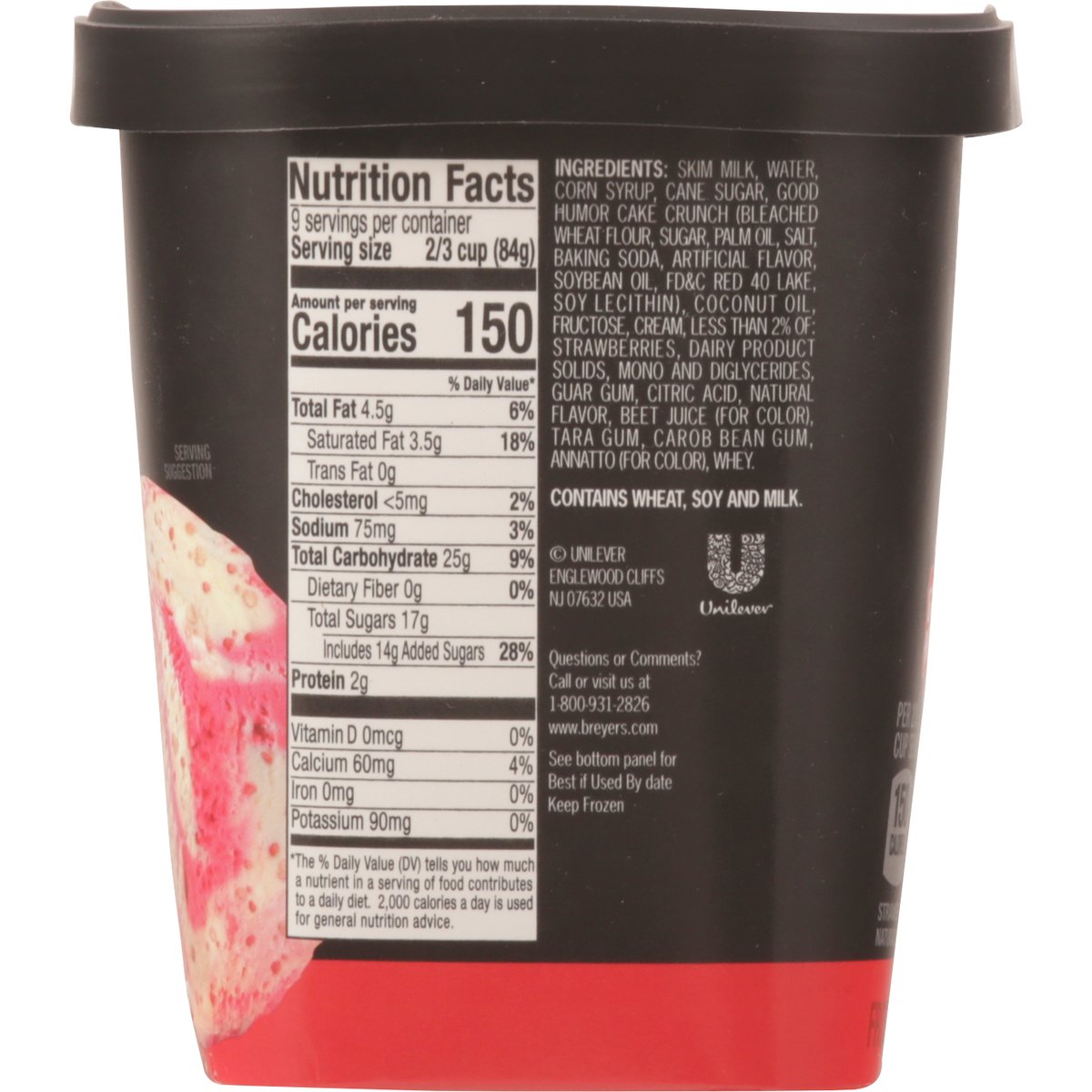 Strawberry shortcake flavored with cake crunch pieces. Naturally and artificially flavored. Per 2/3 Cup Serving: 150 calories; 3.5 g sat fat (18% DV); 75 mg sodium (3% DV); 14 g added sugars (28% DV). No high fructose corn syrup. Quality since 1866. Our Pledge: At Breyers, we start with only high quality ingredients. Our milk and cream come from cows not treated with artificial growth hormones*. *Suppliers of other ingredients such as cookies, candies & sauces may not be able to make this claim. The FDA states that no significant difference has been shown between dairy derived from rBST-treated and non-rBST-treated cows. Find out more information about our ingredients and the Breyers pledge at www.breyers.com. www.breyers.com. Questions or Comments? Call or visit us at 1-800-931-2826 www.breyers.com.