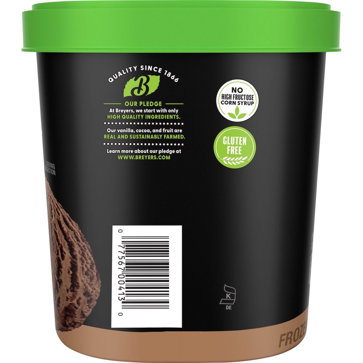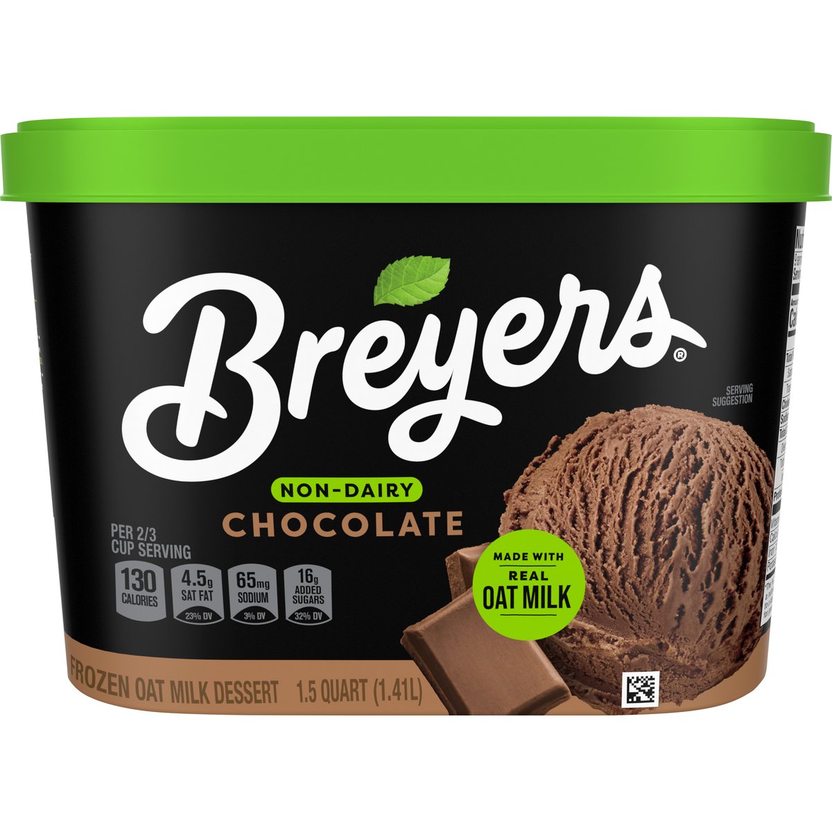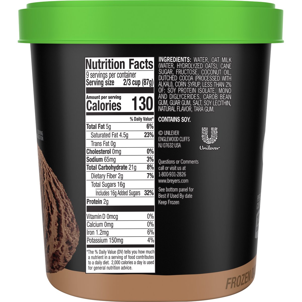 Frozen oat milk dessert. Per 2/3 Cup Serving: 130 calories; 4.5 g sat fat (23% DV); 65 mg sodium (3% DV); 16 g added sugars (32% DV). Gluten free. Non-dairy. Quality since 1866. Our Pledge: At Breyers, we start with only high quality ingredients. Our vanilla, cocoa, and fruit are real and sustainably farmed. No high fructose corn syrup. www.breyers.com. Learn more about our pledge at www.breyers.com. Questions or comments call or visit us at 1-800-931-2826. www.breyers.com. Our vanilla, cocoa, and fruit are real and sustainably farmed.