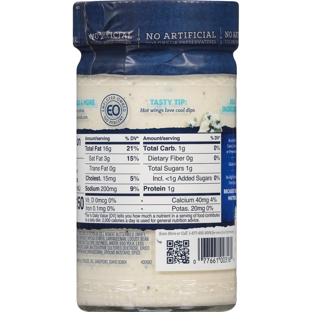 No artificial colors, flavors or preservatives. Gluten free. No artificial colors or preservatives. 100 percent employee owned. No high fructose corn syrup. Because taste matters. Dip, spread & more. Customer satisfaction guaranteed by: Lighthouse, Inc. Sandpoint, Idaho 83864. litehousefoods.com. Scan here or call 1-877-695-9006 for more food information. Endless options at litehousefoods.com.